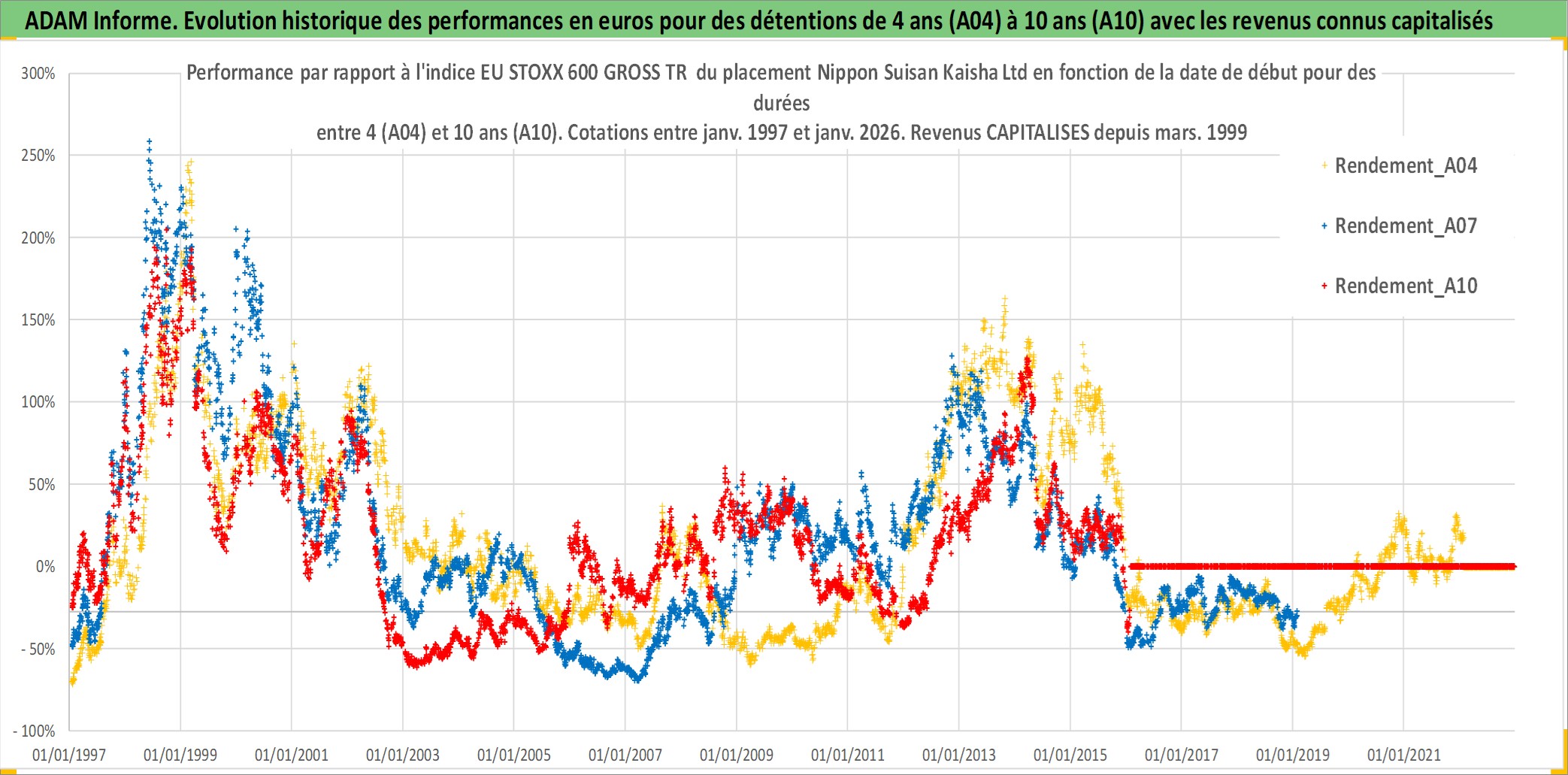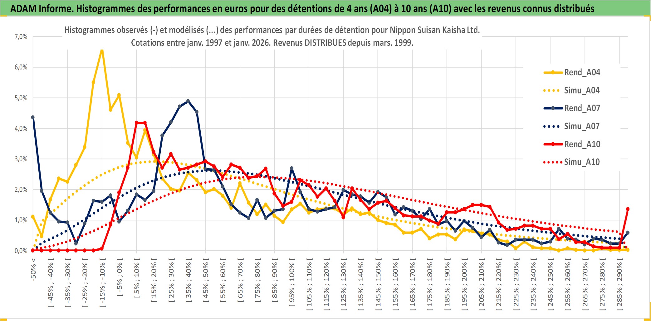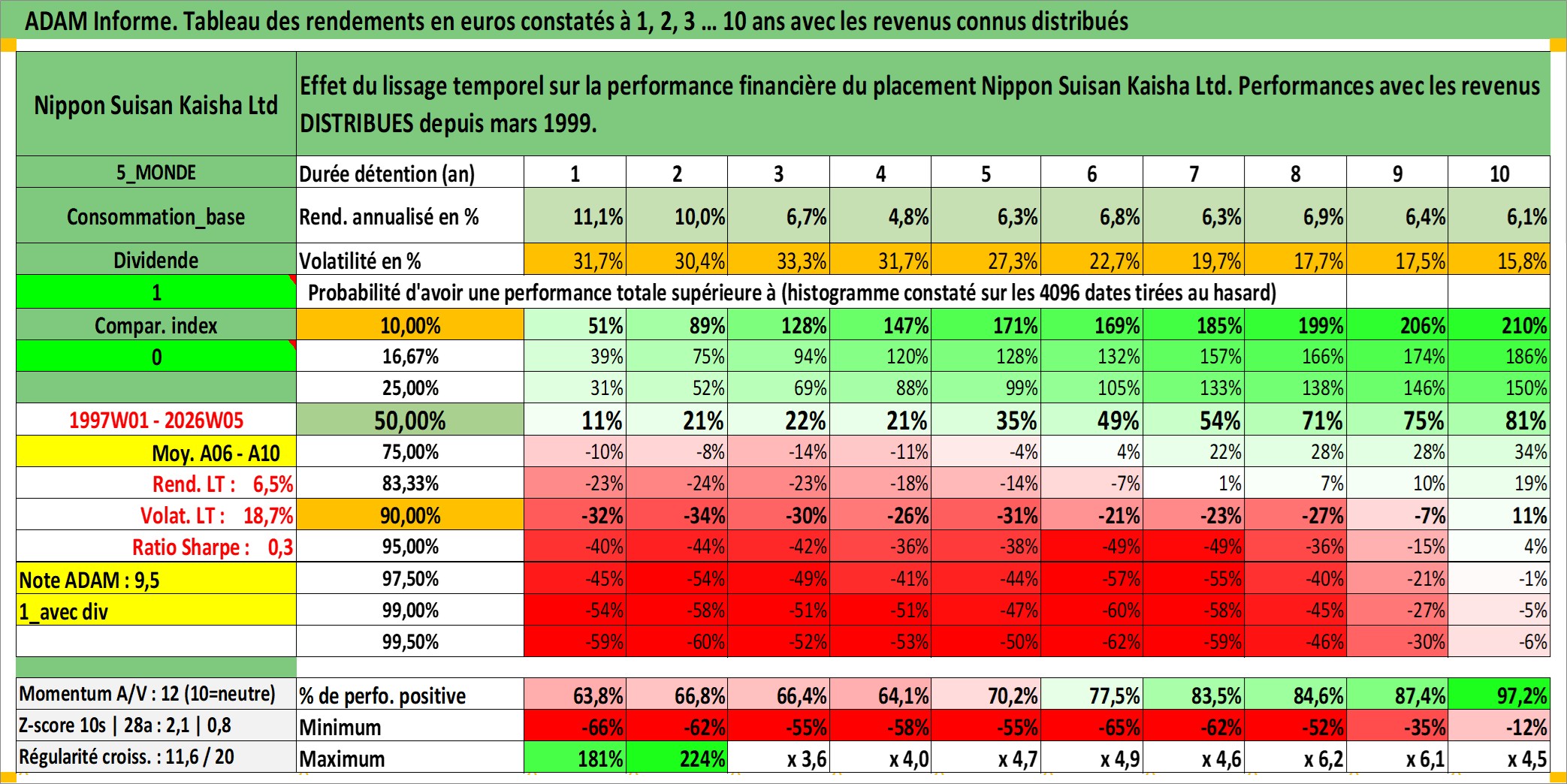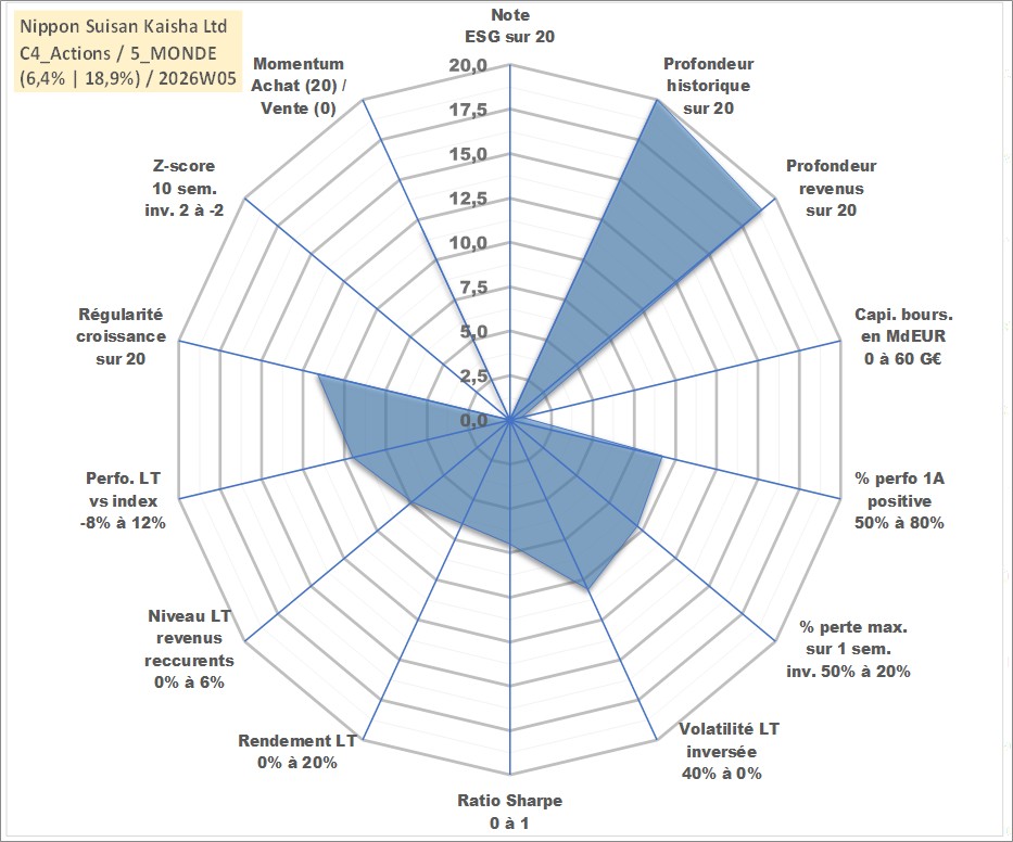 Site dédié aux investisseursPage dédiée sur site financeAnalyse des valorisations hebdomadaires de l'action Nippon Suisan Kaisha Ltd. Cet actif est cote en JPY. Les valorisations sont en contrevaleur EURO et couvrent les semaines 1997W01 a 2026W05. Les revenus de cet actif financier sont pris en compte depuis la semaine 1999W12. La note ESG de cet actif n'est pas connue.