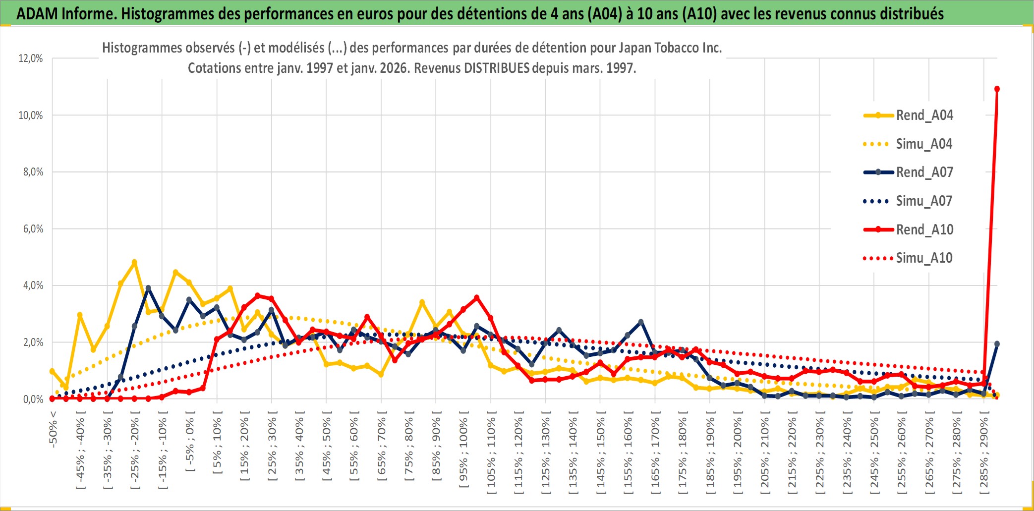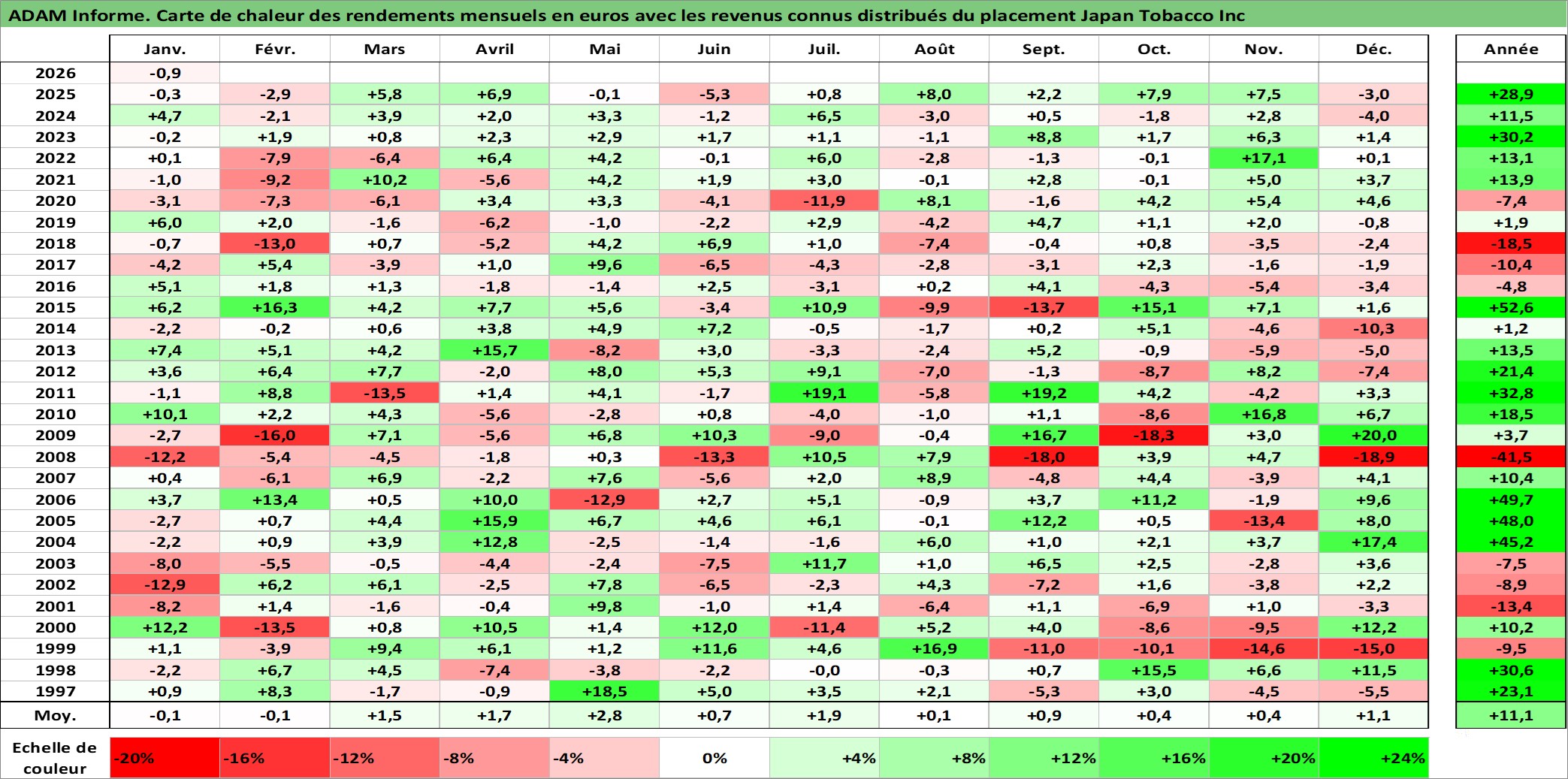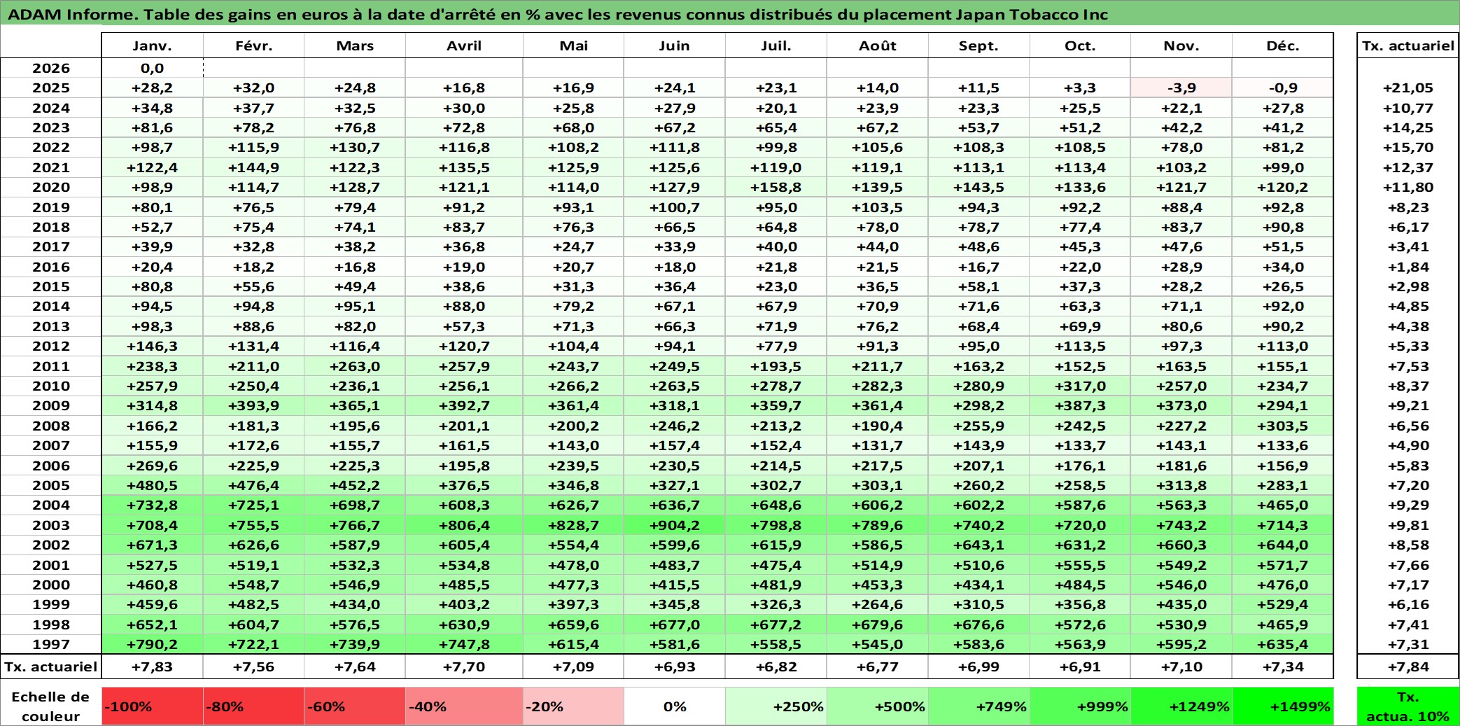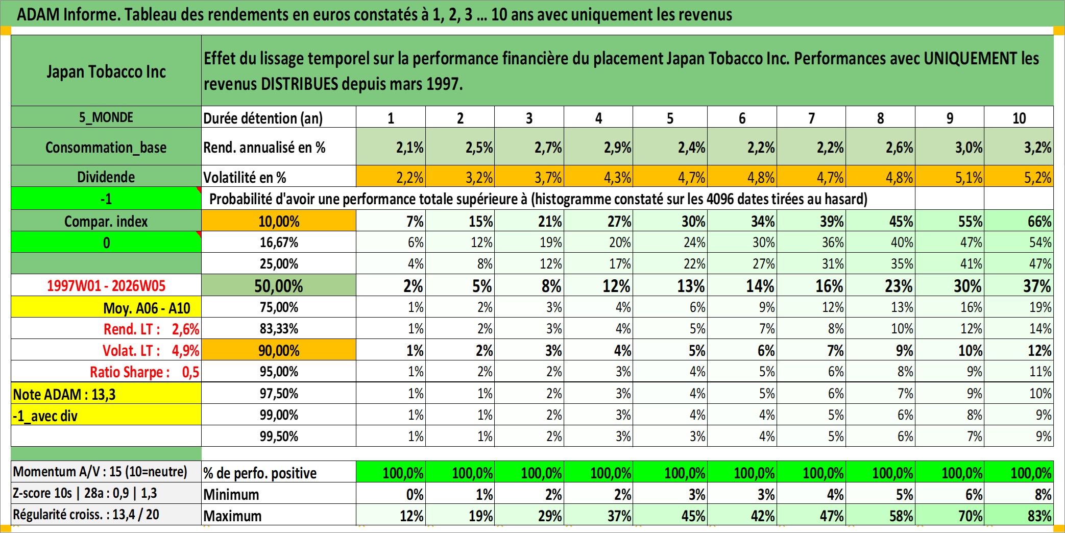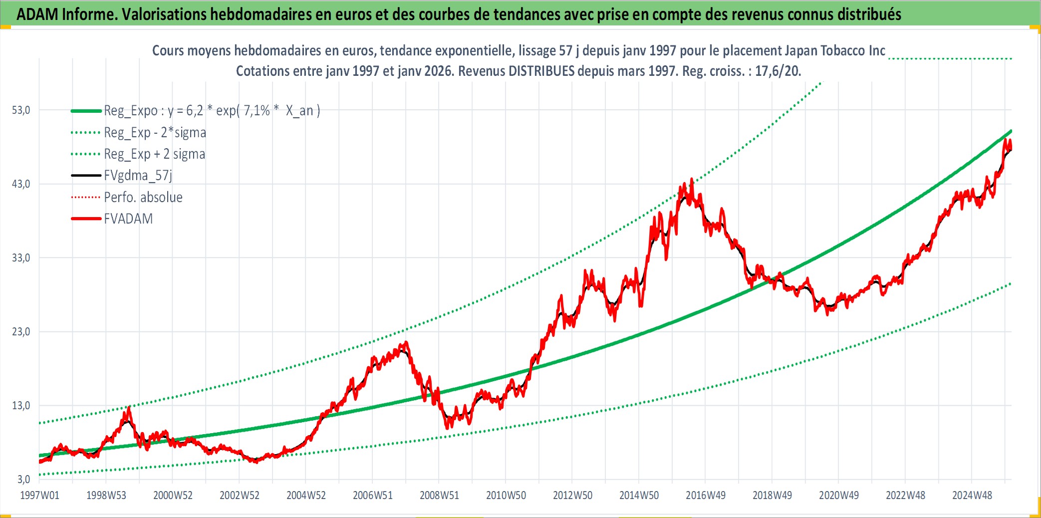 Site dédié aux investisseursPage dédiée sur site financeAnalyse des valorisations hebdomadaires de l'action Japan Tobacco Inc. Cet actif est cote en JPY. Les valorisations sont en contrevaleur EURO et couvrent les semaines 1997W01 a 2026W05. Les revenus de cet actif financier sont pris en compte depuis la semaine 1997W13. La note globale ESG de cet actif est estimee a 7.0 (apres rebasage entre 0 et 20).