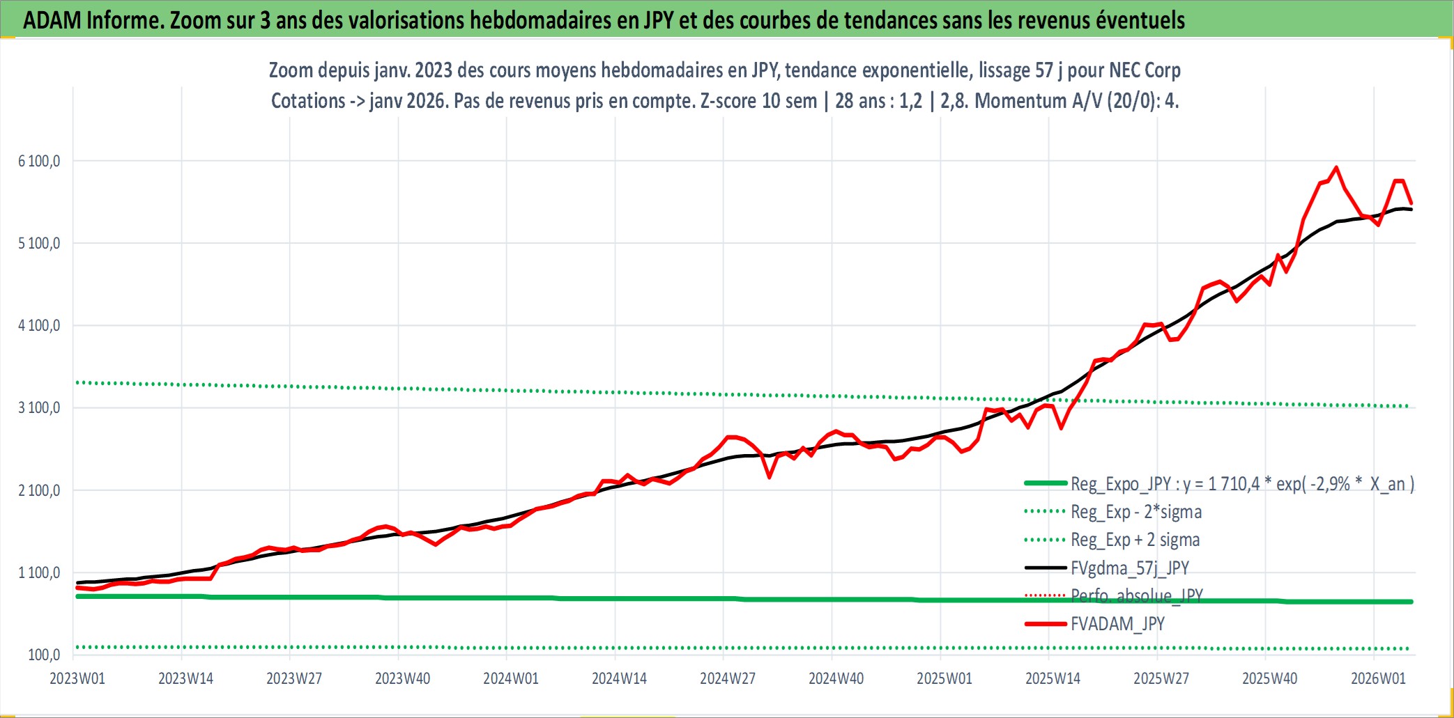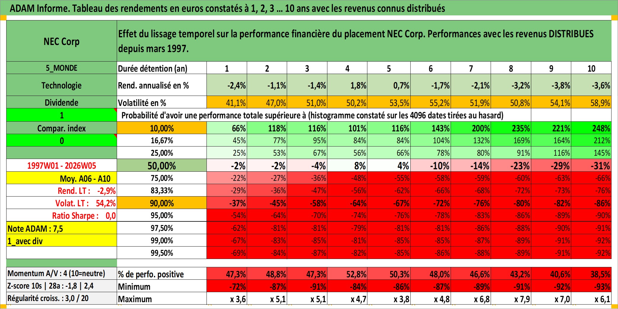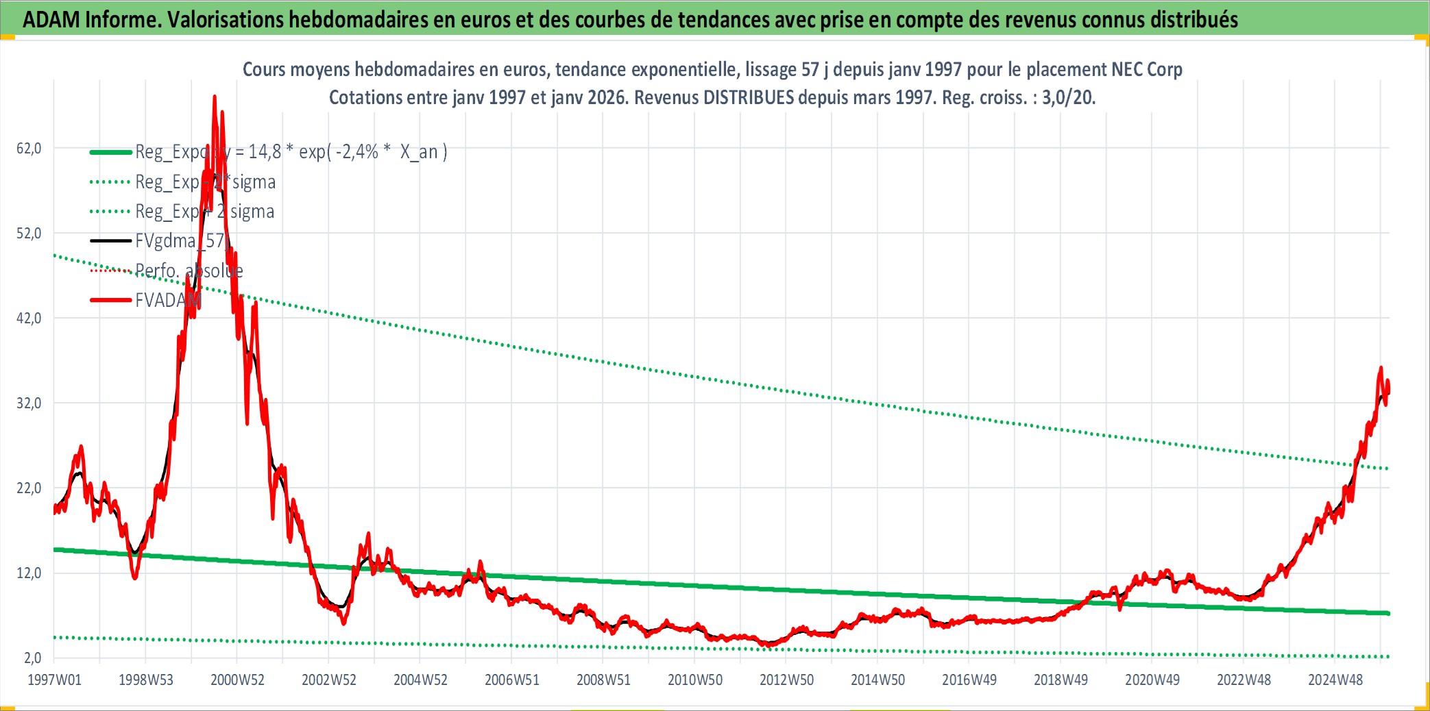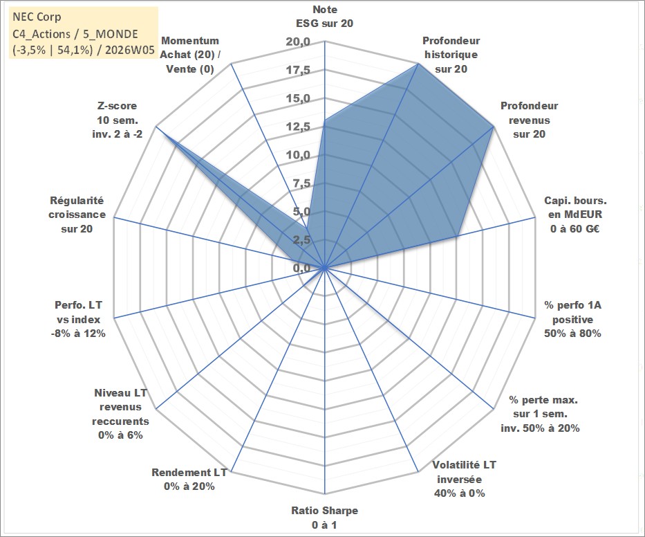 Site dédié aux investisseursPage dédiée sur site financeAnalyse des valorisations hebdomadaires de l'action NEC Corp. Cet actif est cote en JPY. Les valorisations sont en contrevaleur EURO et couvrent les semaines 1997W01 a 2026W05. Les revenus de cet actif financier sont pris en compte depuis la semaine 1997W13. La note globale ESG de cet actif est estimee a 13.0 (apres rebasage entre 0 et 20).