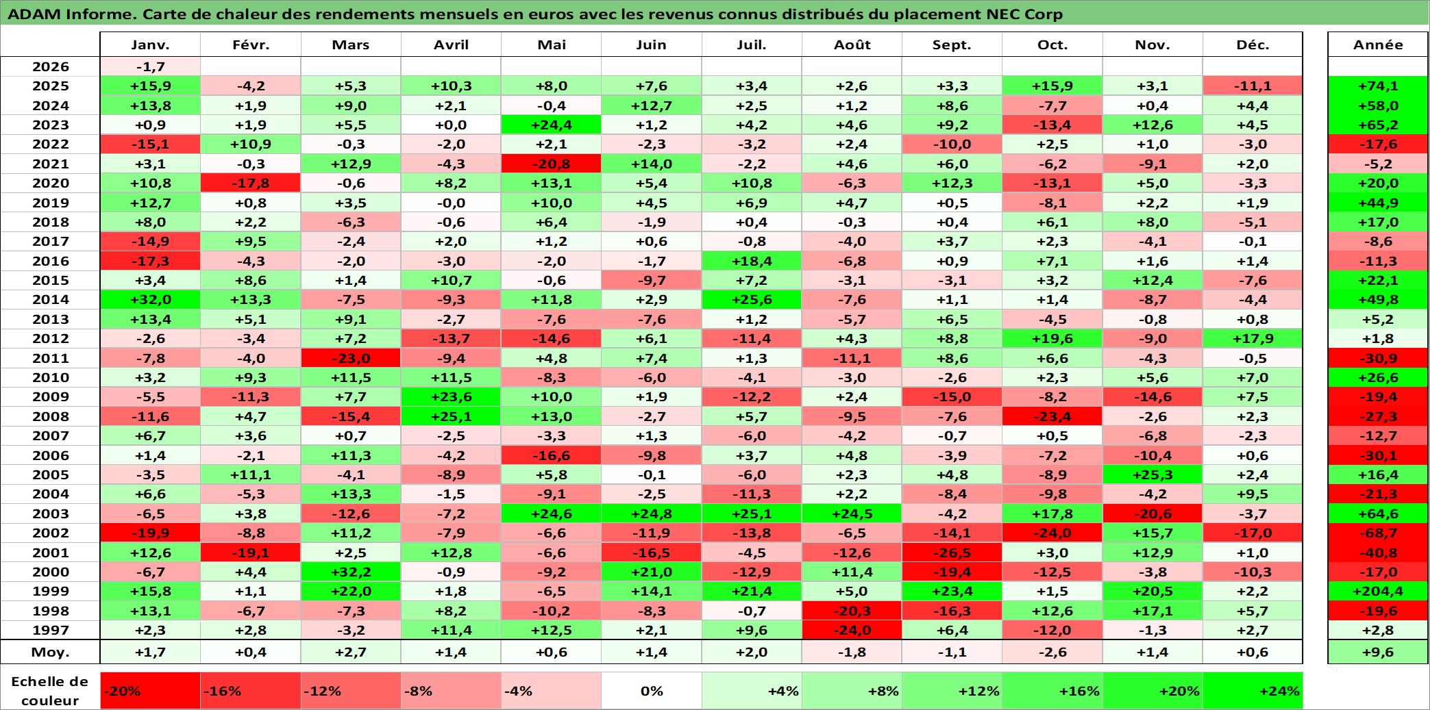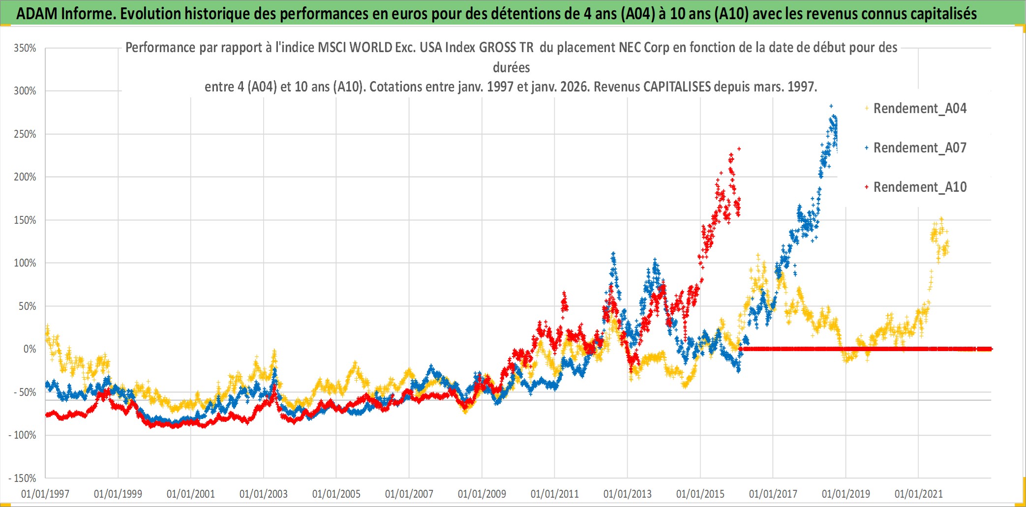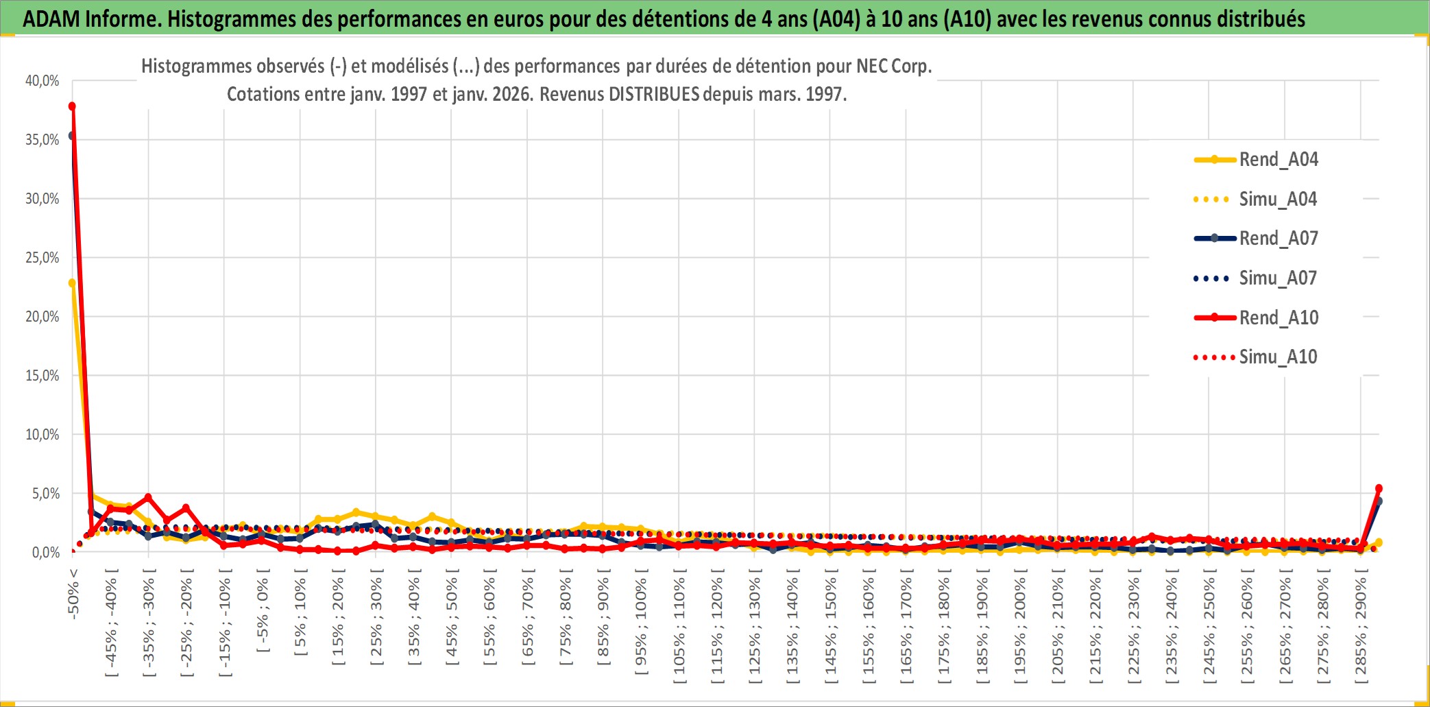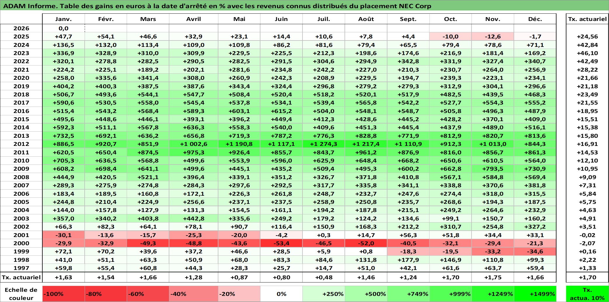 Site dédié aux investisseursPage dédiée sur site financeAnalyse des valorisations hebdomadaires de l'action NEC Corp. Cet actif est cote en JPY. Les valorisations sont en contrevaleur EURO et couvrent les semaines 1997W01 a 2026W05. Les revenus de cet actif financier sont pris en compte depuis la semaine 1997W13. La note globale ESG de cet actif est estimee a 13.0 (apres rebasage entre 0 et 20).