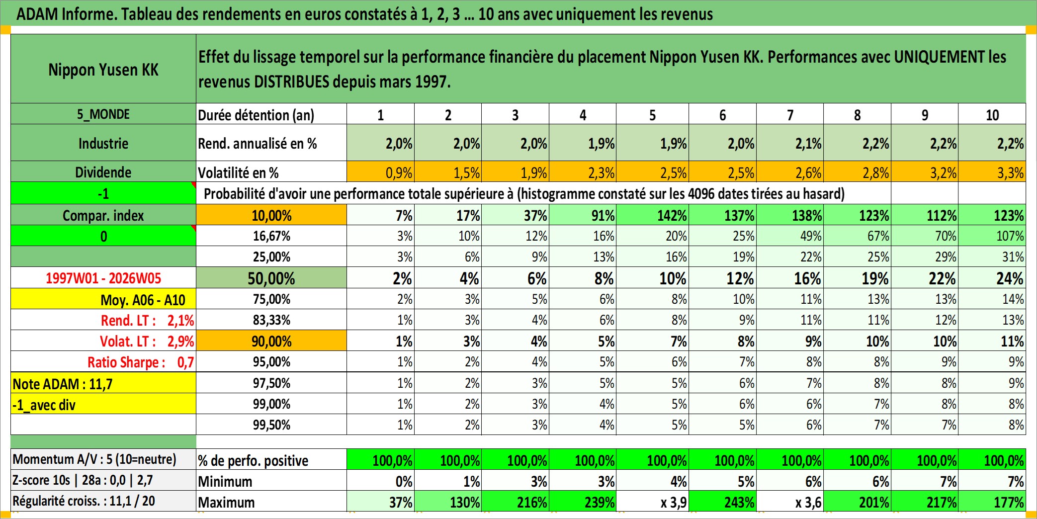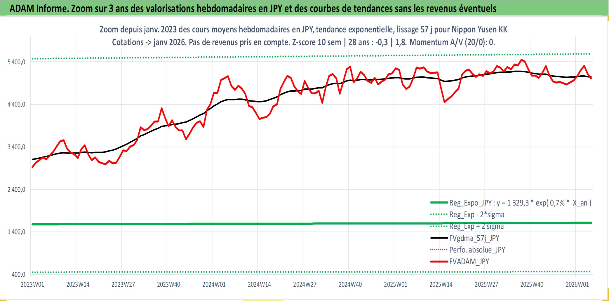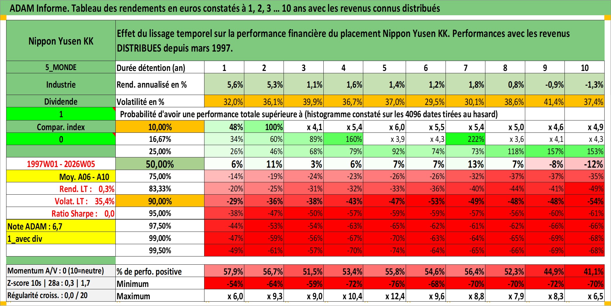 Site dédié aux investisseursPage dédiée sur site financeAnalyse des valorisations hebdomadaires de l'action Nippon Yusen KK. Cet actif est cote en JPY. Les valorisations sont en contrevaleur EURO et couvrent les semaines 1997W01 a 2026W05. Les revenus de cet actif financier sont pris en compte depuis la semaine 1997W13. La note ESG de cet actif n'est pas connue.