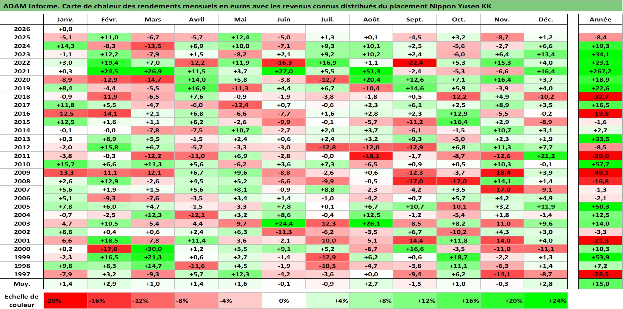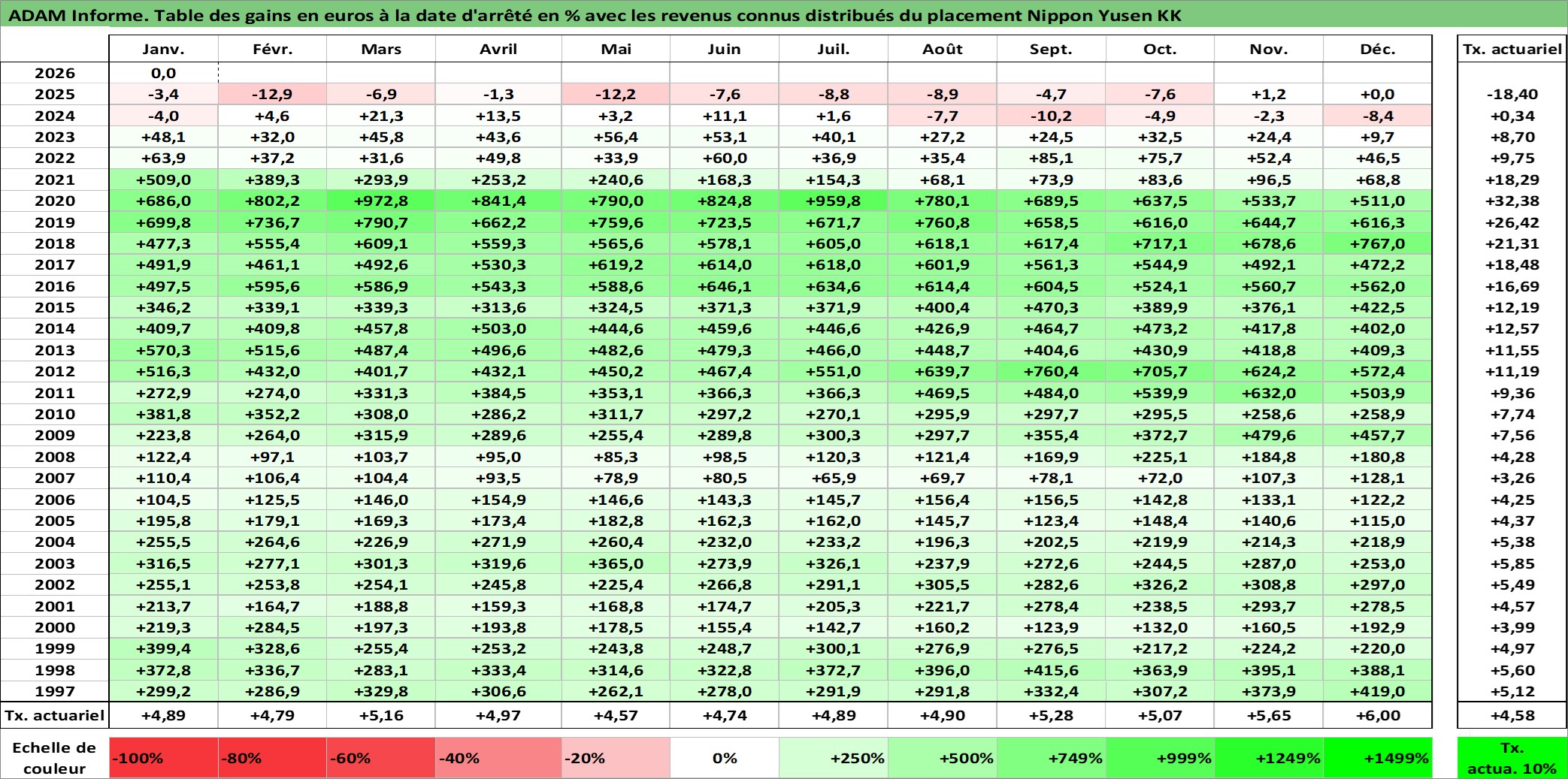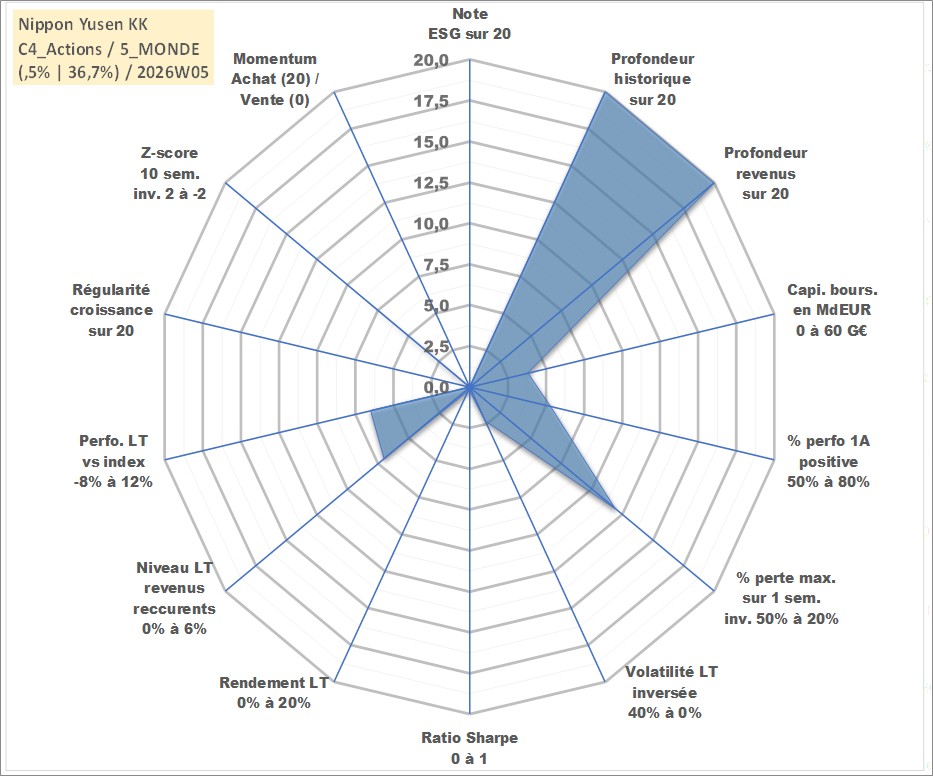 Site dédié aux investisseursPage dédiée sur site financeAnalyse des valorisations hebdomadaires de l'action Nippon Yusen KK. Cet actif est cote en JPY. Les valorisations sont en contrevaleur EURO et couvrent les semaines 1997W01 a 2026W05. Les revenus de cet actif financier sont pris en compte depuis la semaine 1997W13. La note ESG de cet actif n'est pas connue.