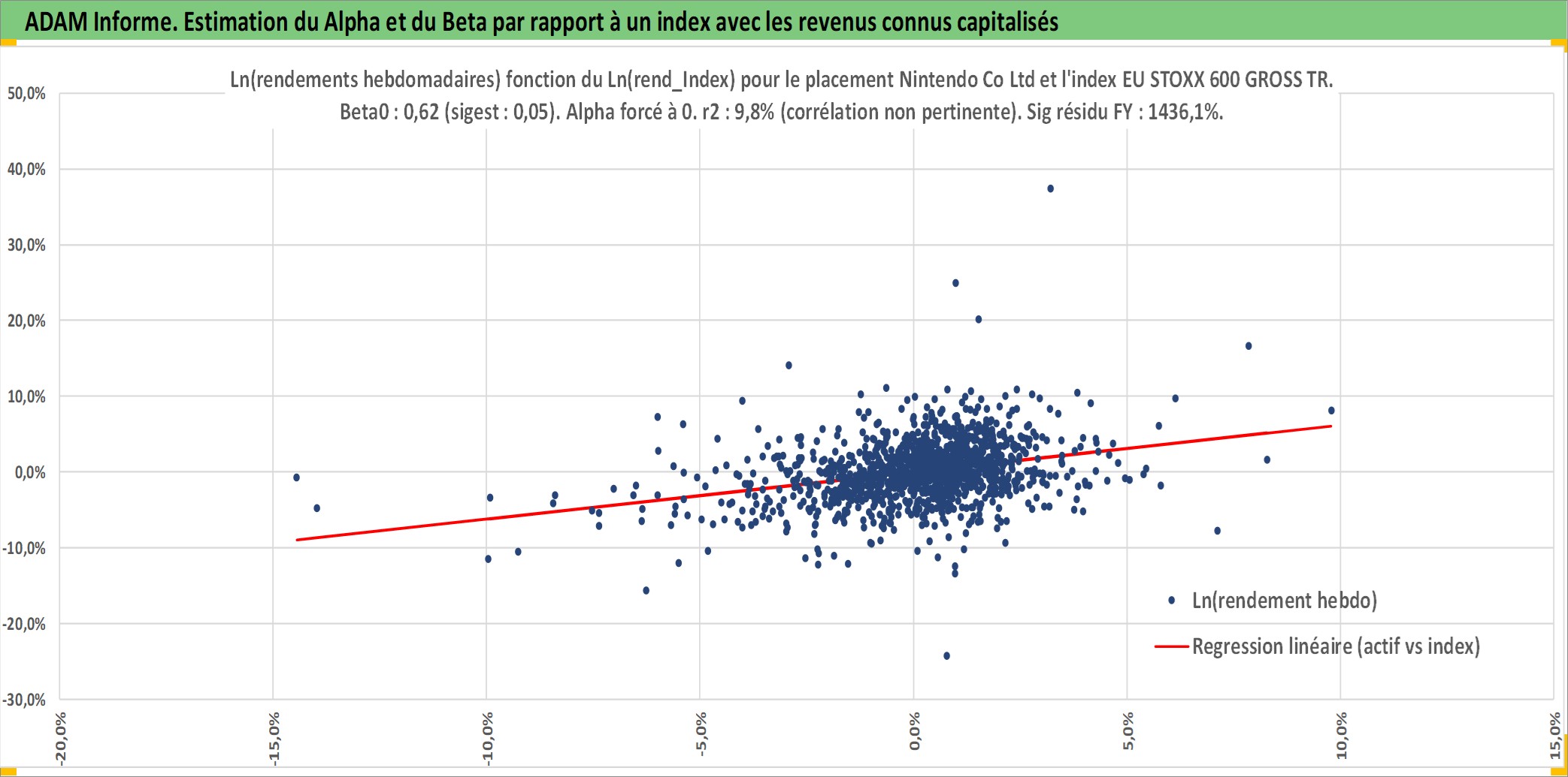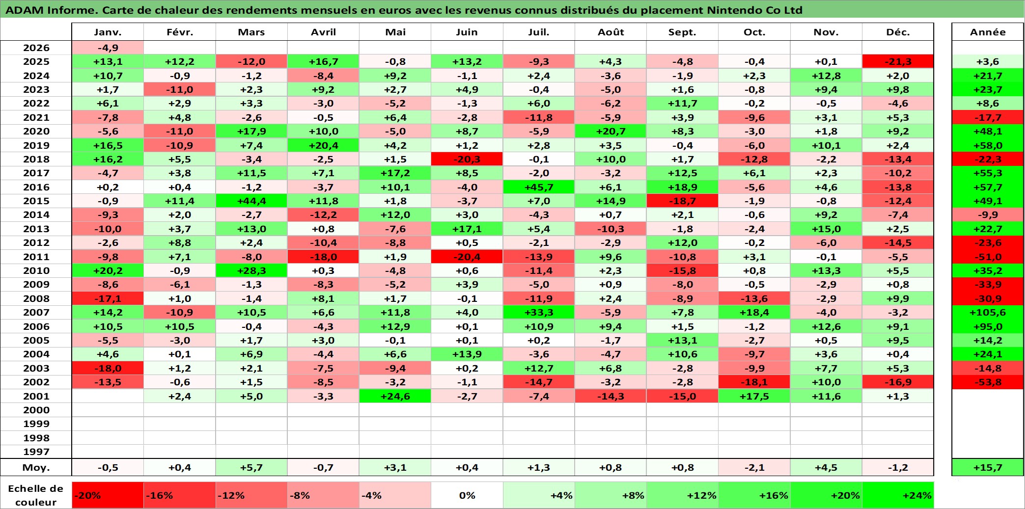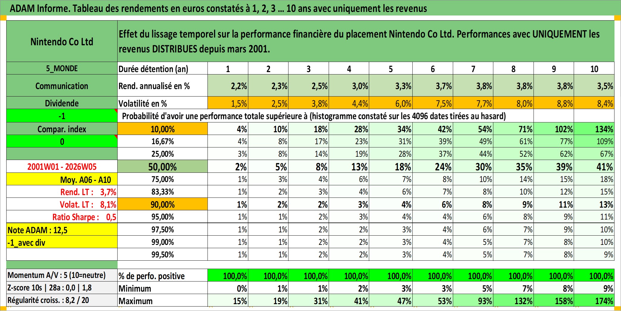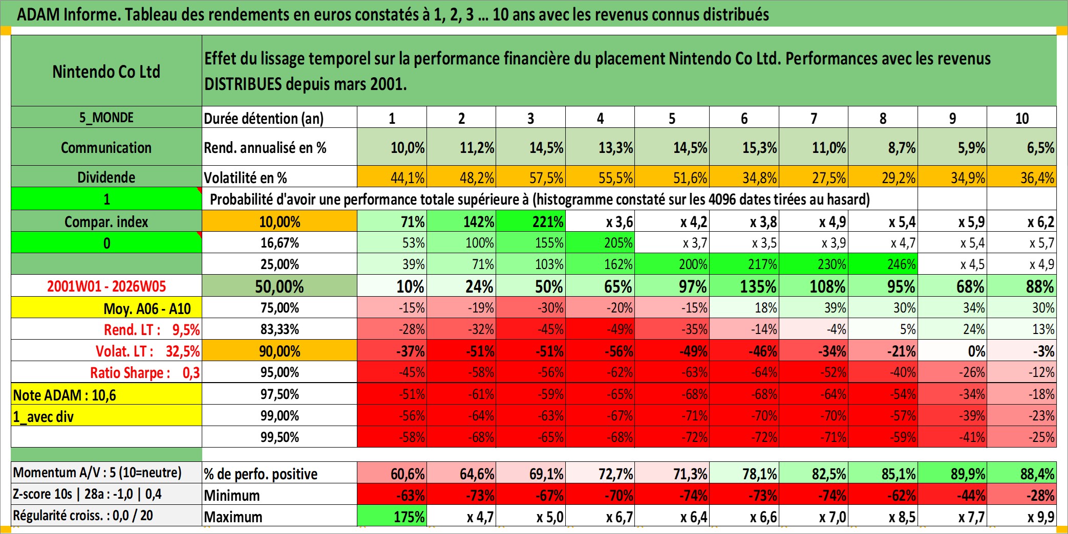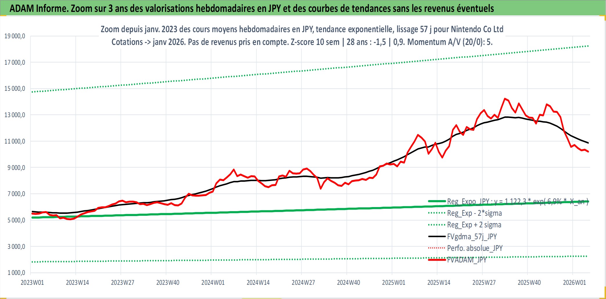 Site dédié aux investisseursPage dédiée sur site financeAnalyse des valorisations hebdomadaires de l'action Nintendo Co Ltd. Cet actif est cote en JPY. Les valorisations sont en contrevaleur EURO et couvrent les semaines 2001W01 a 2026W05. Les revenus de cet actif financier sont pris en compte depuis la semaine 2001W13. La note globale ESG de cet actif est estimee a 12.0 (apres rebasage entre 0 et 20).