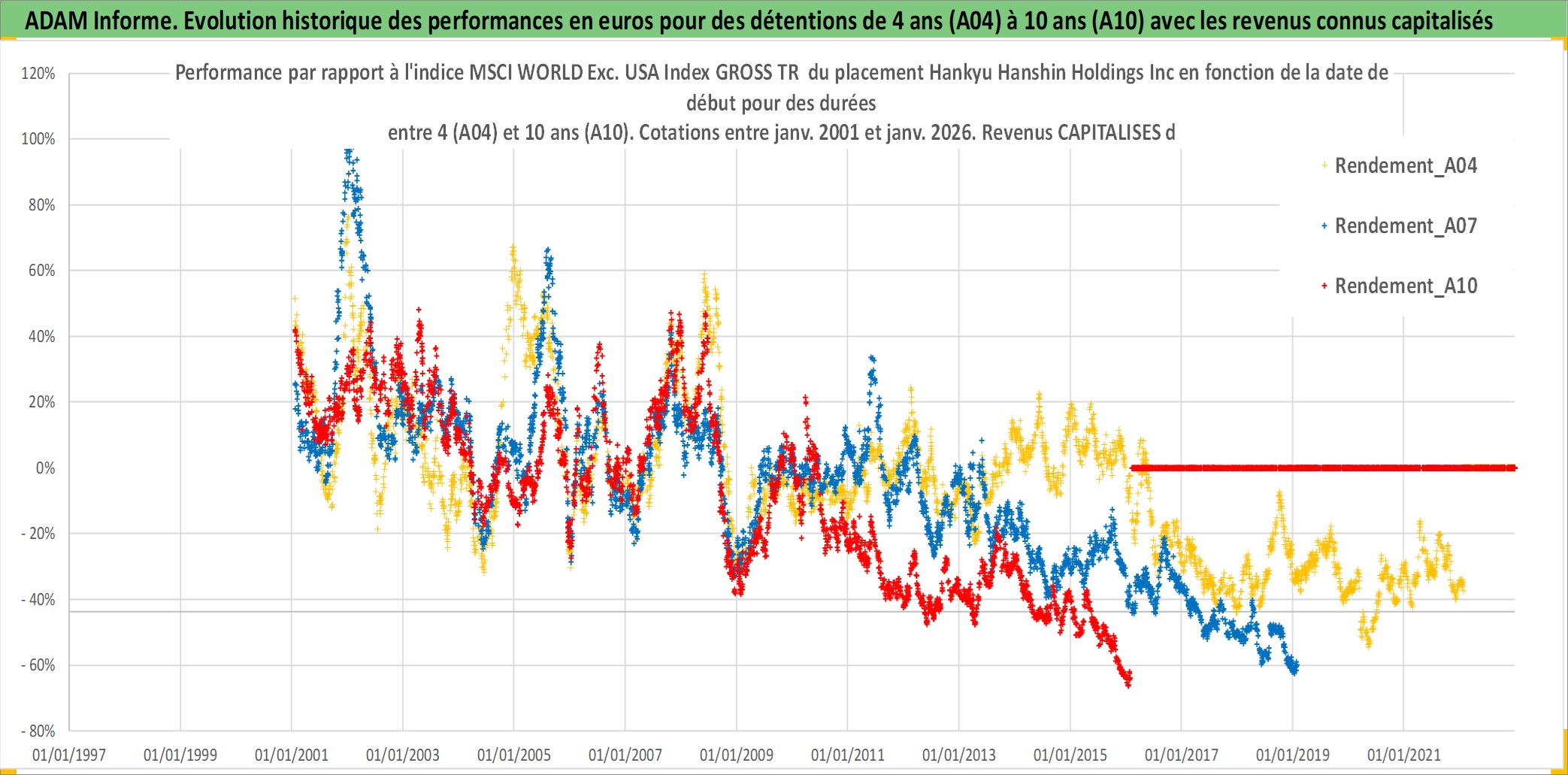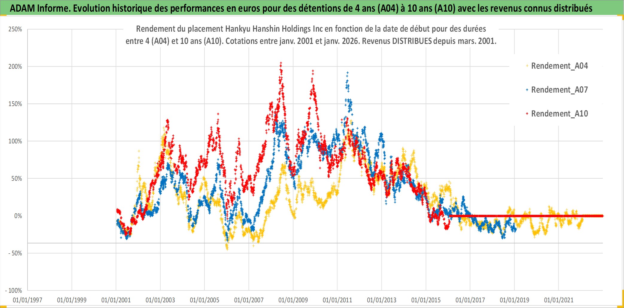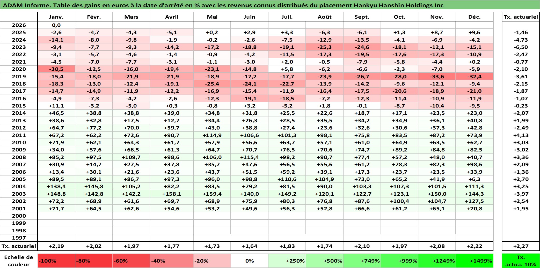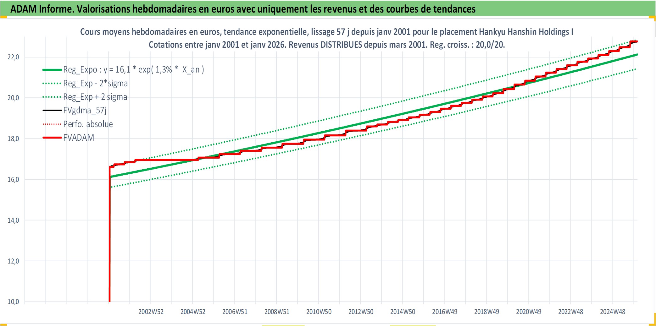 Site dédié aux investisseursPage dédiée sur site financeAnalyse des valorisations hebdomadaires de l'action Hankyu Hanshin Holdings Inc. Cet actif est cote en JPY. Les valorisations sont en contrevaleur EURO et couvrent les semaines 2001W02 a 2026W05. Les revenus de cet actif financier sont pris en compte depuis la semaine 2001W13. La note globale ESG de cet actif est estimee a 6.0 (apres rebasage entre 0 et 20).