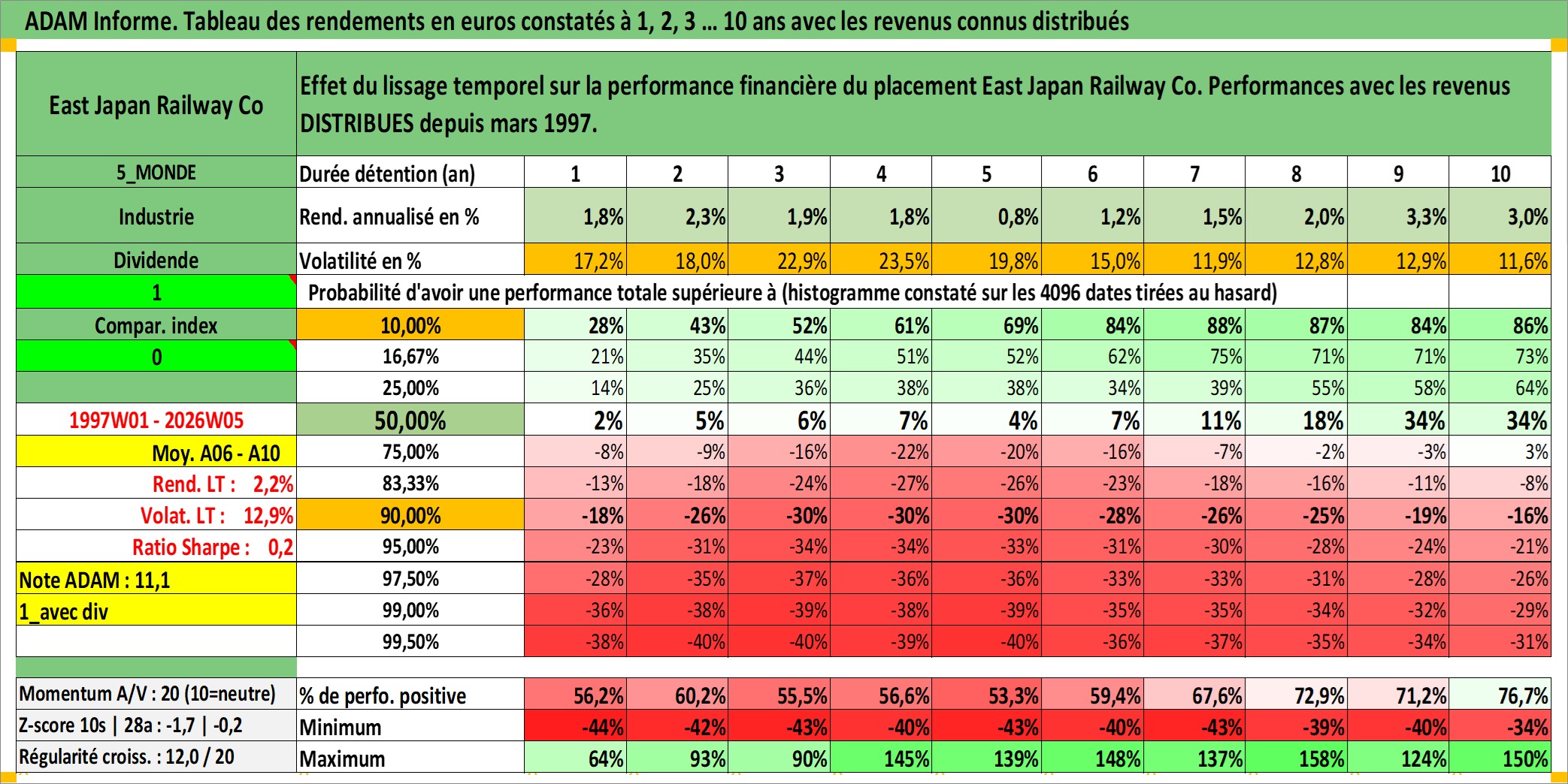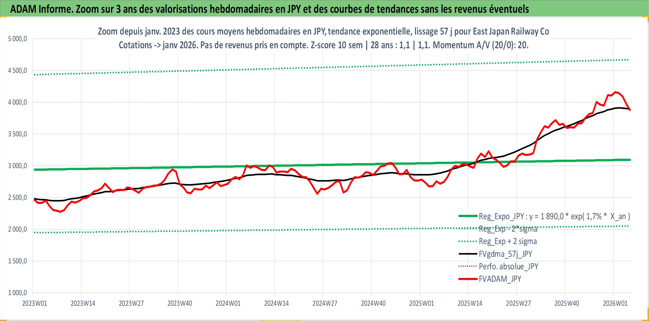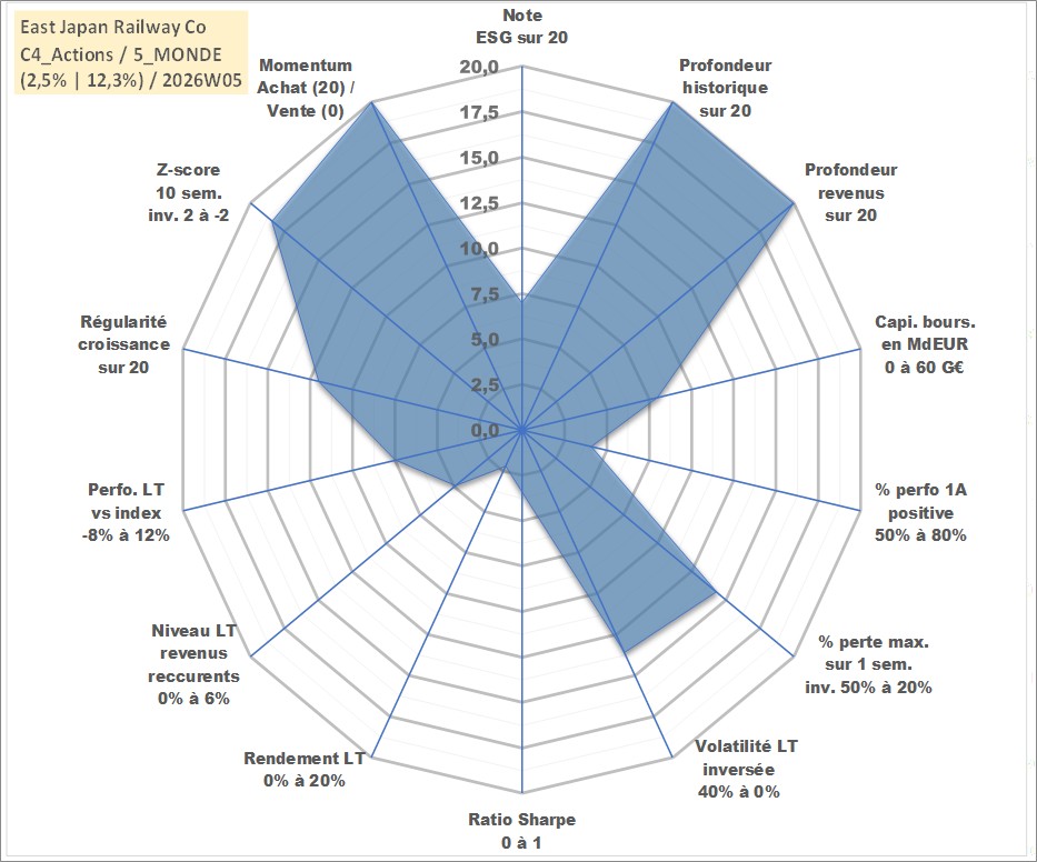 Site dédié aux investisseursPage dédiée sur site financeAnalyse des valorisations hebdomadaires de l'action East Japan Railway Co. Cet actif est cote en JPY. Les valorisations sont en contrevaleur EURO et couvrent les semaines 1997W01 a 2026W05. Les revenus de cet actif financier sont pris en compte depuis la semaine 1997W13. La note globale ESG de cet actif est estimee a 7.0 (apres rebasage entre 0 et 20).