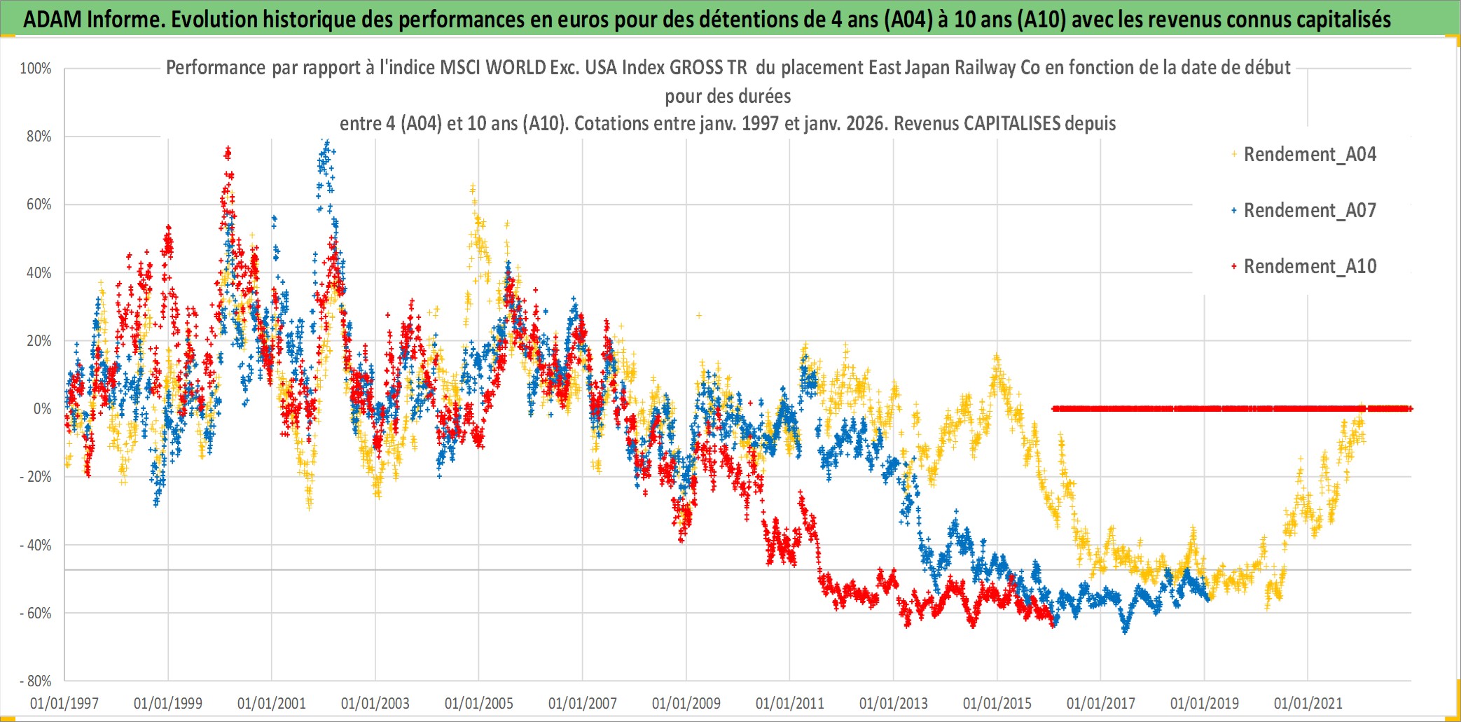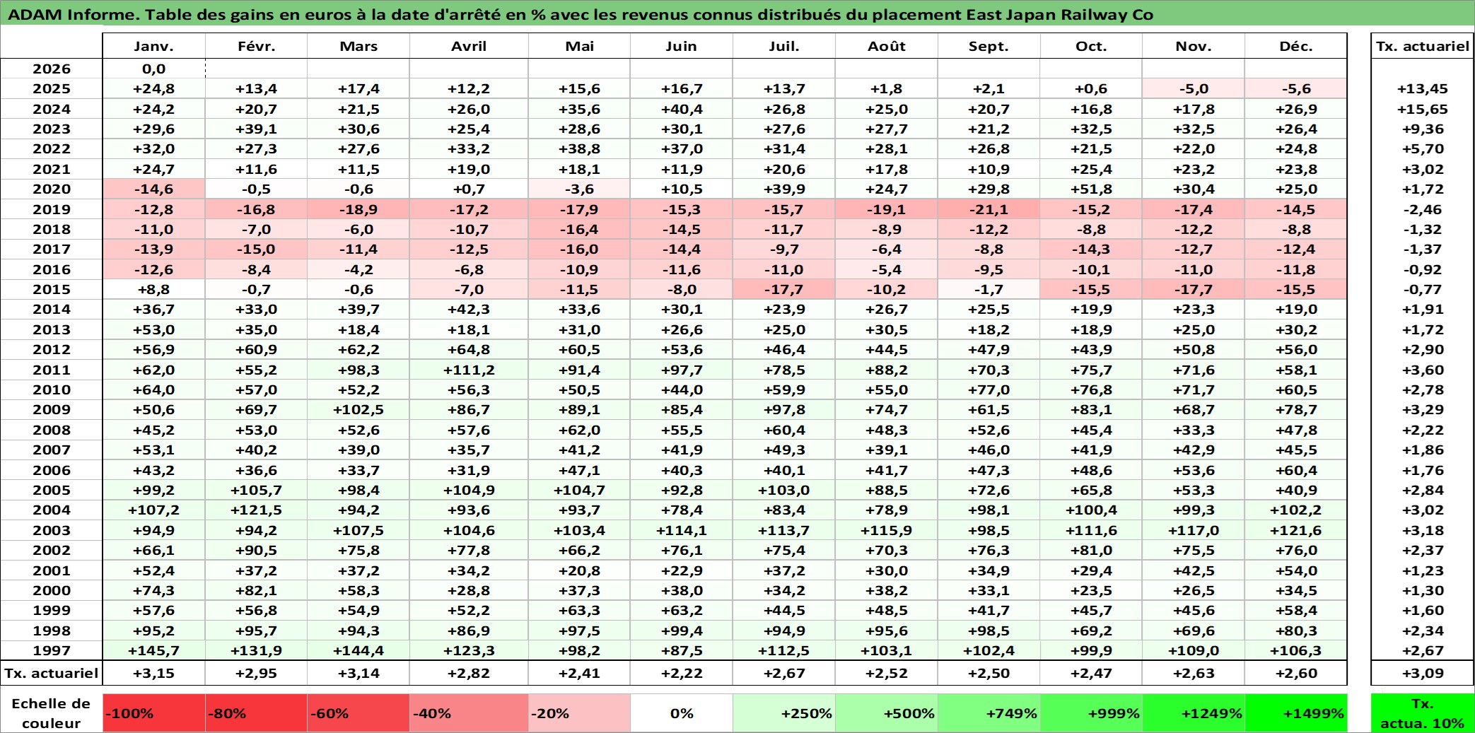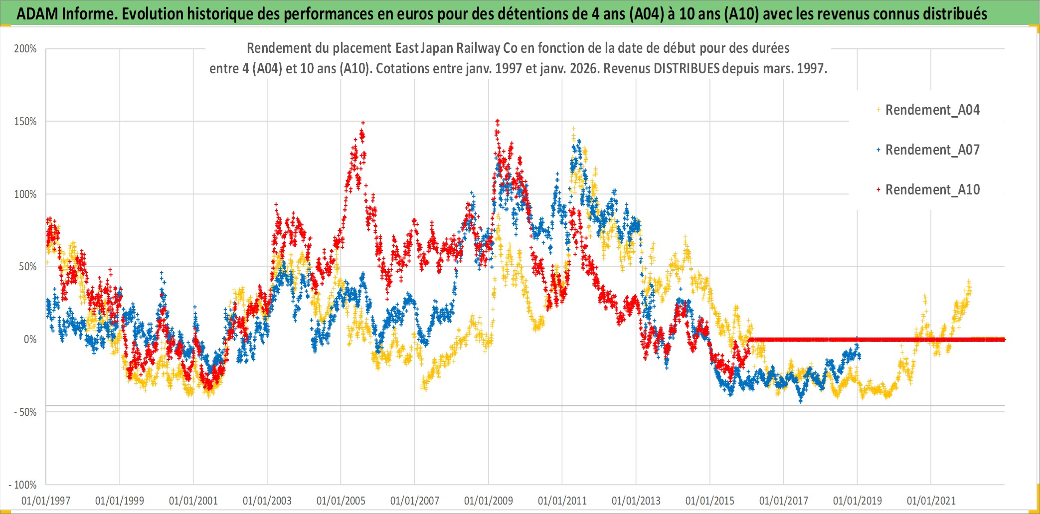 Site dédié aux investisseursPage dédiée sur site financeAnalyse des valorisations hebdomadaires de l'action East Japan Railway Co. Cet actif est cote en JPY. Les valorisations sont en contrevaleur EURO et couvrent les semaines 1997W01 a 2026W05. Les revenus de cet actif financier sont pris en compte depuis la semaine 1997W13. La note globale ESG de cet actif est estimee a 7.0 (apres rebasage entre 0 et 20).
