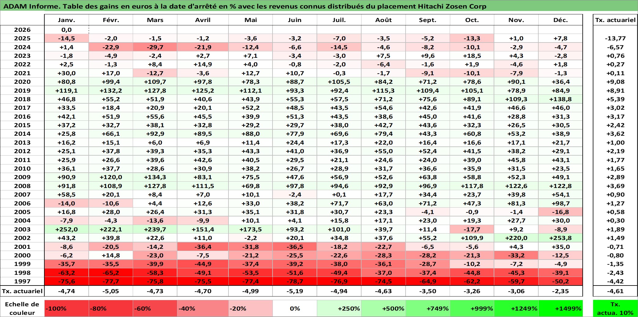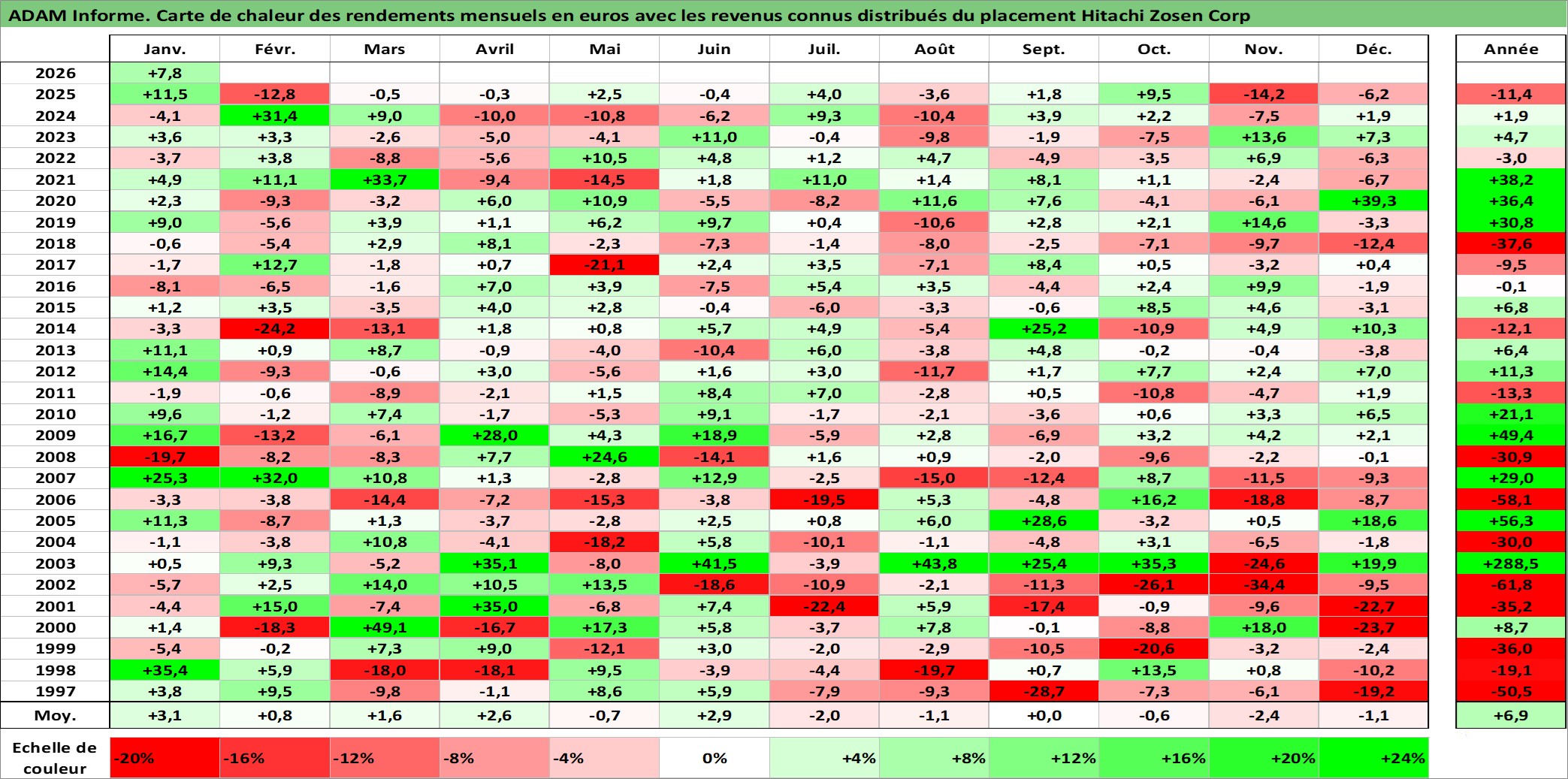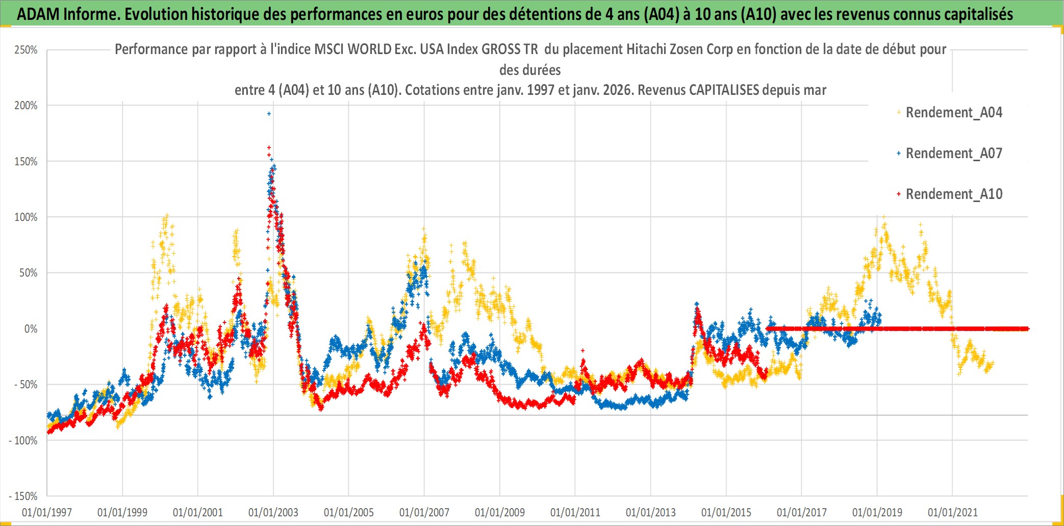 Site dédié aux investisseursPage dédiée sur site financeAnalyse des valorisations hebdomadaires de l'action Hitachi Zosen Corp. Cet actif est cote en JPY. Les valorisations sont en contrevaleur EURO et couvrent les semaines 1997W01 a 2026W05. Les revenus de cet actif financier sont pris en compte depuis la semaine 1997W13. La note ESG de cet actif n'est pas connue.