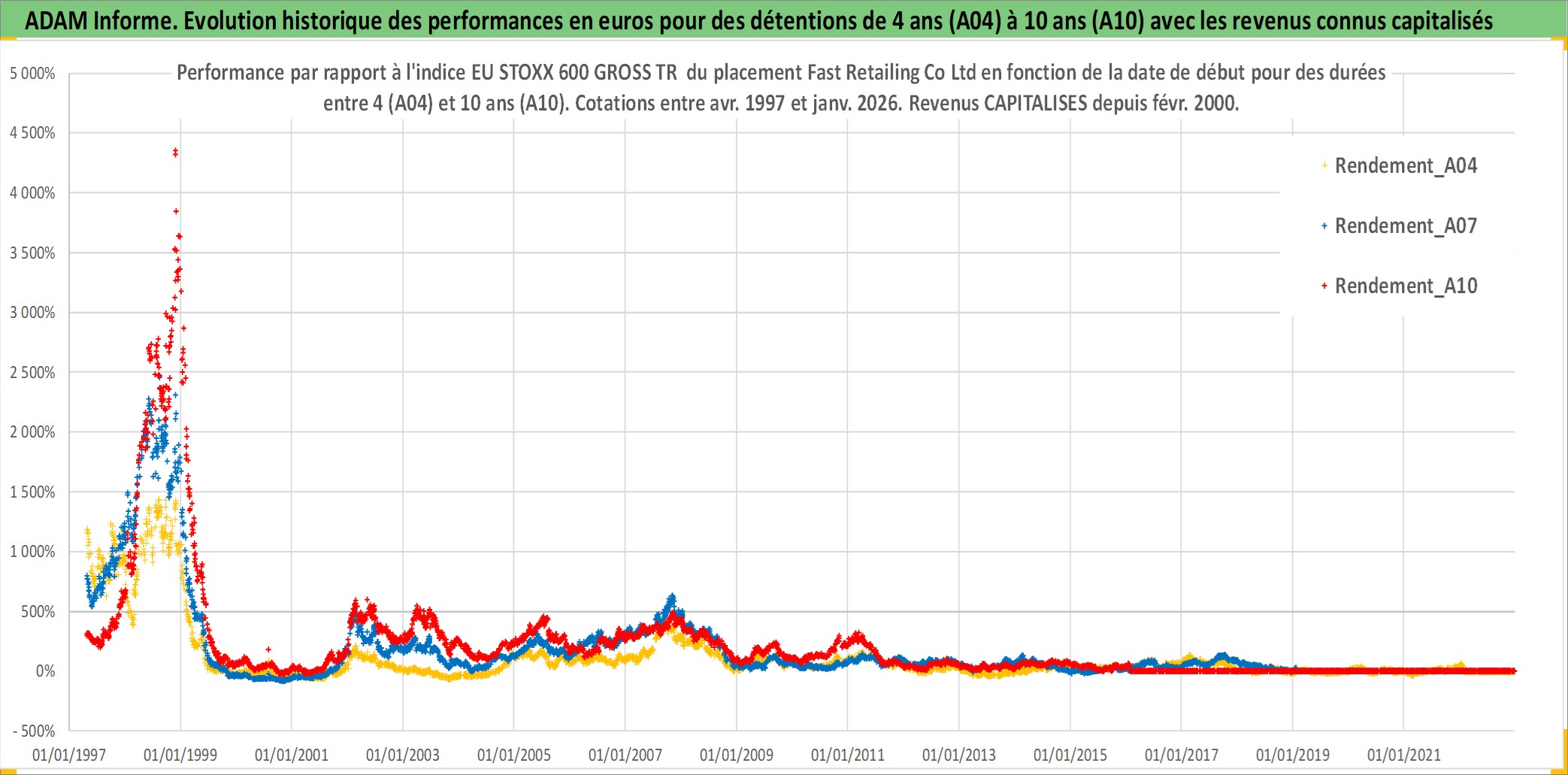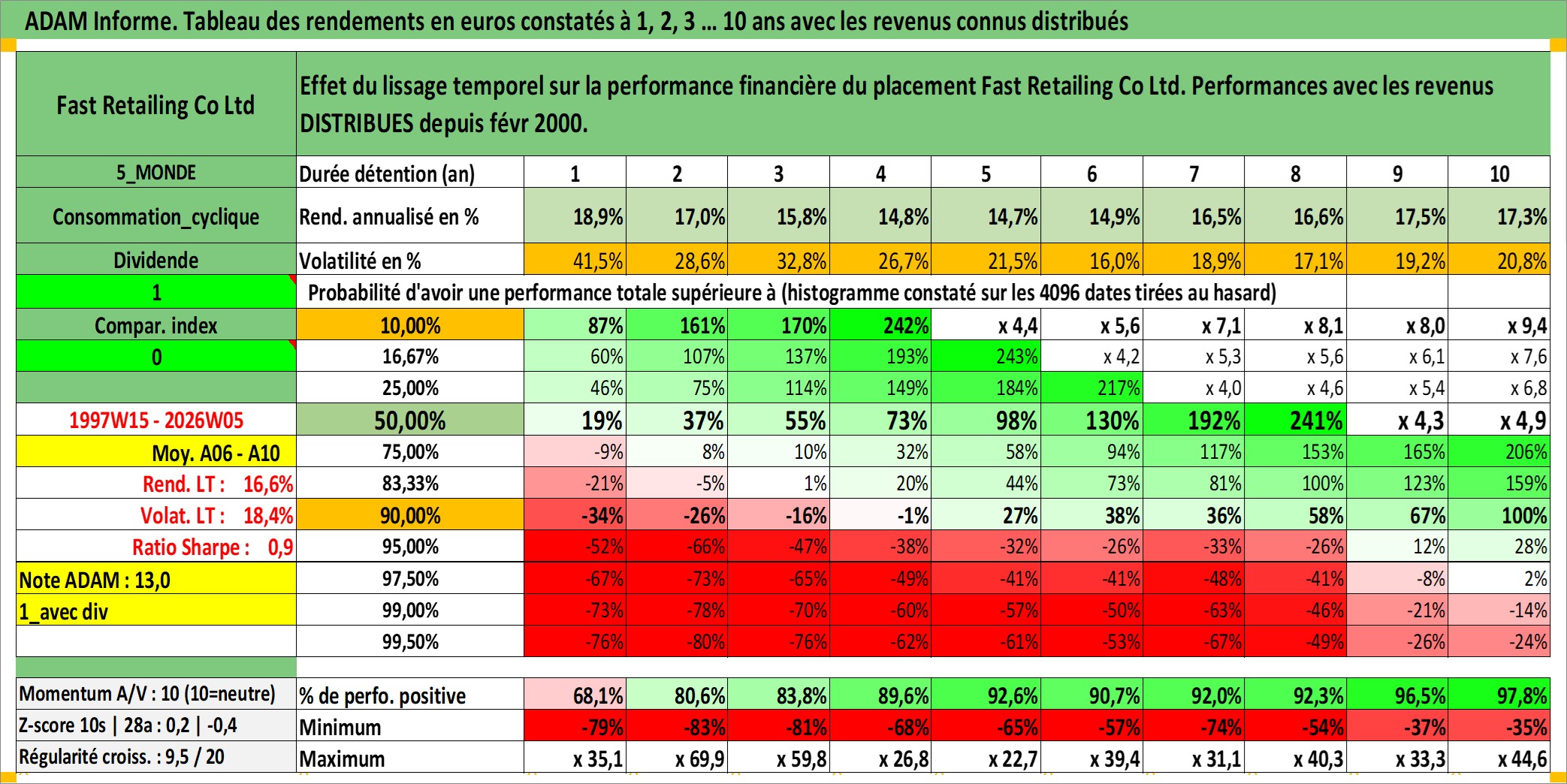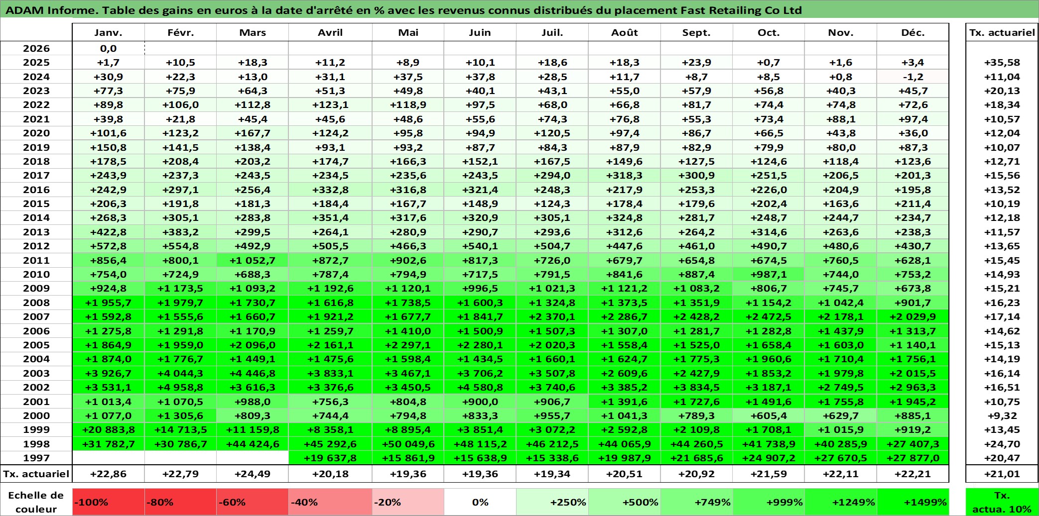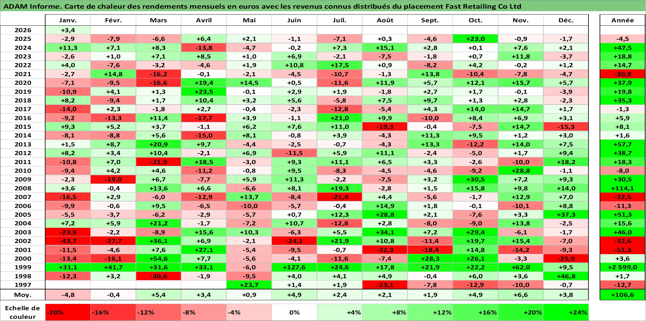 Site dédié aux investisseursPage dédiée sur site financeAnalyse des valorisations hebdomadaires de l'action Fast Retailing Co Ltd. Cet actif est cote en JPY. Les valorisations sont en contrevaleur EURO et couvrent les semaines 1997W15 a 2026W05. Les revenus de cet actif financier sont pris en compte depuis la semaine 2000W08. La note globale ESG de cet actif est estimee a 13.0 (apres rebasage entre 0 et 20).