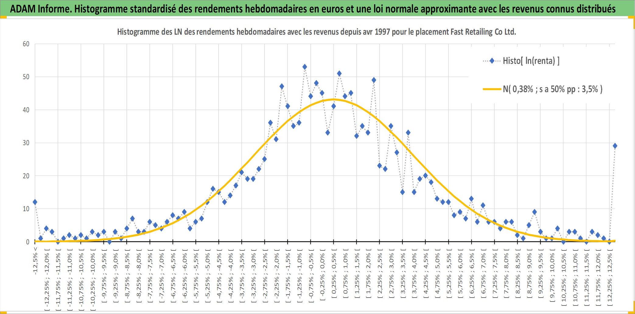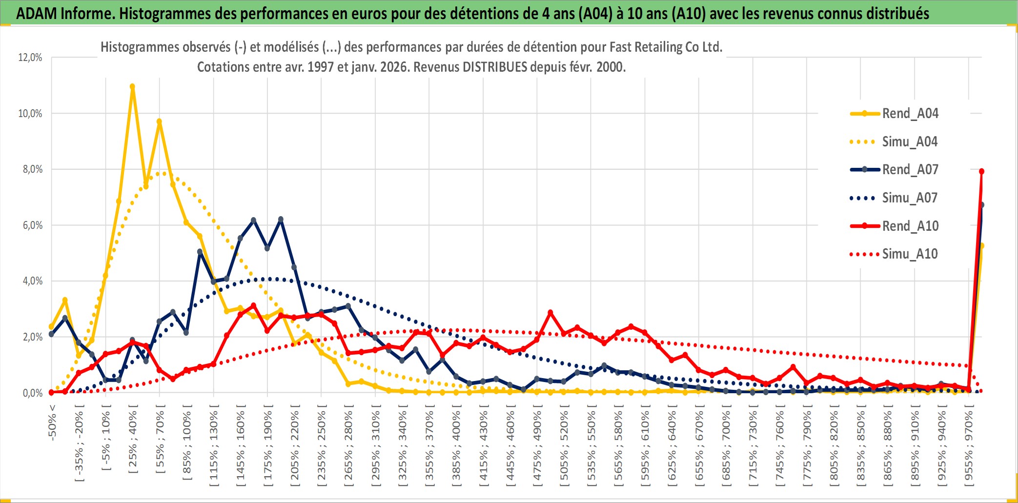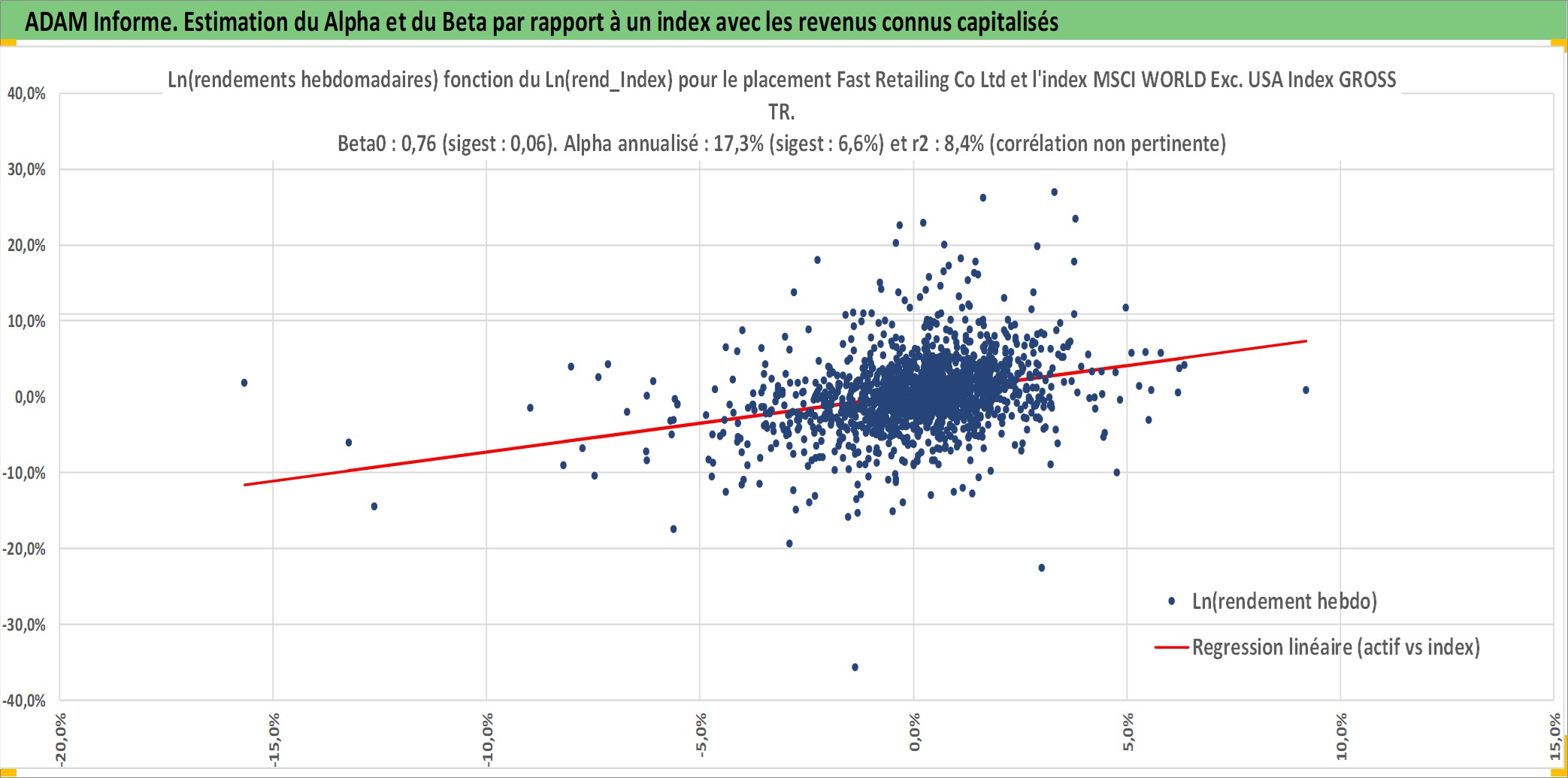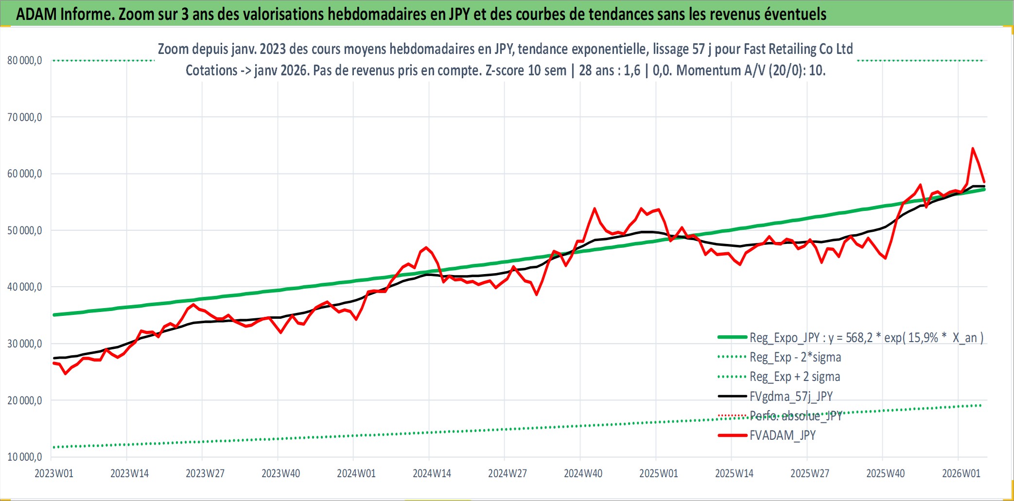 Site dédié aux investisseursPage dédiée sur site financeAnalyse des valorisations hebdomadaires de l'action Fast Retailing Co Ltd. Cet actif est cote en JPY. Les valorisations sont en contrevaleur EURO et couvrent les semaines 1997W15 a 2026W05. Les revenus de cet actif financier sont pris en compte depuis la semaine 2000W08. La note globale ESG de cet actif est estimee a 13.0 (apres rebasage entre 0 et 20).