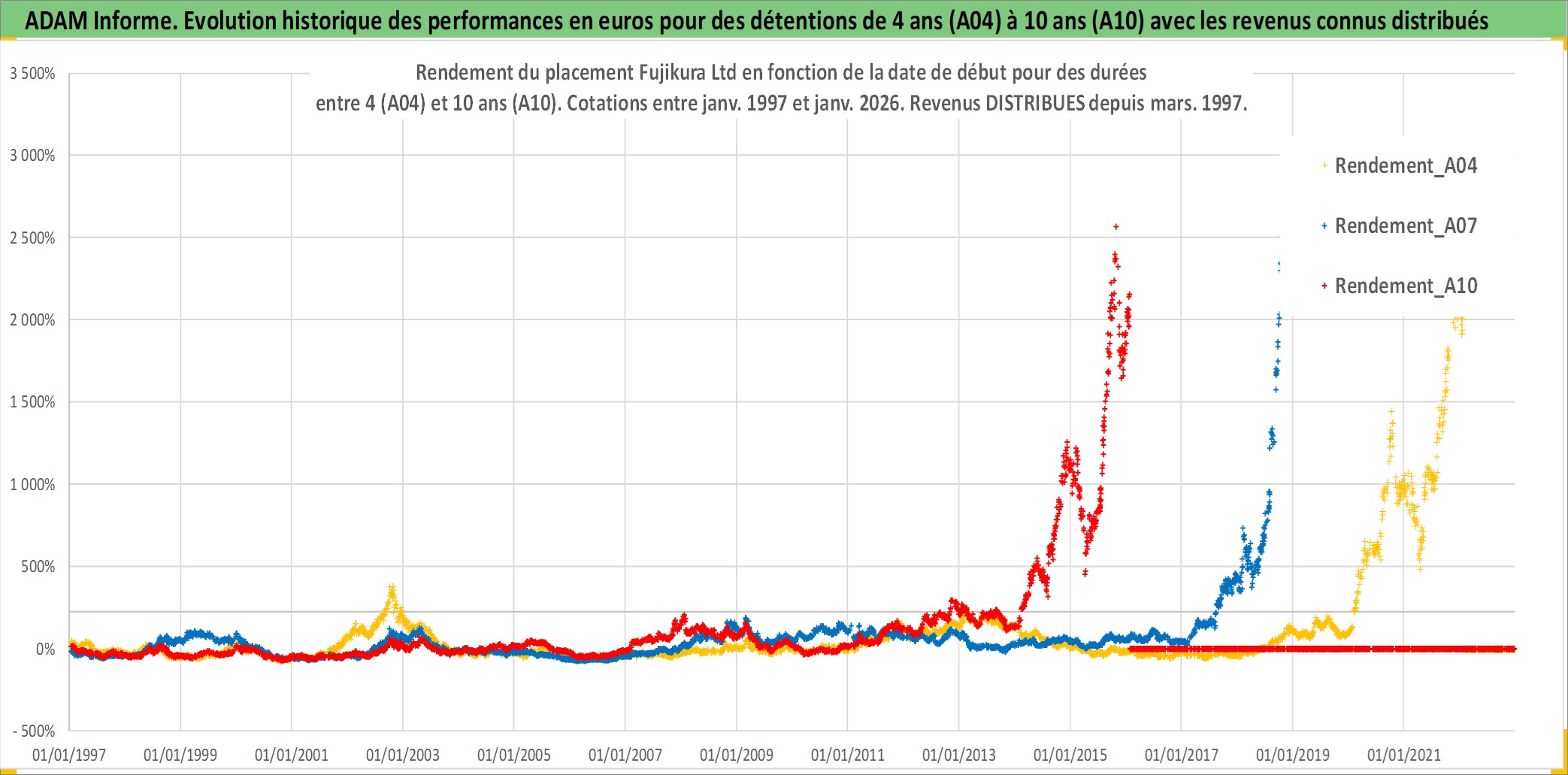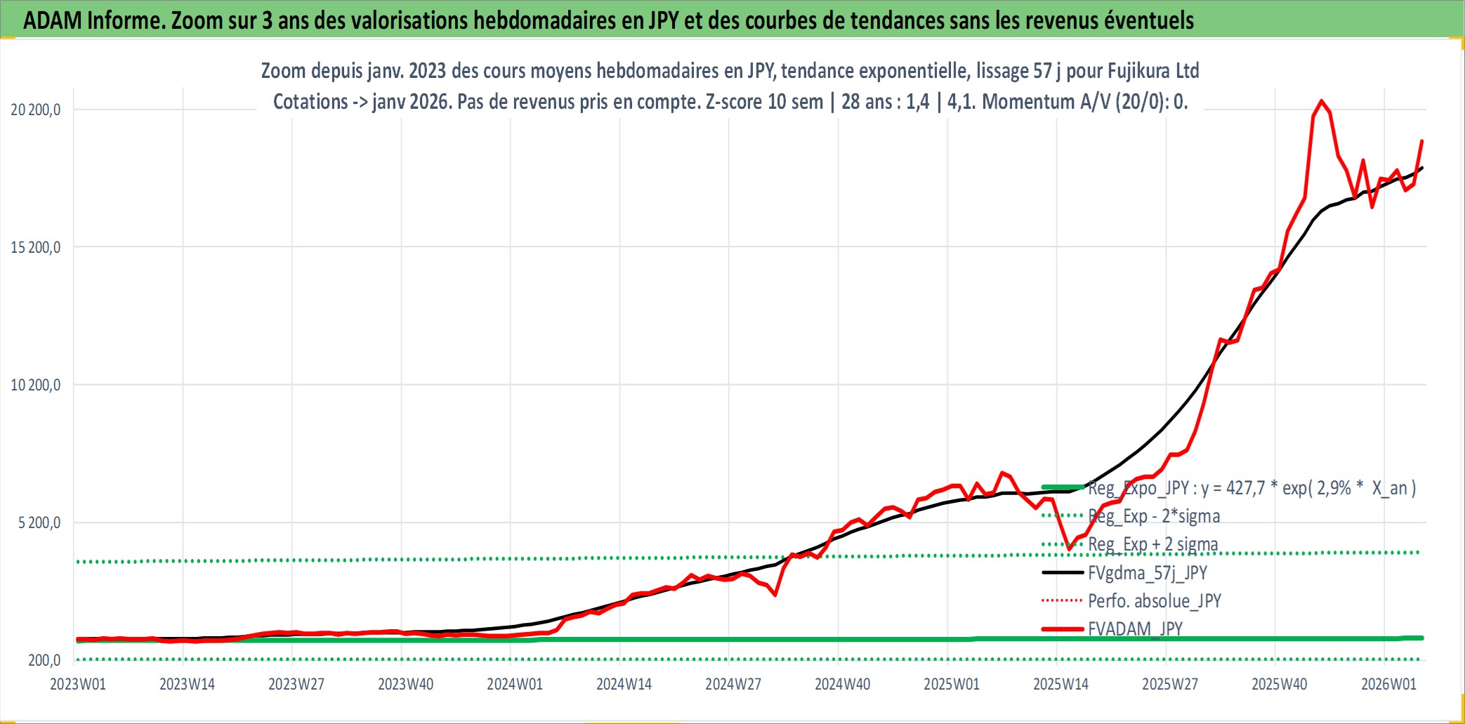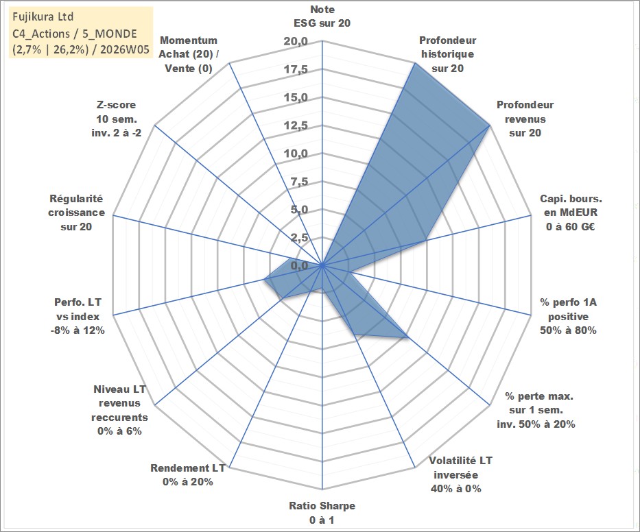 Site dédié aux investisseursPage dédiée sur site financeAnalyse des valorisations hebdomadaires de l'action Fujikura Ltd. Cet actif est cote en JPY. Les valorisations sont en contrevaleur EURO et couvrent les semaines 1997W01 a 2026W05. Les revenus de cet actif financier sont pris en compte depuis la semaine 1997W13. La note ESG de cet actif n'est pas connue.