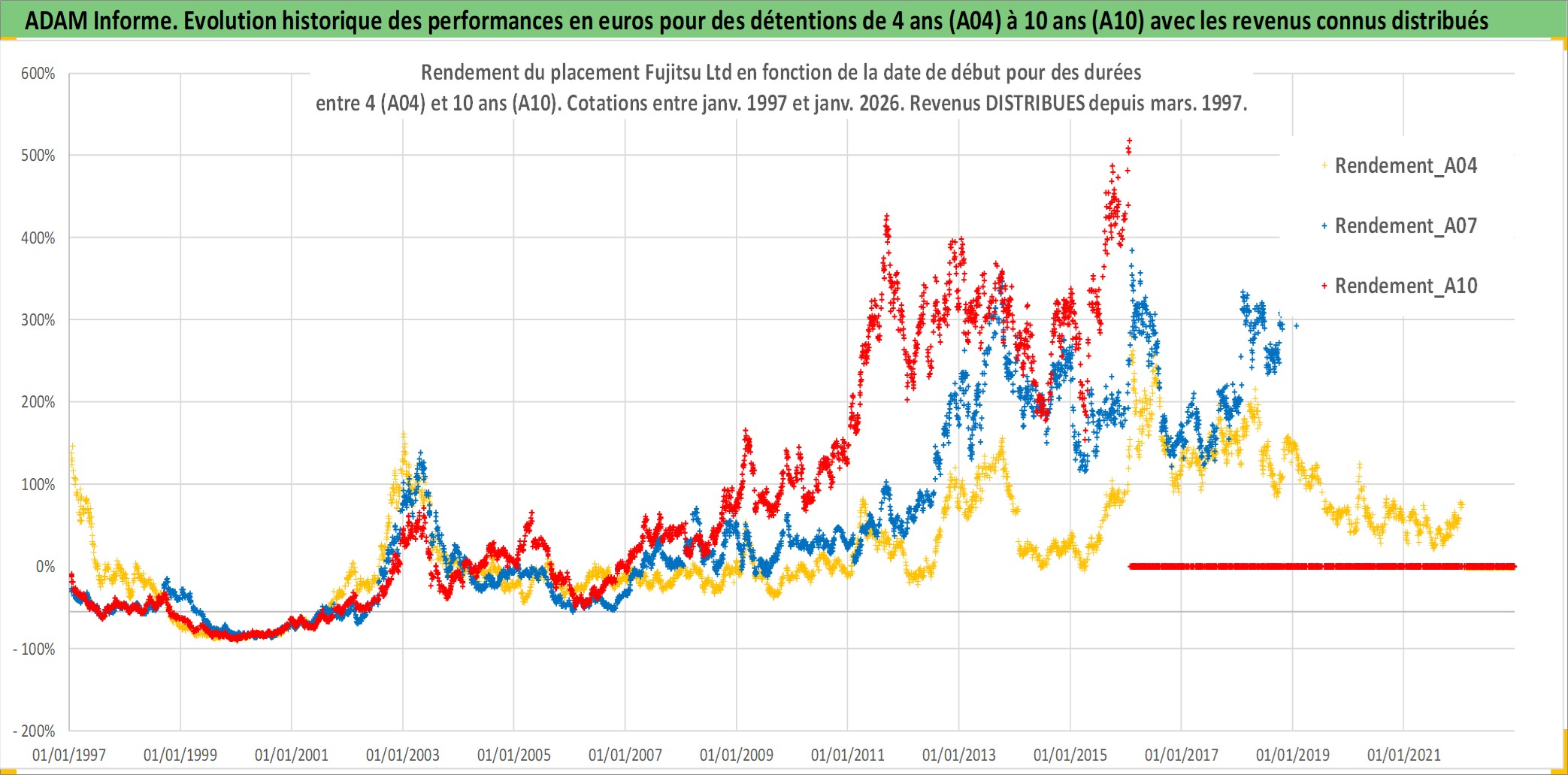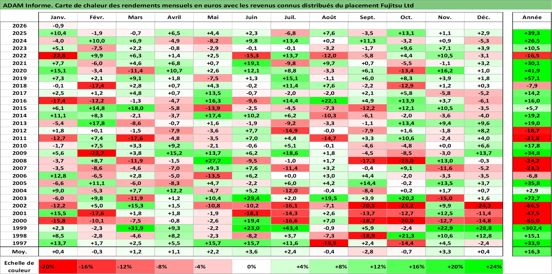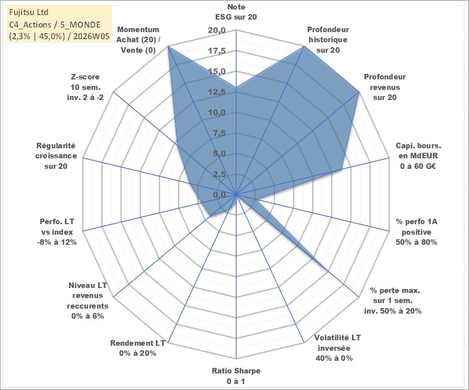 Site dédié aux investisseursPage dédiée sur site financeAnalyse des valorisations hebdomadaires de l'action Fujitsu Ltd. Cet actif est cote en JPY. Les valorisations sont en contrevaleur EURO et couvrent les semaines 1997W01 a 2026W05. Les revenus de cet actif financier sont pris en compte depuis la semaine 1997W13. La note globale ESG de cet actif est estimee a 13.0 (apres rebasage entre 0 et 20).