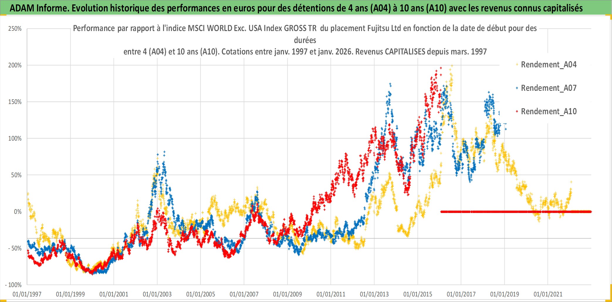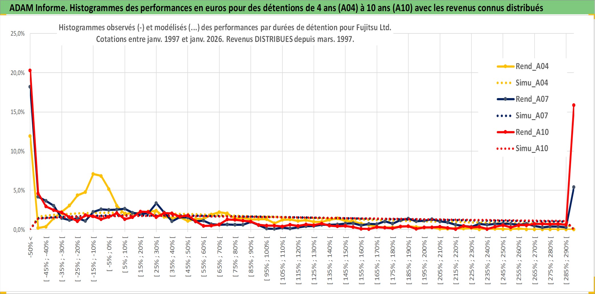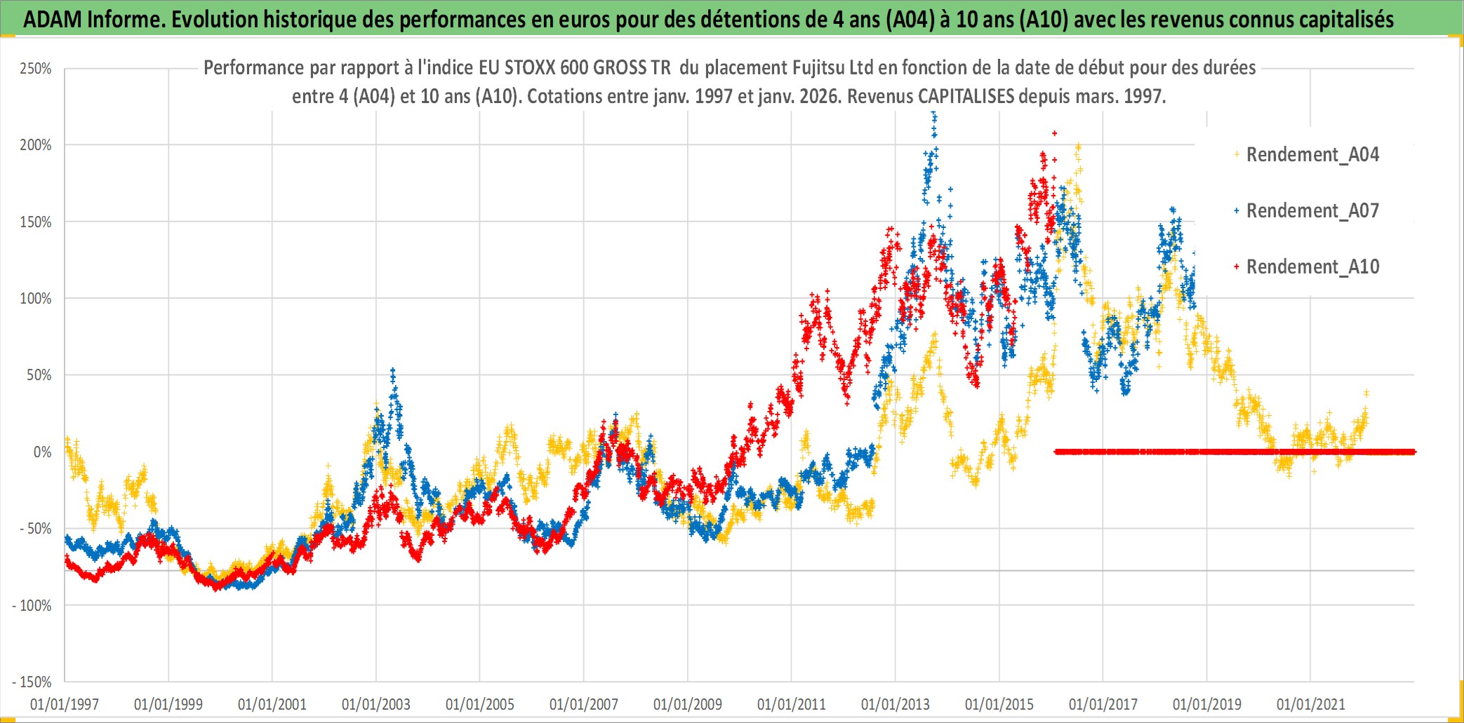 Site dédié aux investisseursPage dédiée sur site financeAnalyse des valorisations hebdomadaires de l'action Fujitsu Ltd. Cet actif est cote en JPY. Les valorisations sont en contrevaleur EURO et couvrent les semaines 1997W01 a 2026W05. Les revenus de cet actif financier sont pris en compte depuis la semaine 1997W13. La note globale ESG de cet actif est estimee a 13.0 (apres rebasage entre 0 et 20).