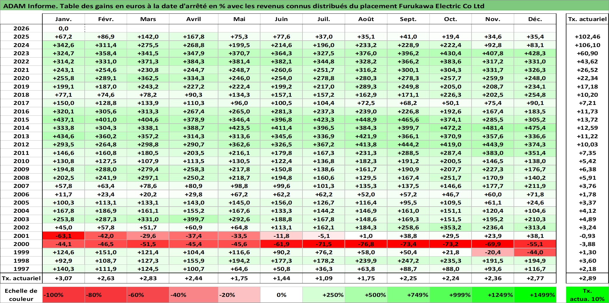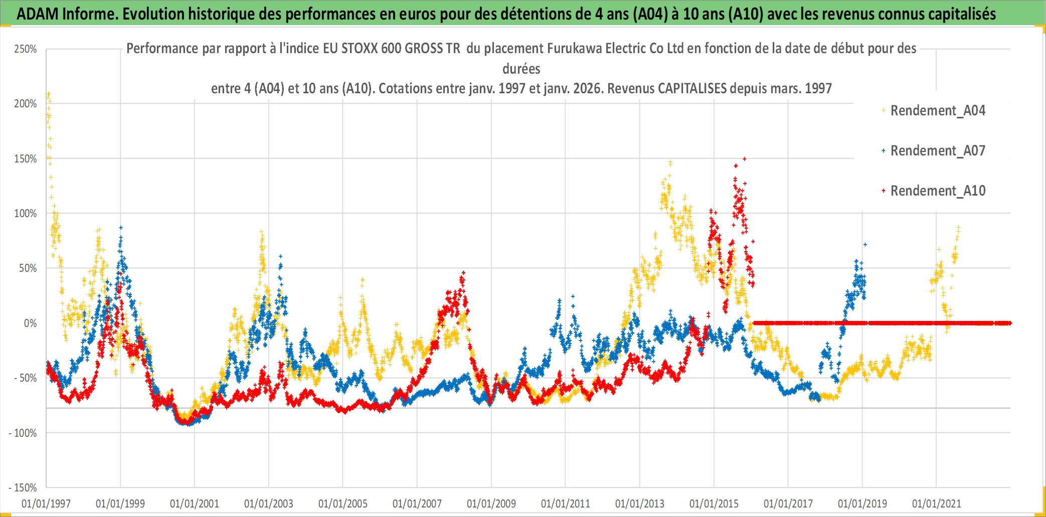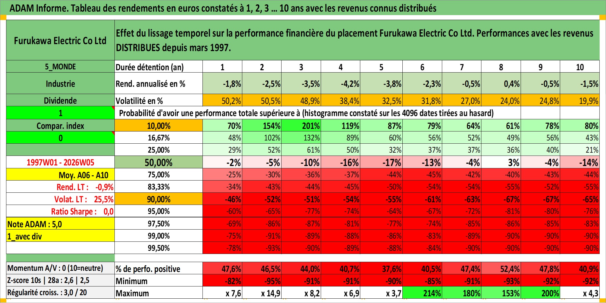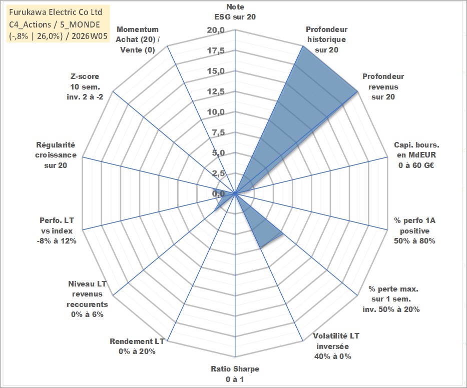 Site dédié aux investisseursPage dédiée sur site financeAnalyse des valorisations hebdomadaires de l'action Furukawa Electric Co Ltd. Cet actif est cote en JPY. Les valorisations sont en contrevaleur EURO et couvrent les semaines 1997W01 a 2026W05. Les revenus de cet actif financier sont pris en compte depuis la semaine 1997W13. La note ESG de cet actif n'est pas connue.