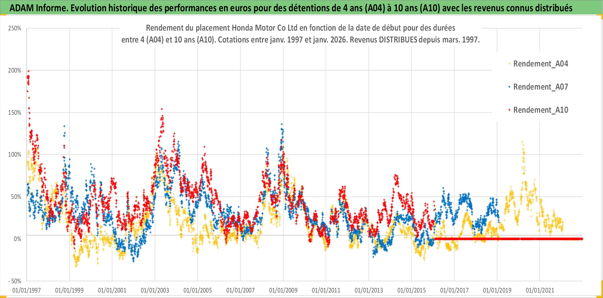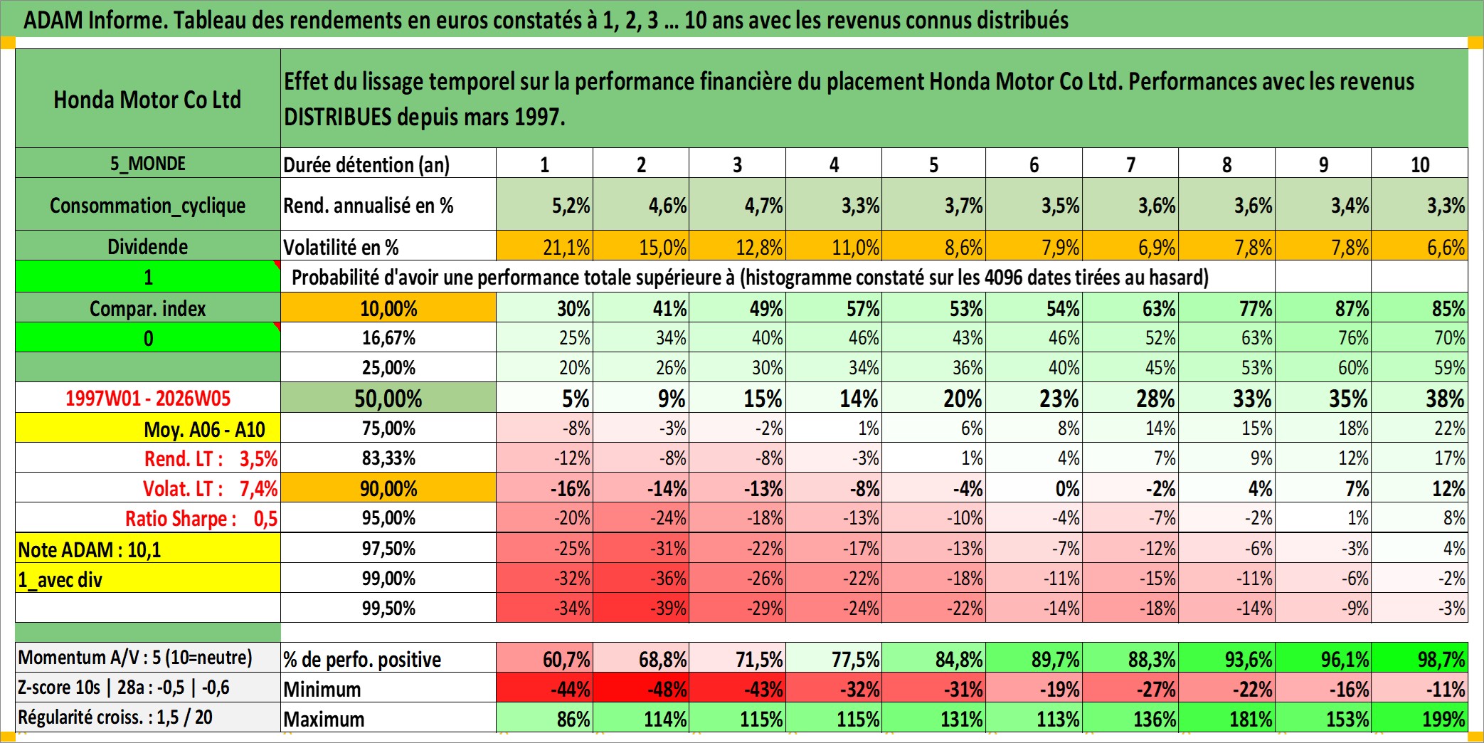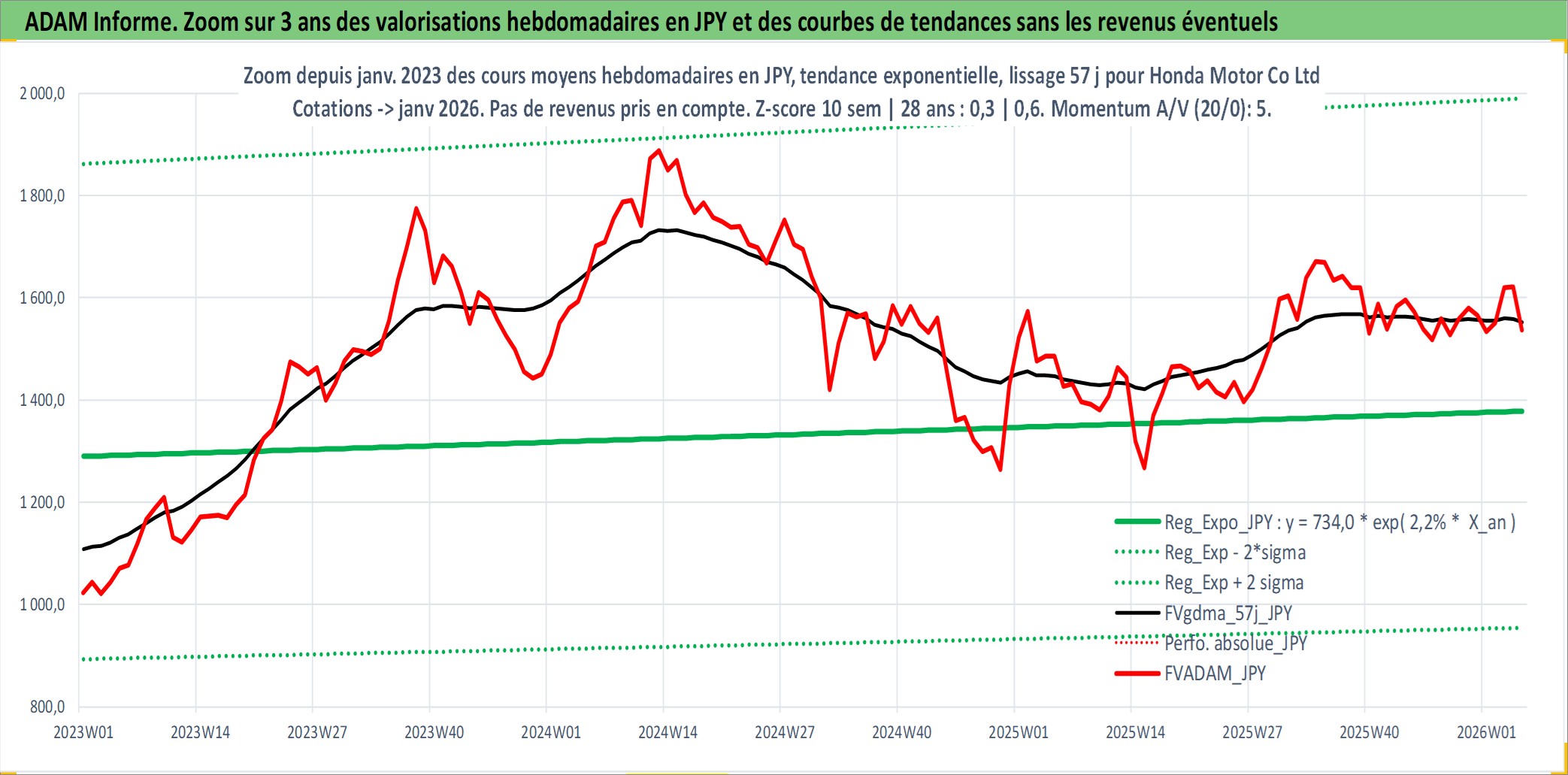 Site dédié aux investisseursPage dédiée sur site financeAnalyse des valorisations hebdomadaires de l'action Honda Motor Co Ltd. Cet actif est cote en JPY. Les valorisations sont en contrevaleur EURO et couvrent les semaines 1997W01 a 2026W05. Les revenus de cet actif financier sont pris en compte depuis la semaine 1997W13. La note globale ESG de cet actif est estimee a 6.0 (apres rebasage entre 0 et 20).