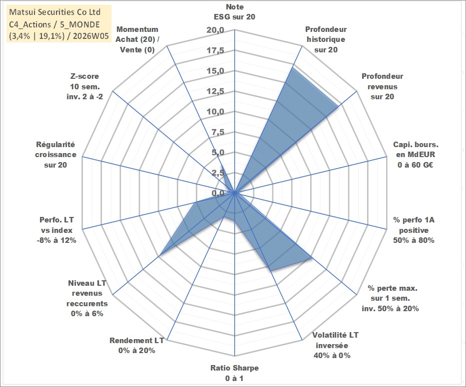Site dédié aux investisseursPage dédiée sur site financeAnalyse des valorisations hebdomadaires de l'action Matsui Securities Co Ltd. Cet actif est cote en JPY. Les valorisations sont en contrevaleur EURO et couvrent les semaines 2001W32 a 2026W05. Les revenus de cet actif financier sont pris en compte depuis la semaine 2002W13. La note ESG de cet actif n'est pas connue.