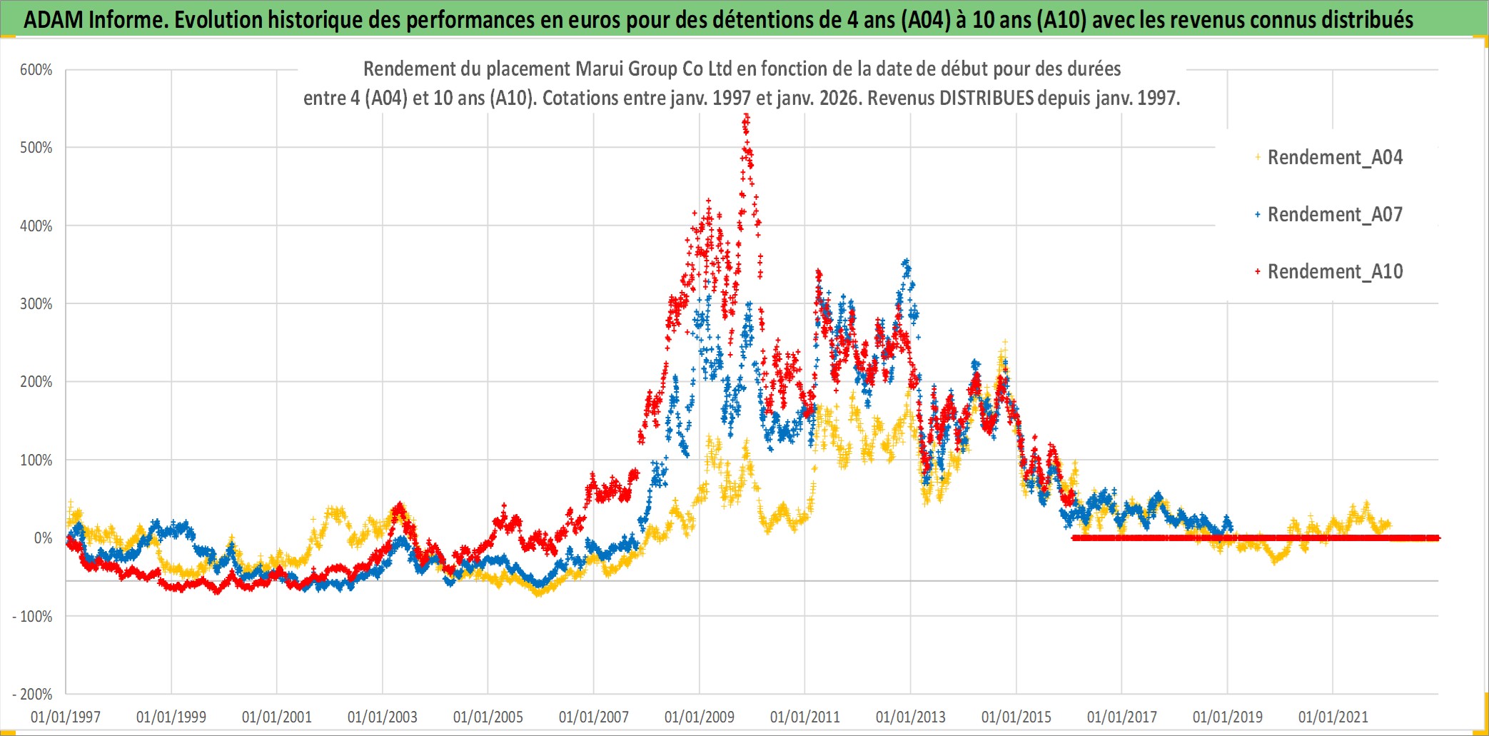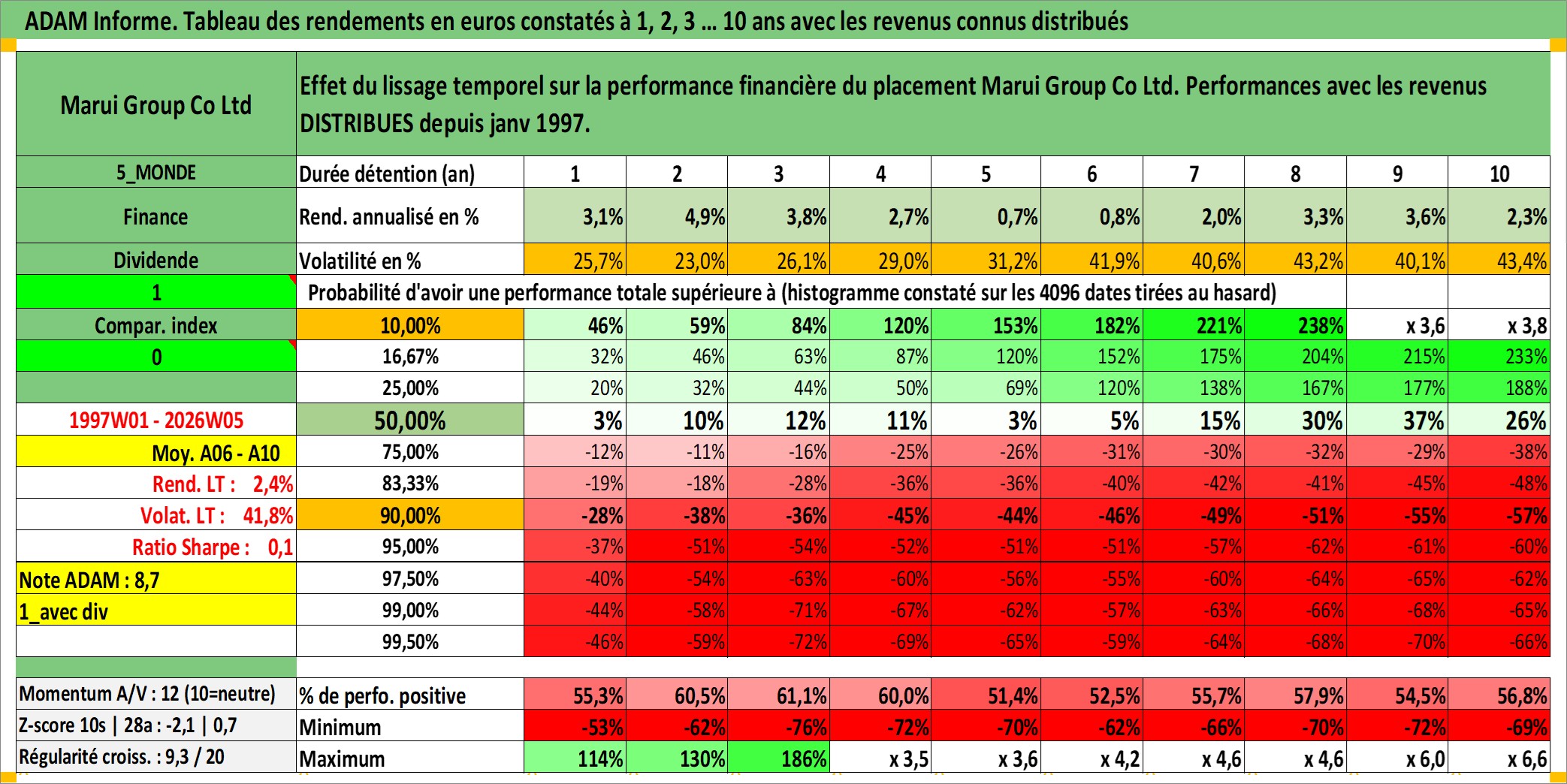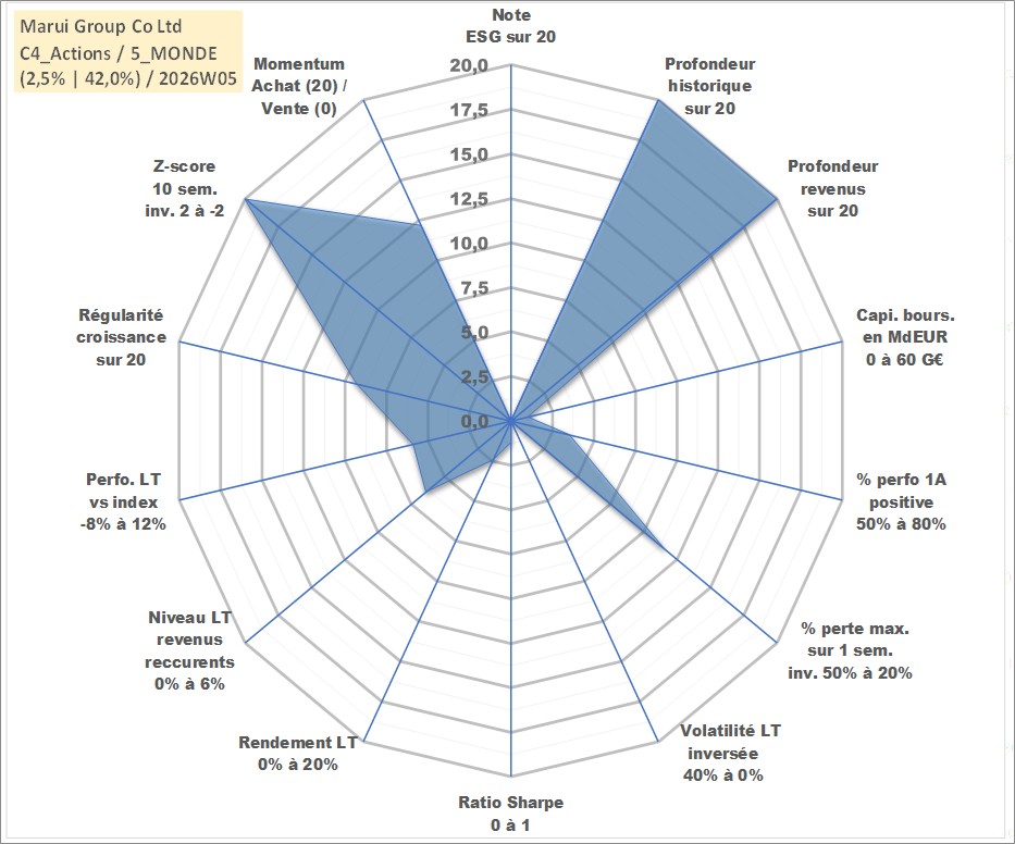 Site dédié aux investisseursPage dédiée sur site financeAnalyse des valorisations hebdomadaires de l'action Marui Group Co Ltd. Cet actif est cote en JPY. Les valorisations sont en contrevaleur EURO et couvrent les semaines 1997W01 a 2026W05. Les revenus de cet actif financier sont pris en compte depuis la semaine 1997W05. La note ESG de cet actif n'est pas connue.