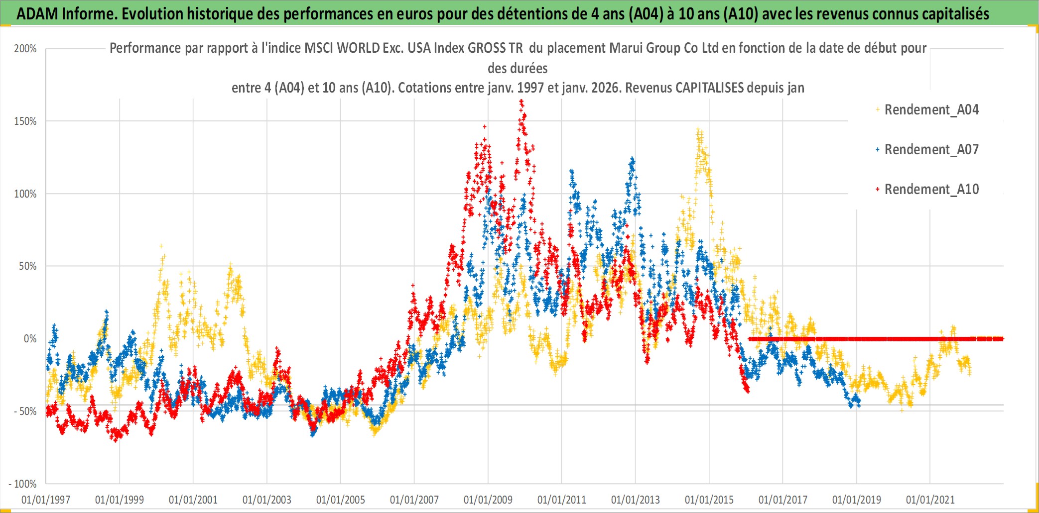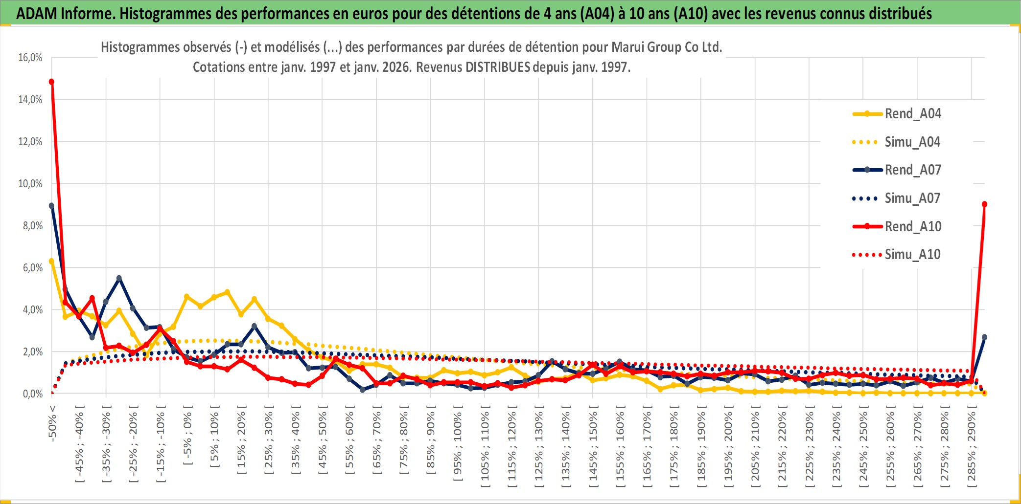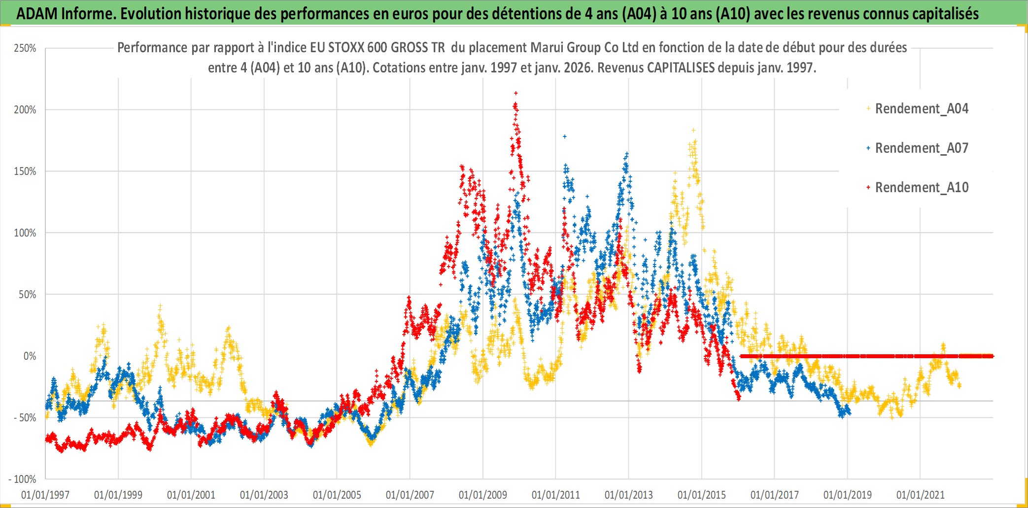 Site dédié aux investisseursPage dédiée sur site financeAnalyse des valorisations hebdomadaires de l'action Marui Group Co Ltd. Cet actif est cote en JPY. Les valorisations sont en contrevaleur EURO et couvrent les semaines 1997W01 a 2026W05. Les revenus de cet actif financier sont pris en compte depuis la semaine 1997W05. La note ESG de cet actif n'est pas connue.