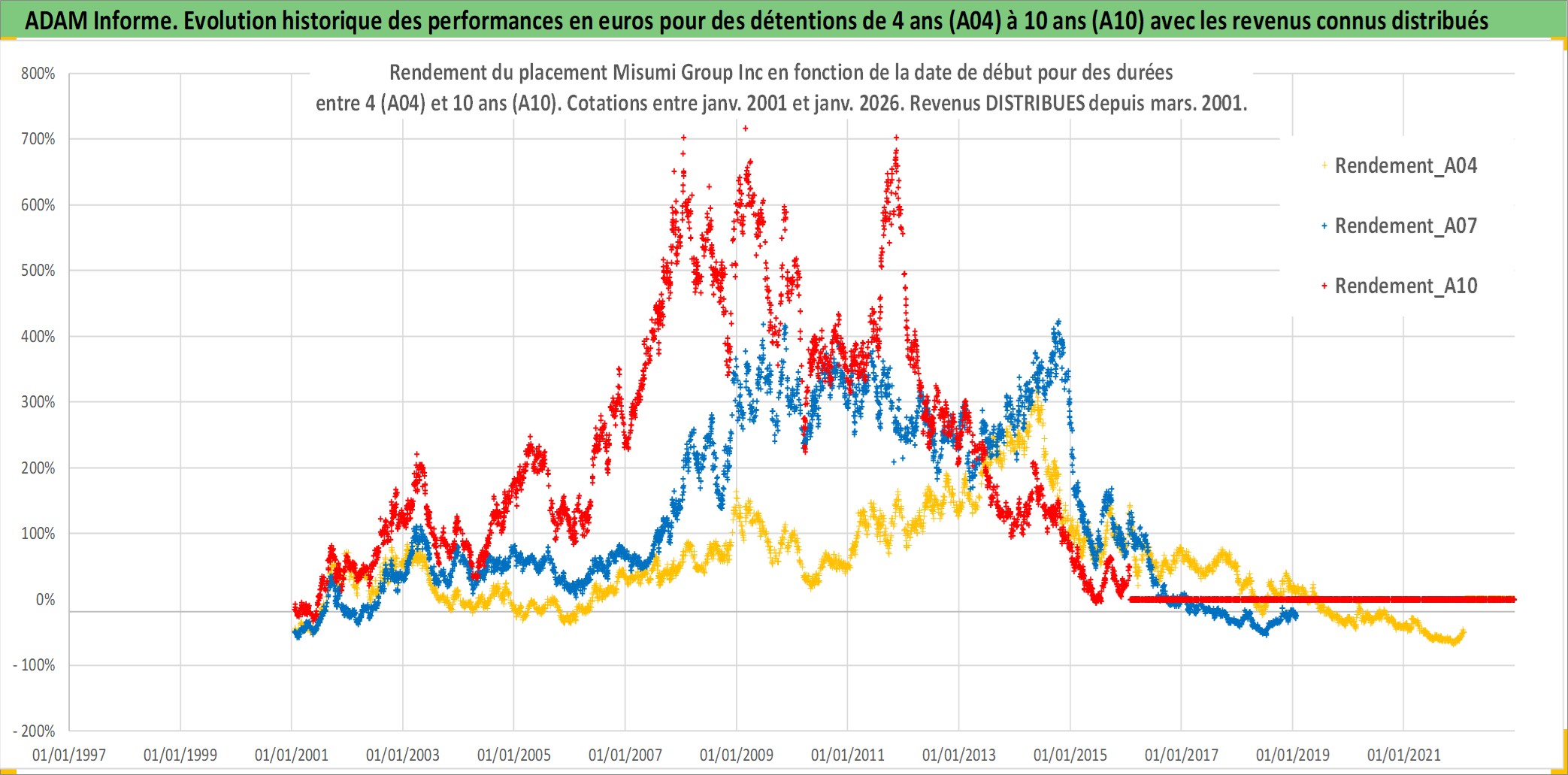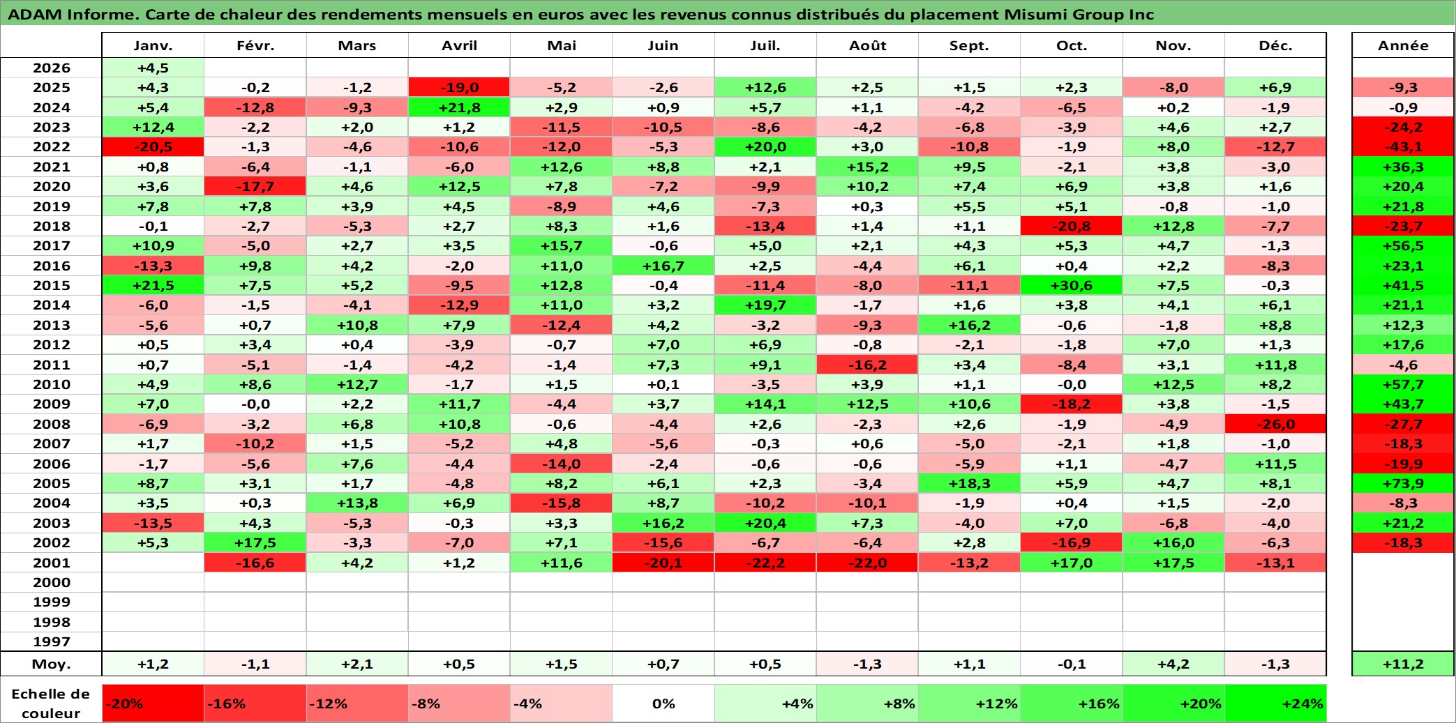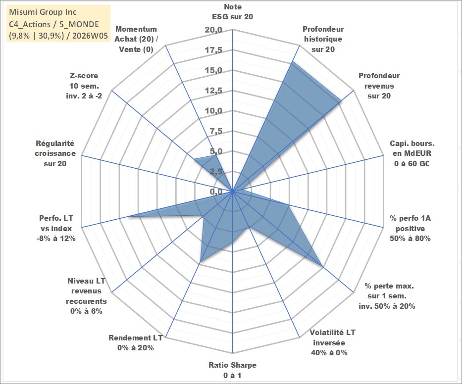Site dédié aux investisseursPage dédiée sur site financeAnalyse des valorisations hebdomadaires de l'action Misumi Group Inc. Cet actif est cote en JPY. Les valorisations sont en contrevaleur EURO et couvrent les semaines 2001W02 a 2026W05. Les revenus de cet actif financier sont pris en compte depuis la semaine 2001W13. La note ESG de cet actif n'est pas connue.
