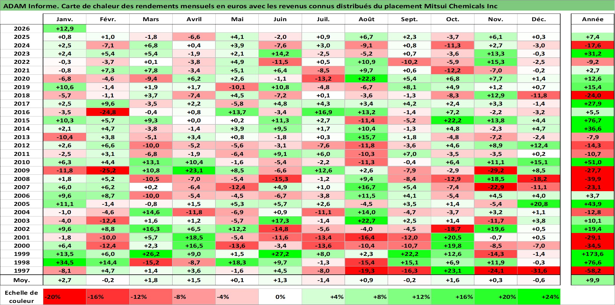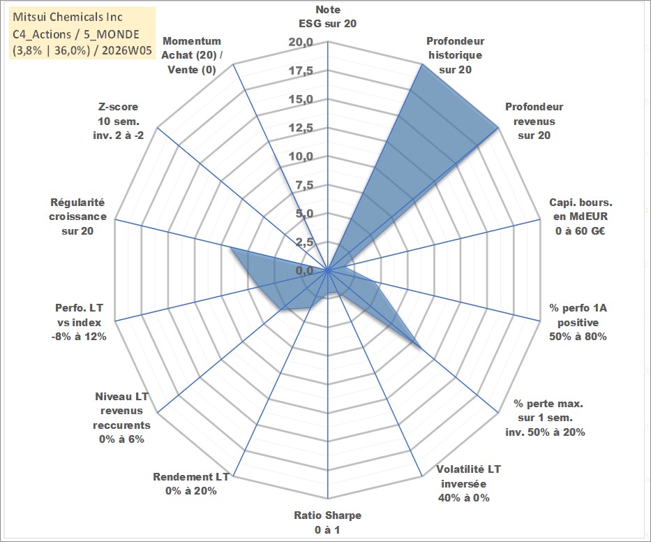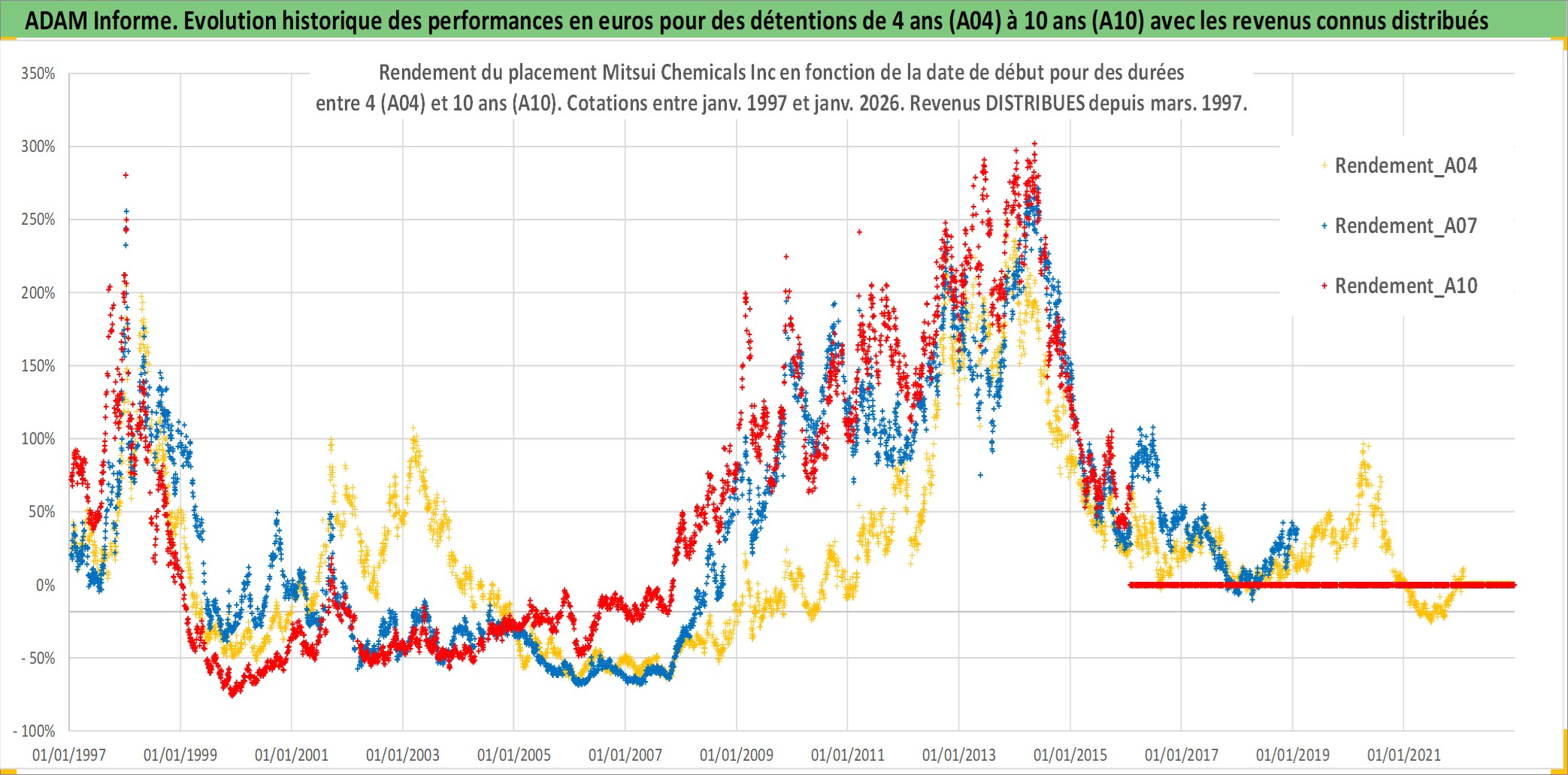Site dédié aux investisseursPage dédiée sur site financeAnalyse des valorisations hebdomadaires de l'action Mitsui Chemicals Inc. Cet actif est cote en JPY. Les valorisations sont en contrevaleur EURO et couvrent les semaines 1997W01 a 2026W05. Les revenus de cet actif financier sont pris en compte depuis la semaine 1997W13. La note ESG de cet actif n'est pas connue.