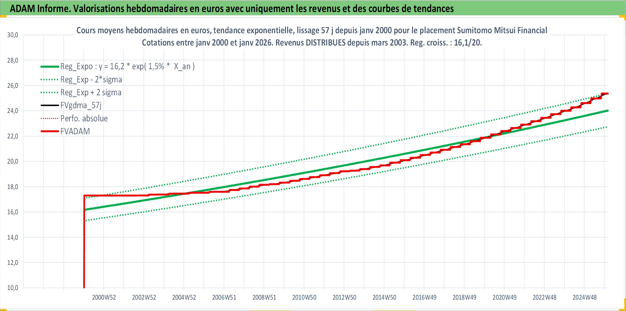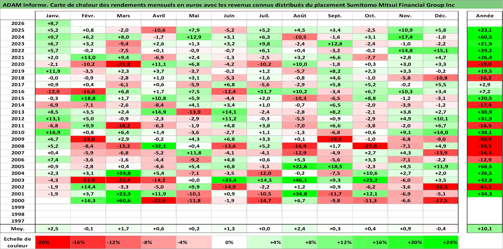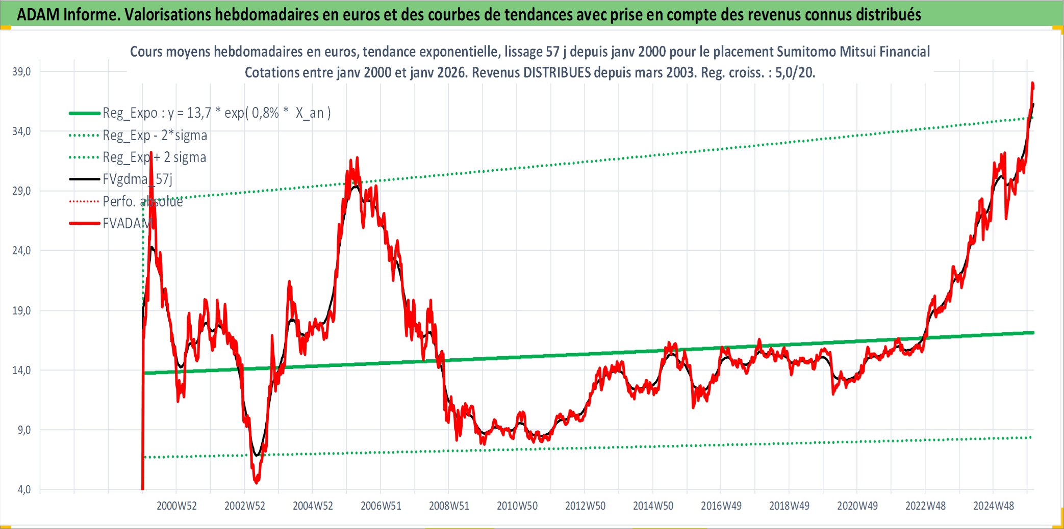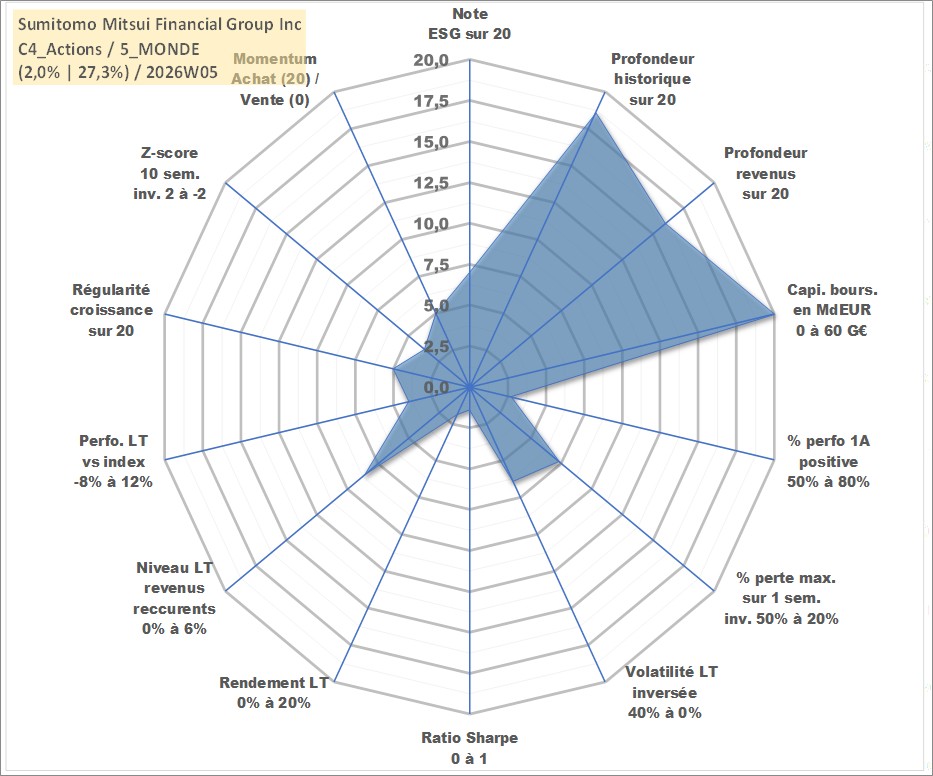 Site dédié aux investisseursPage dédiée sur site financeAnalyse des valorisations hebdomadaires de l'action Sumitomo Mitsui Financial Group Inc. Cet actif est cote en JPY. Les valorisations sont en contrevaleur EURO et couvrent les semaines 2000W01 a 2026W05. Les revenus de cet actif financier sont pris en compte depuis la semaine 2003W13. La note globale ESG de cet actif est estimee a 7.0 (apres rebasage entre 0 et 20).