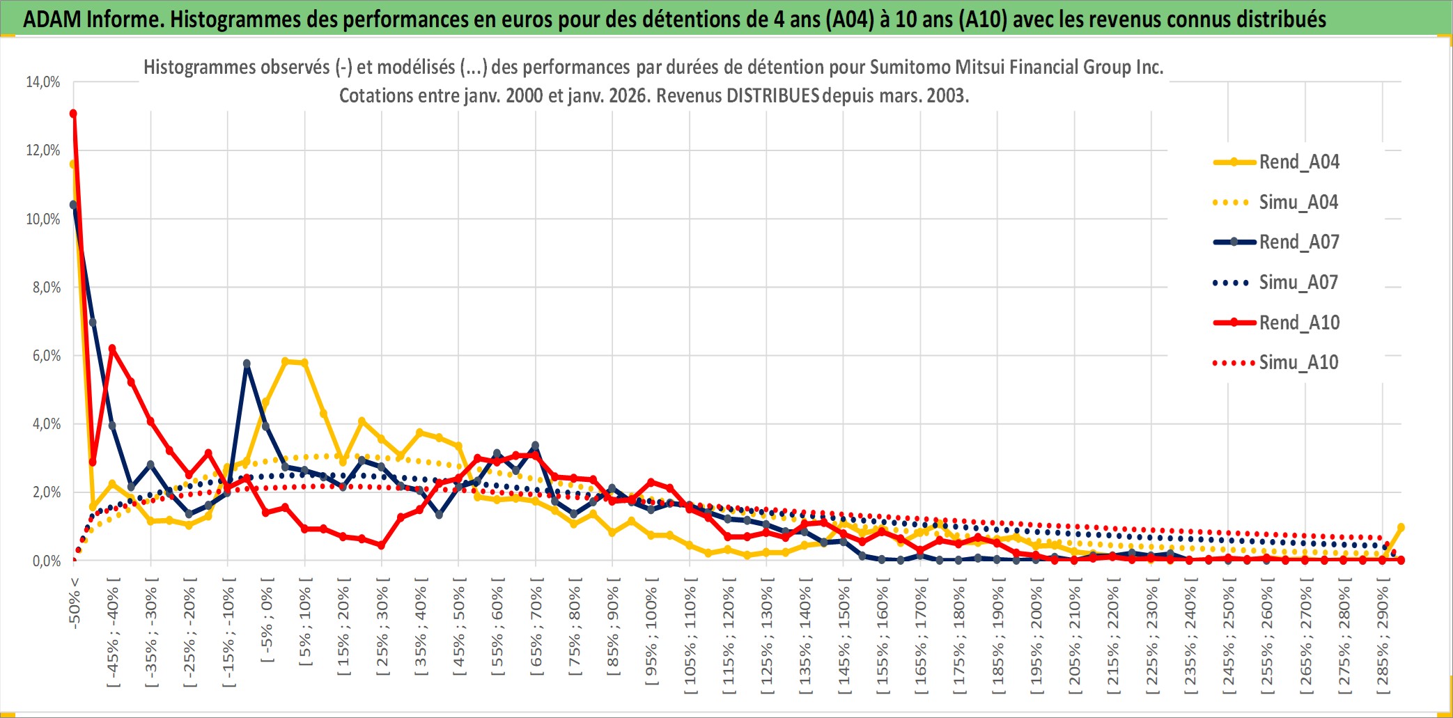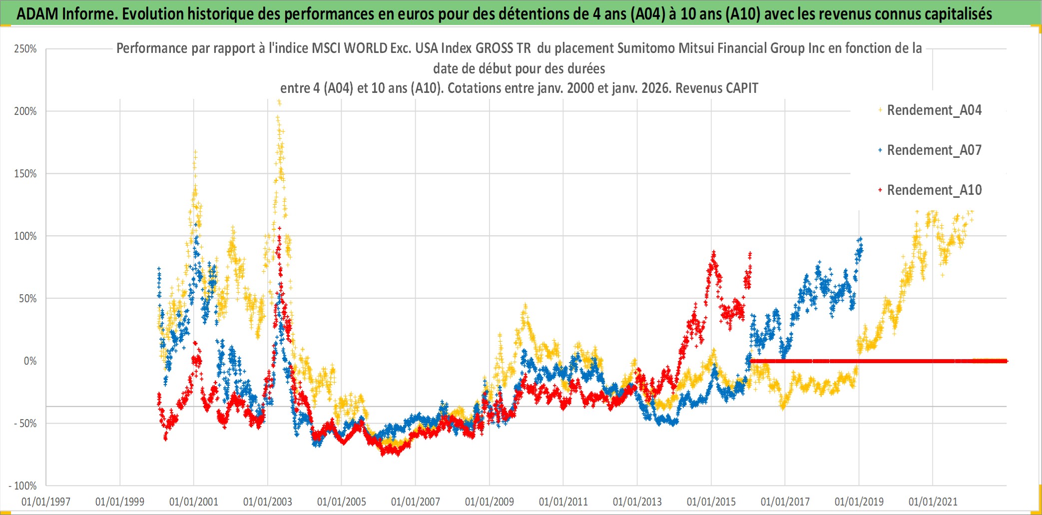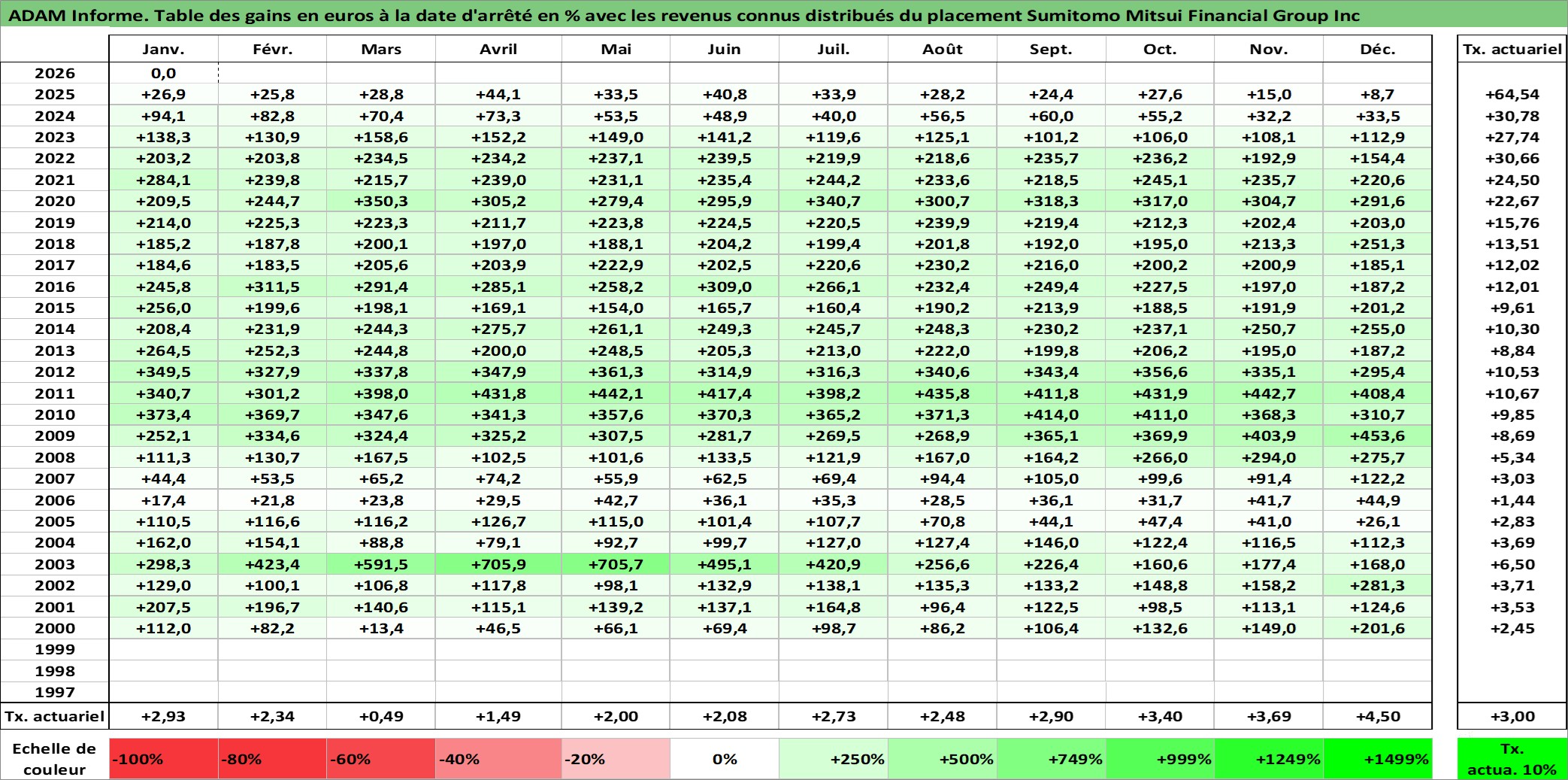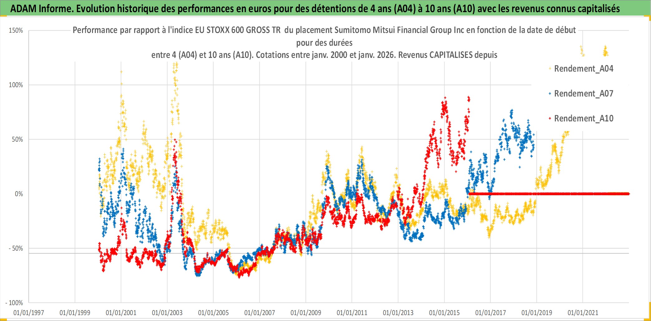 Site dédié aux investisseursPage dédiée sur site financeAnalyse des valorisations hebdomadaires de l'action Sumitomo Mitsui Financial Group Inc. Cet actif est cote en JPY. Les valorisations sont en contrevaleur EURO et couvrent les semaines 2000W01 a 2026W05. Les revenus de cet actif financier sont pris en compte depuis la semaine 2003W13. La note globale ESG de cet actif est estimee a 7.0 (apres rebasage entre 0 et 20).