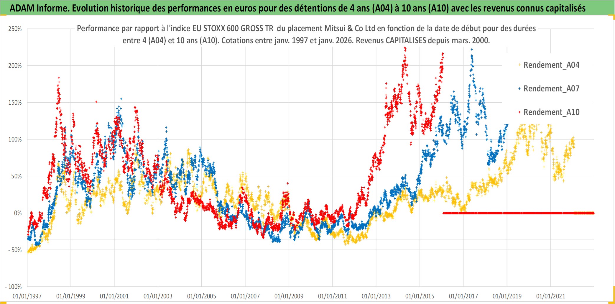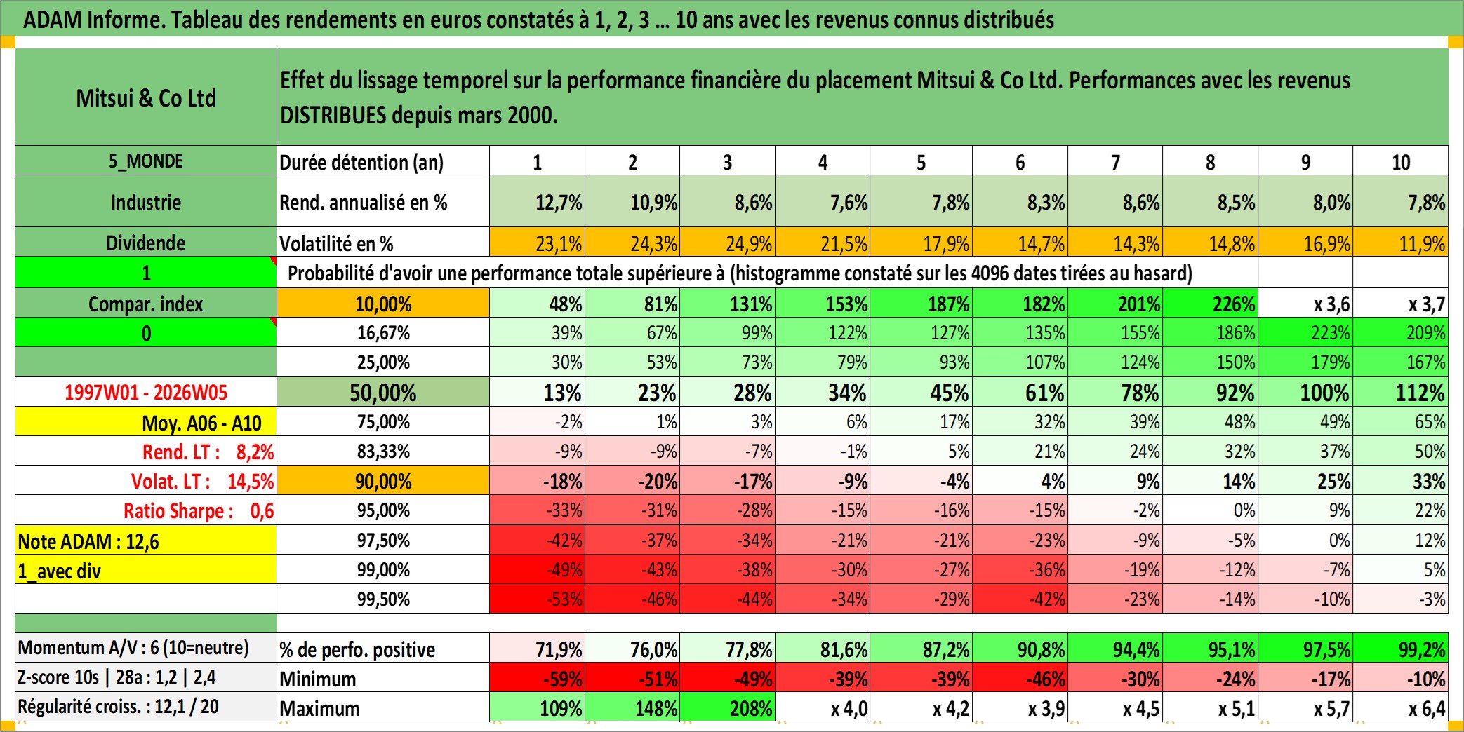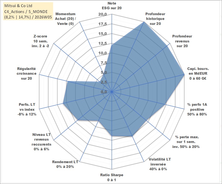 Site dédié aux investisseursPage dédiée sur site financeAnalyse des valorisations hebdomadaires de l'action Mitsui & Co Ltd. Cet actif est cote en JPY. Les valorisations sont en contrevaleur EURO et couvrent les semaines 1997W01 a 2026W05. Les revenus de cet actif financier sont pris en compte depuis la semaine 2000W13. La note globale ESG de cet actif est estimee a 12.0 (apres rebasage entre 0 et 20).