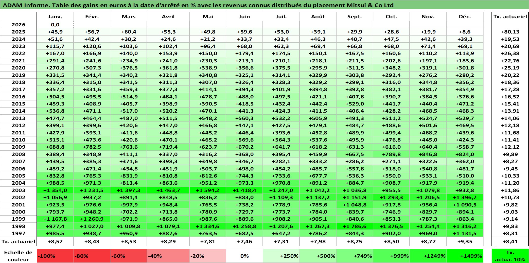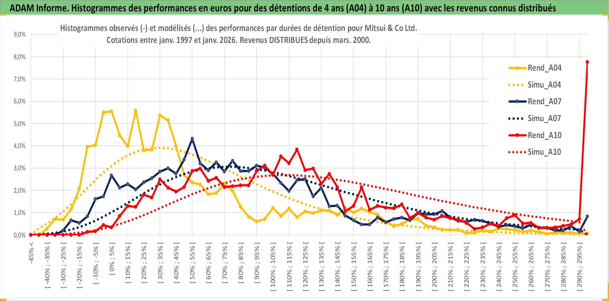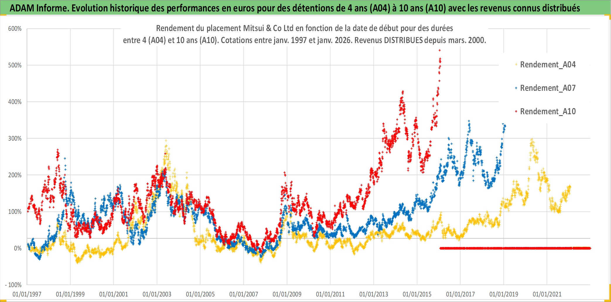 Site dédié aux investisseursPage dédiée sur site financeAnalyse des valorisations hebdomadaires de l'action Mitsui & Co Ltd. Cet actif est cote en JPY. Les valorisations sont en contrevaleur EURO et couvrent les semaines 1997W01 a 2026W05. Les revenus de cet actif financier sont pris en compte depuis la semaine 2000W13. La note globale ESG de cet actif est estimee a 12.0 (apres rebasage entre 0 et 20).