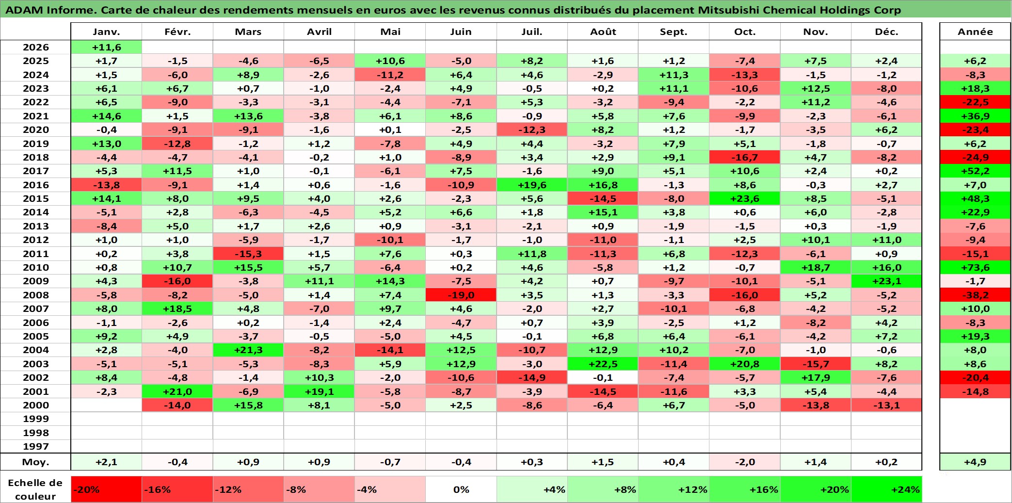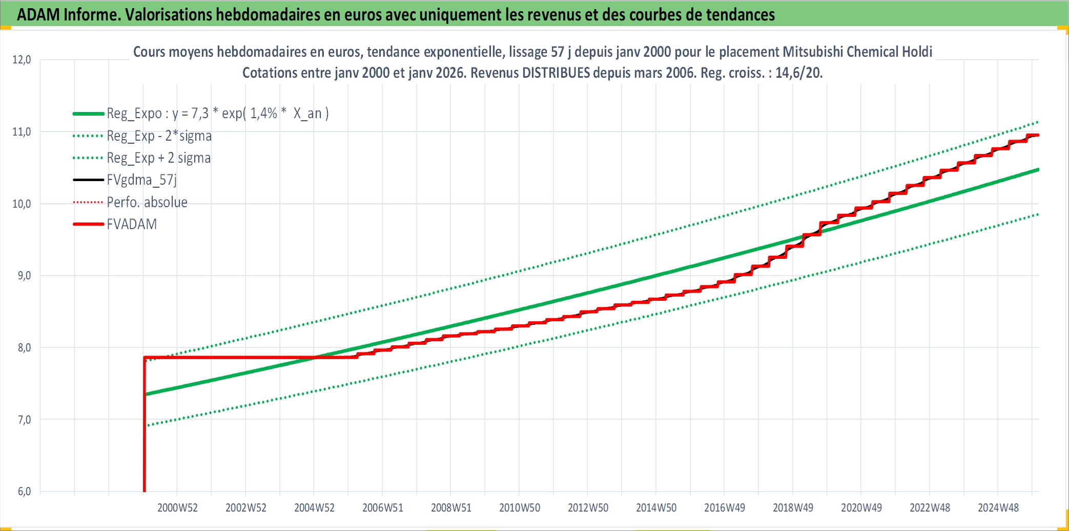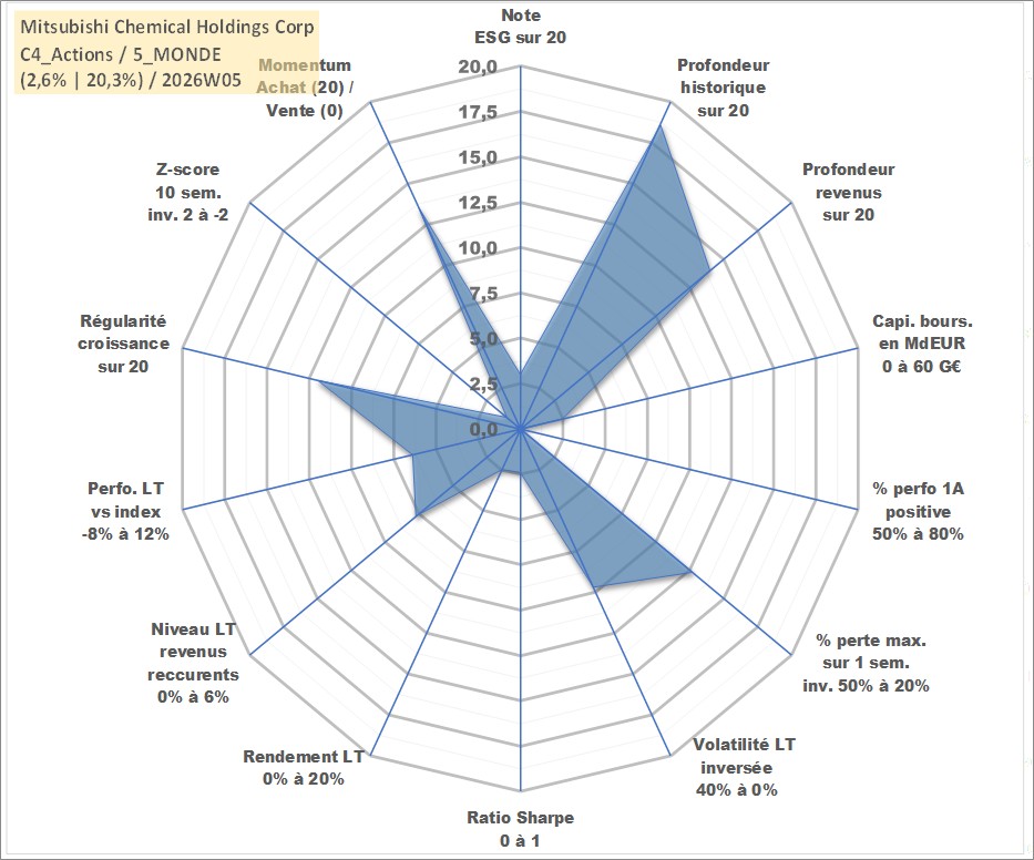Site dédié aux investisseursPage dédiée sur site financeAnalyse des valorisations hebdomadaires de l'action Mitsubishi Chemical Holdings Corp. Cet actif est cote en JPY. Les valorisations sont en contrevaleur EURO et couvrent les semaines 2000W02 a 2026W05. Les revenus de cet actif financier sont pris en compte depuis la semaine 2006W13. La note globale ESG de cet actif est estimee a 3.0 (apres rebasage entre 0 et 20).