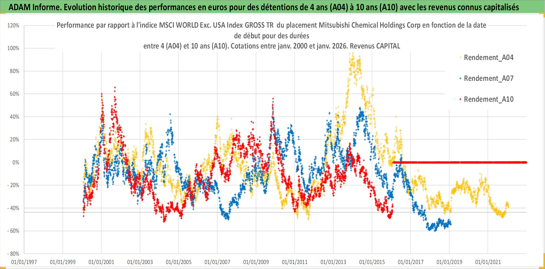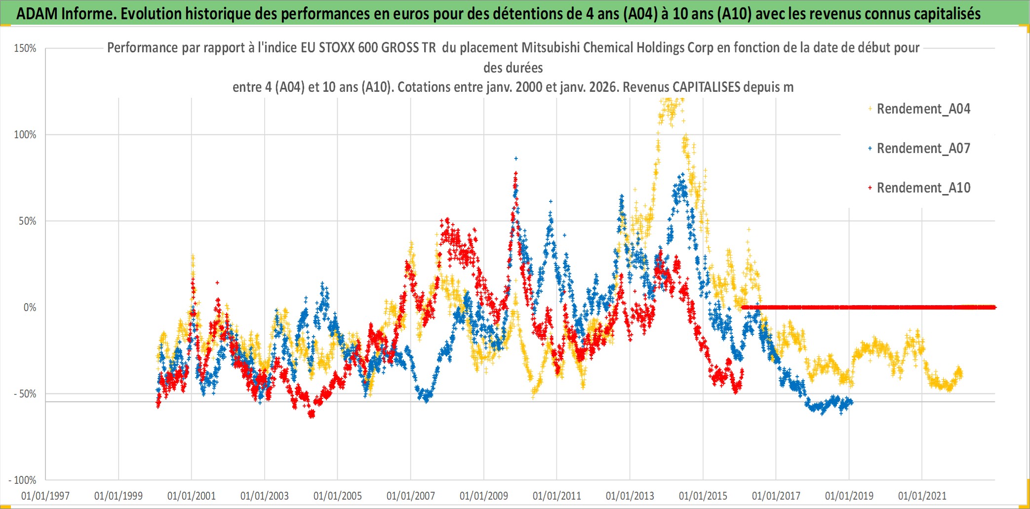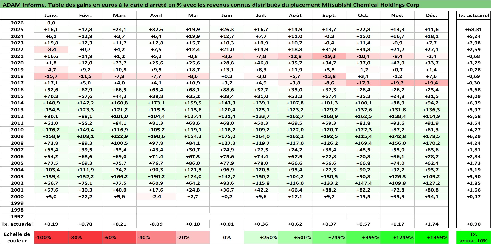 Site dédié aux investisseursPage dédiée sur site financeAnalyse des valorisations hebdomadaires de l'action Mitsubishi Chemical Holdings Corp. Cet actif est cote en JPY. Les valorisations sont en contrevaleur EURO et couvrent les semaines 2000W02 a 2026W05. Les revenus de cet actif financier sont pris en compte depuis la semaine 2006W13. La note globale ESG de cet actif est estimee a 3.0 (apres rebasage entre 0 et 20).