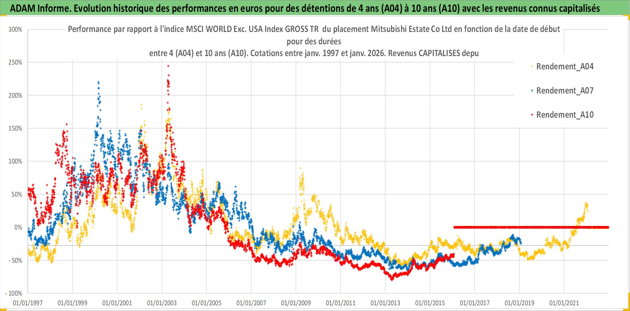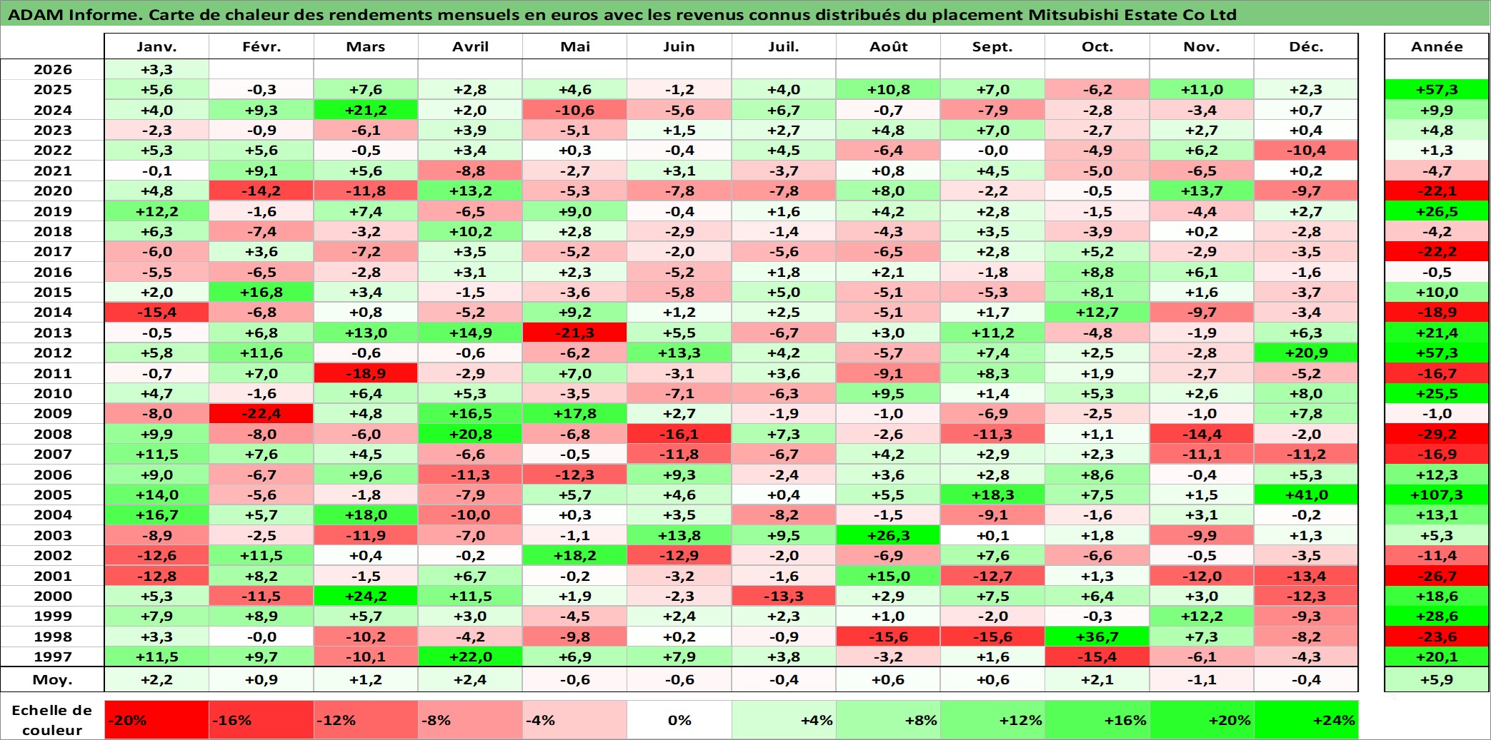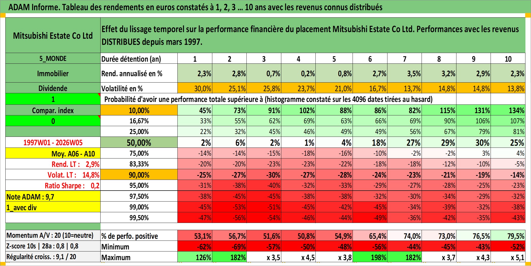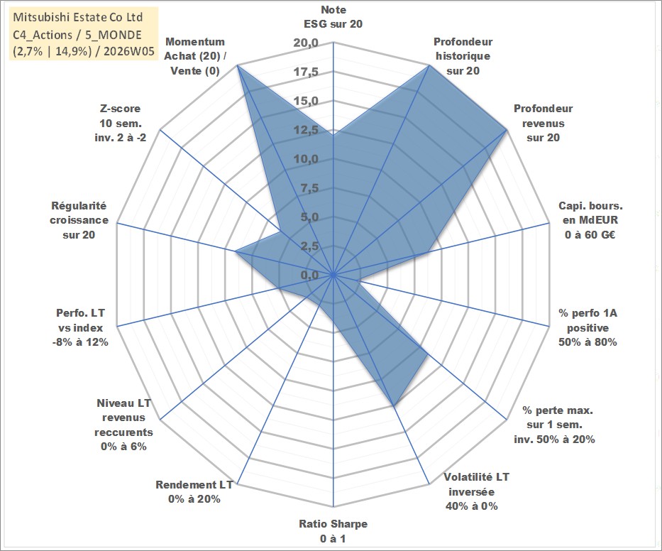 Site dédié aux investisseursPage dédiée sur site financeAnalyse des valorisations hebdomadaires de l'action Mitsubishi Estate Co Ltd. Cet actif est cote en JPY. Les valorisations sont en contrevaleur EURO et couvrent les semaines 1997W01 a 2026W05. Les revenus de cet actif financier sont pris en compte depuis la semaine 1997W13. La note globale ESG de cet actif est estimee a 12.0 (apres rebasage entre 0 et 20).