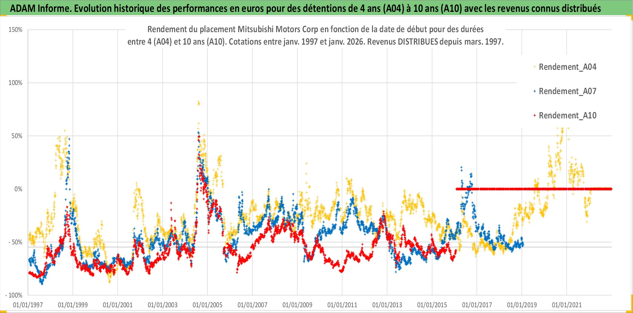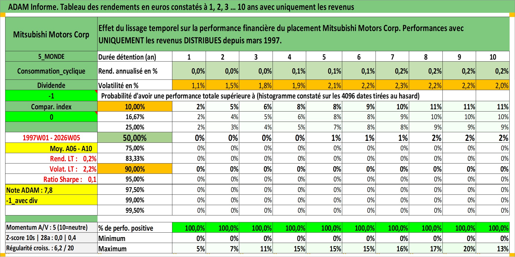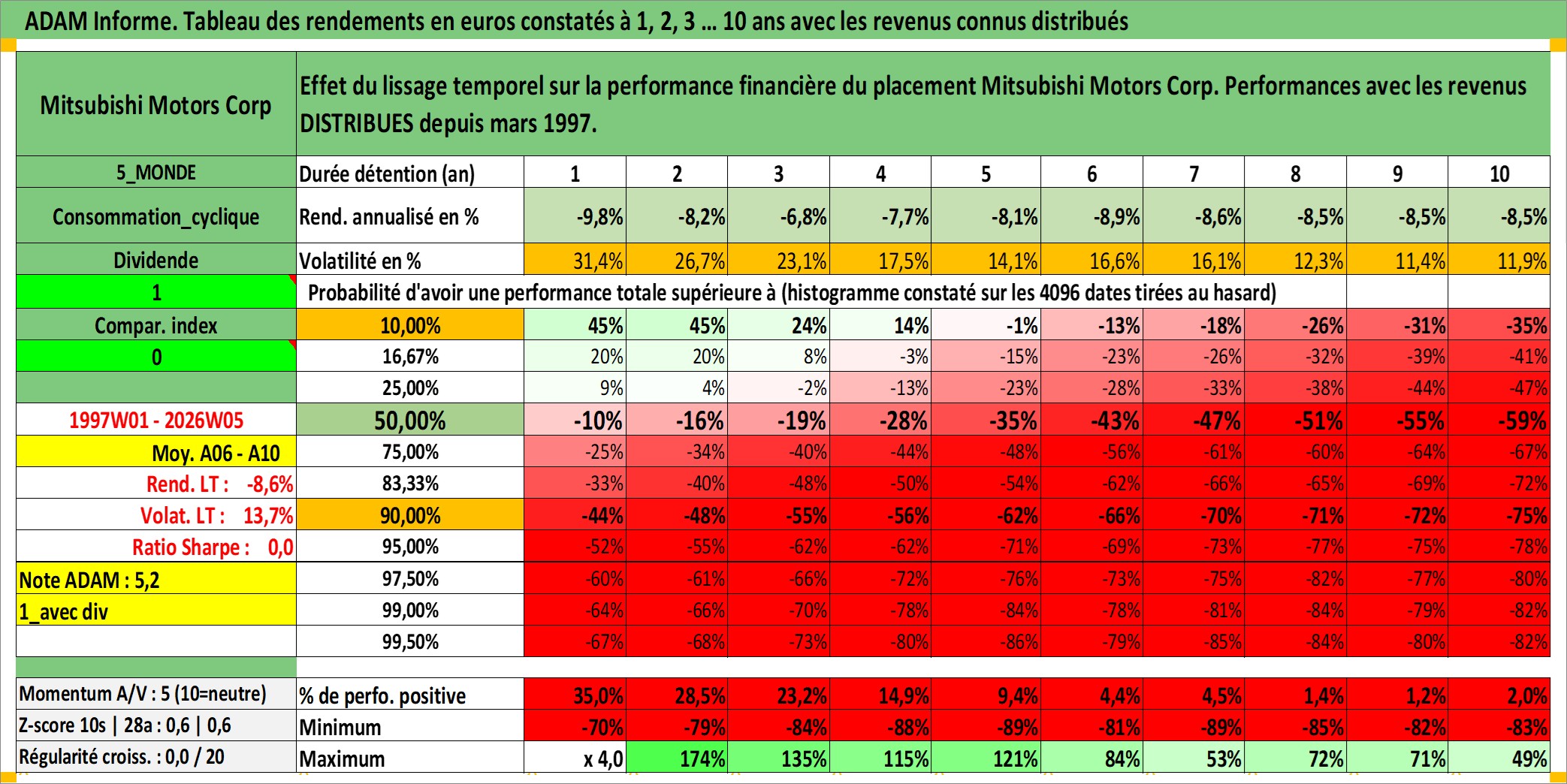 Site dédié aux investisseursPage dédiée sur site financeAnalyse des valorisations hebdomadaires de l'action Mitsubishi Motors Corp. Cet actif est cote en JPY. Les valorisations sont en contrevaleur EURO et couvrent les semaines 1997W01 a 2026W05. Les revenus de cet actif financier sont pris en compte depuis la semaine 1997W13. La note globale ESG de cet actif est estimee a 6.0 (apres rebasage entre 0 et 20).