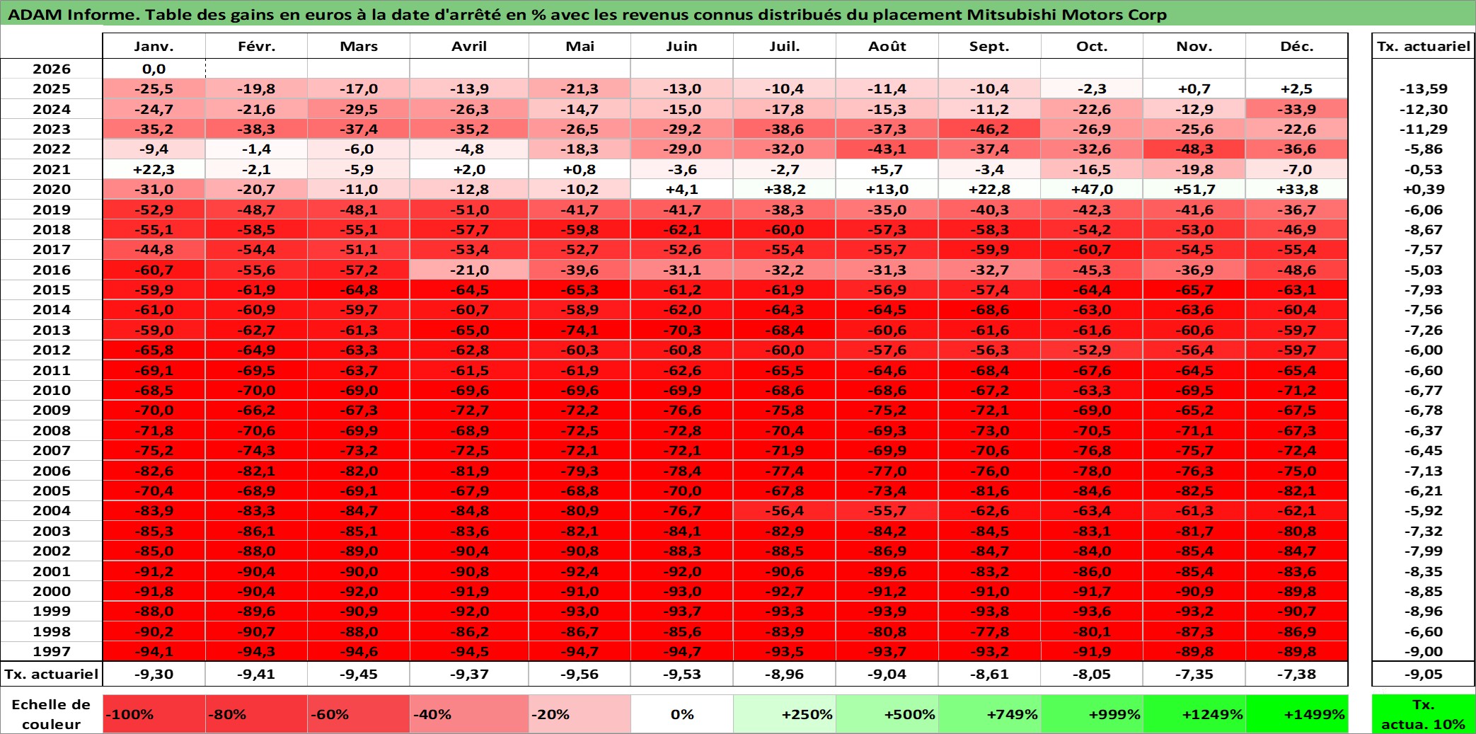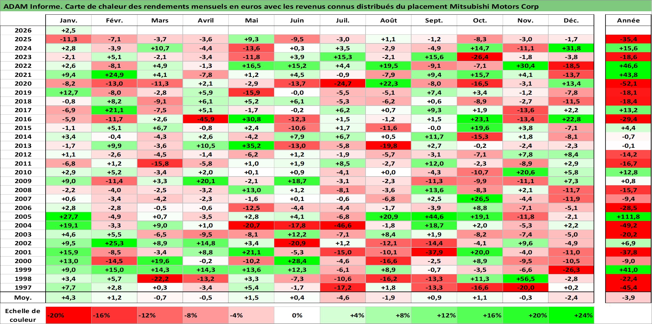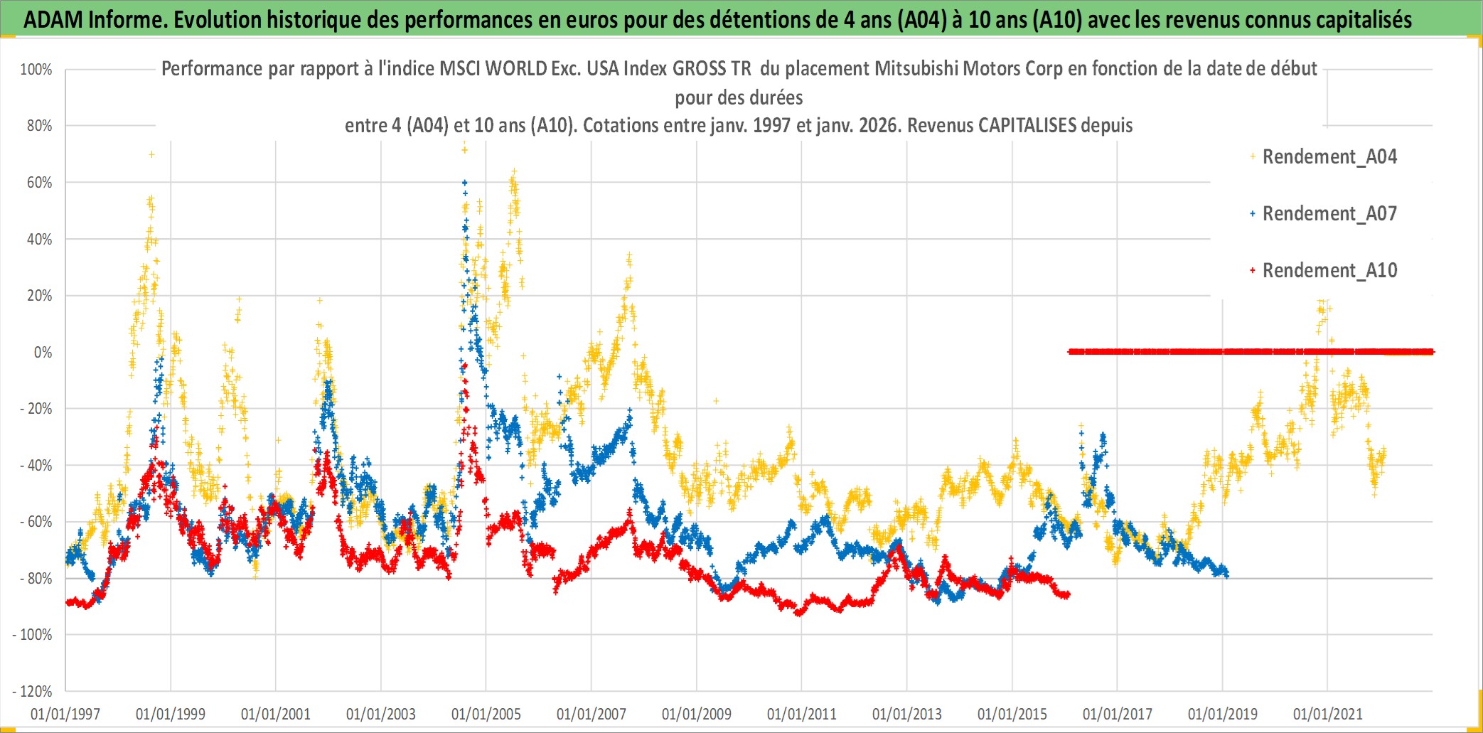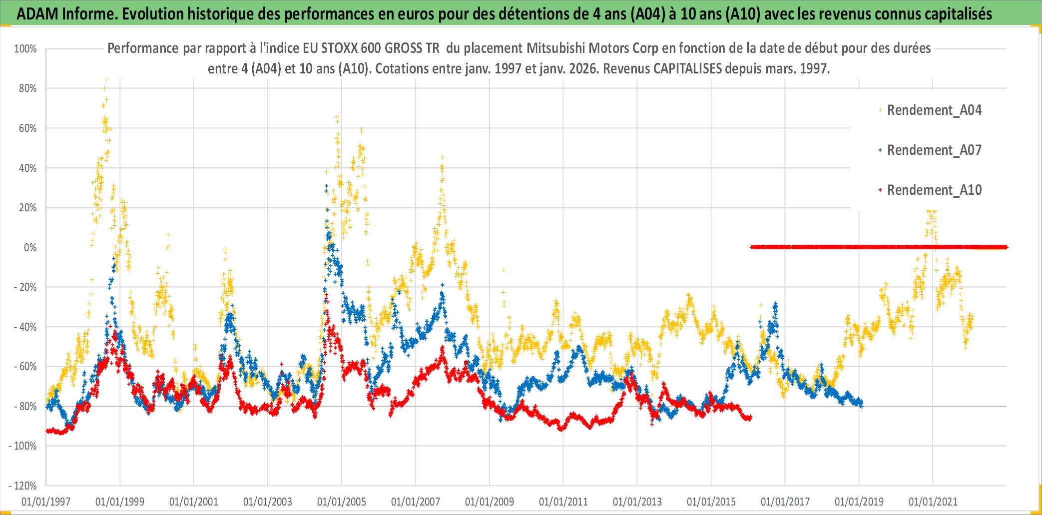 Site dédié aux investisseursPage dédiée sur site financeAnalyse des valorisations hebdomadaires de l'action Mitsubishi Motors Corp. Cet actif est cote en JPY. Les valorisations sont en contrevaleur EURO et couvrent les semaines 1997W01 a 2026W05. Les revenus de cet actif financier sont pris en compte depuis la semaine 1997W13. La note globale ESG de cet actif est estimee a 6.0 (apres rebasage entre 0 et 20).