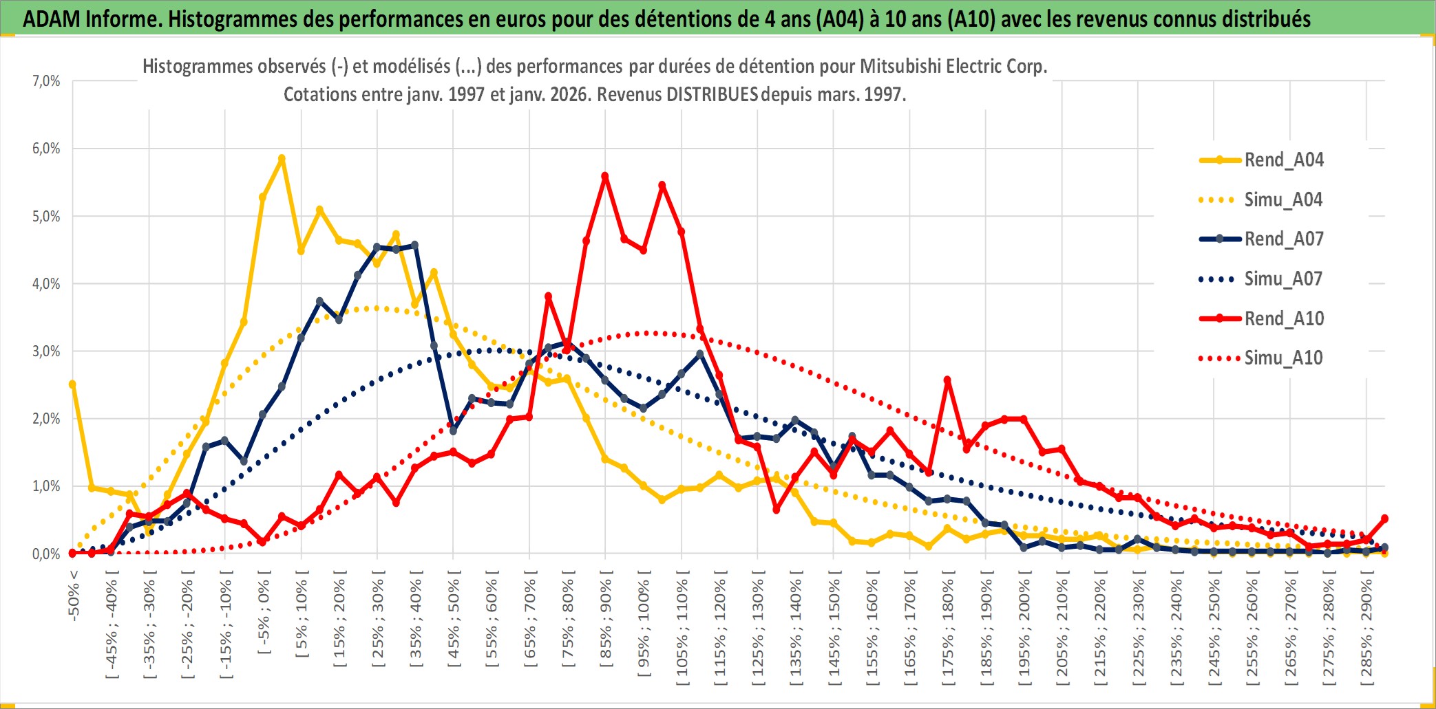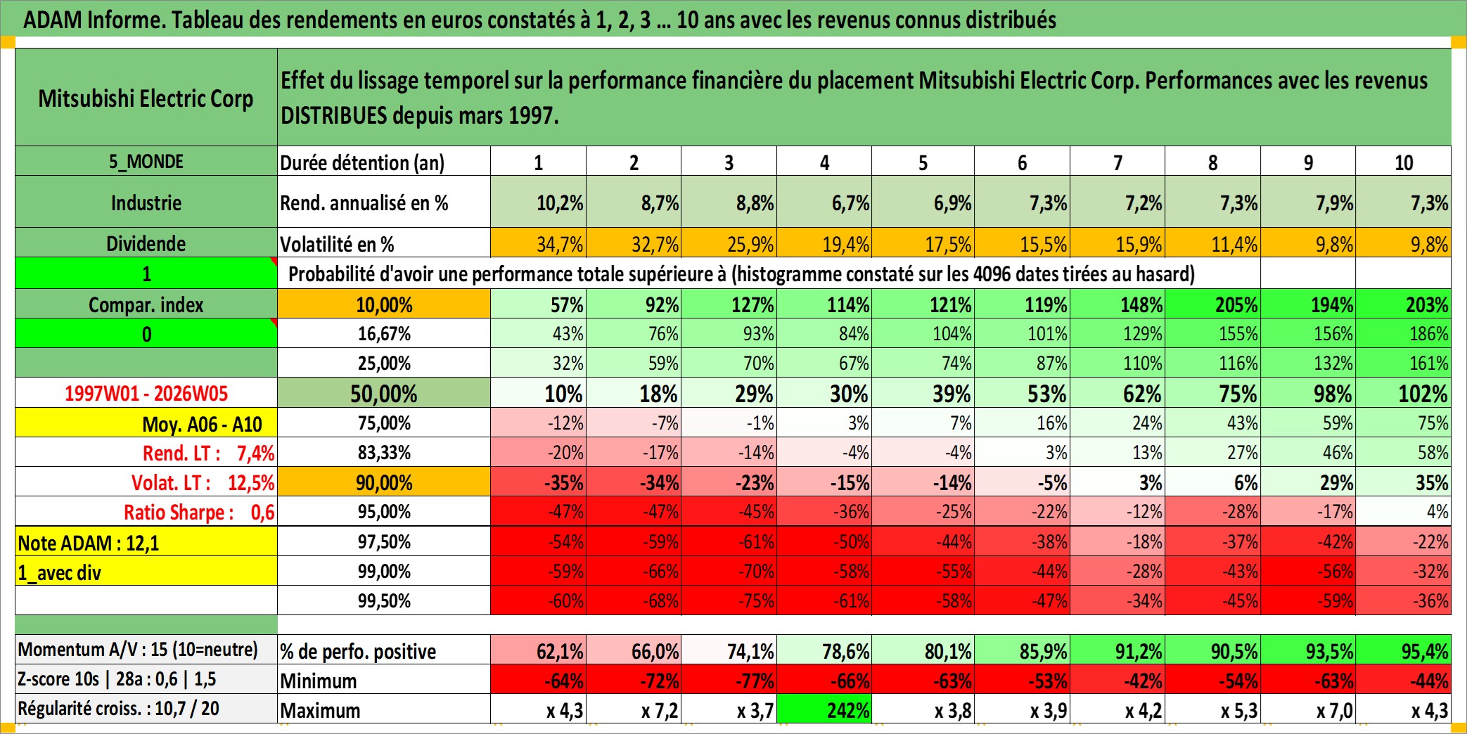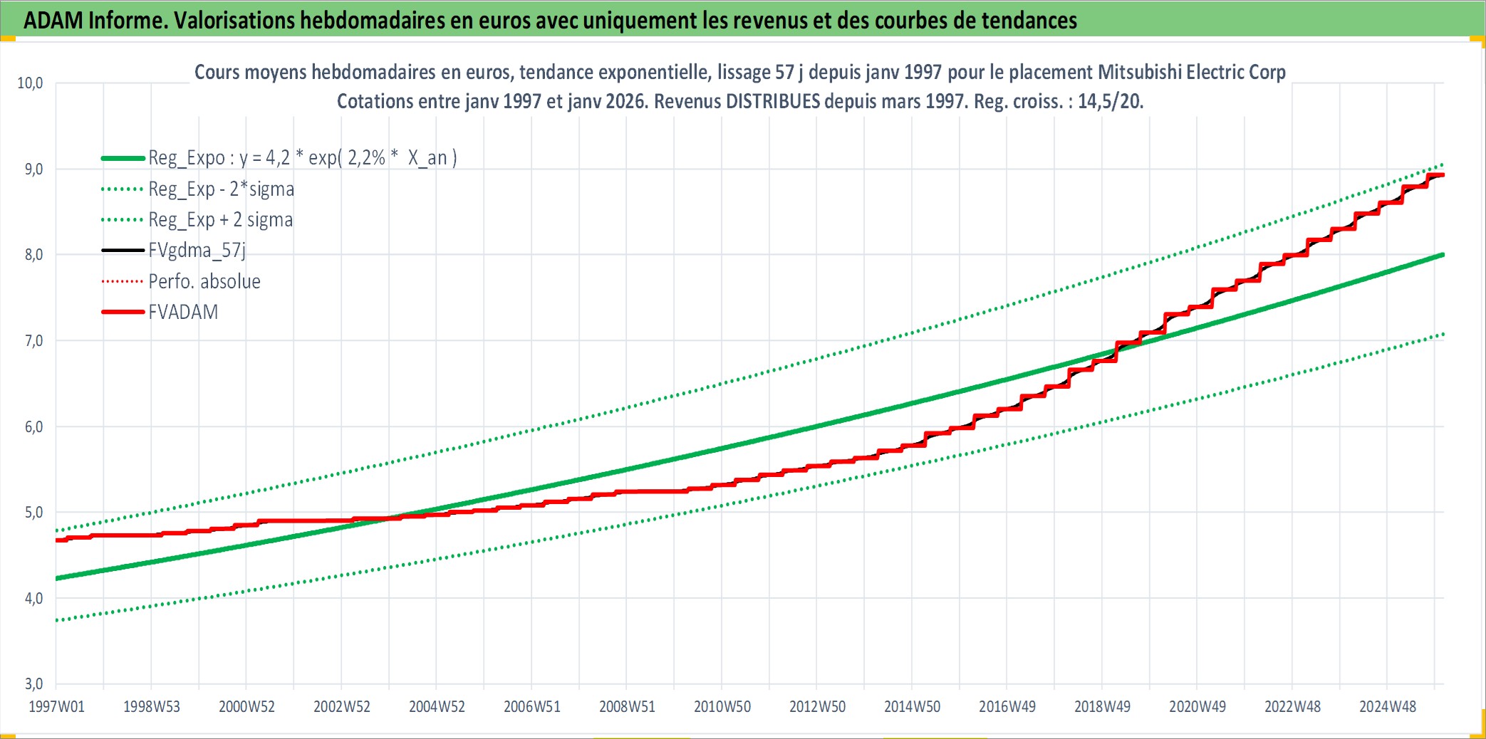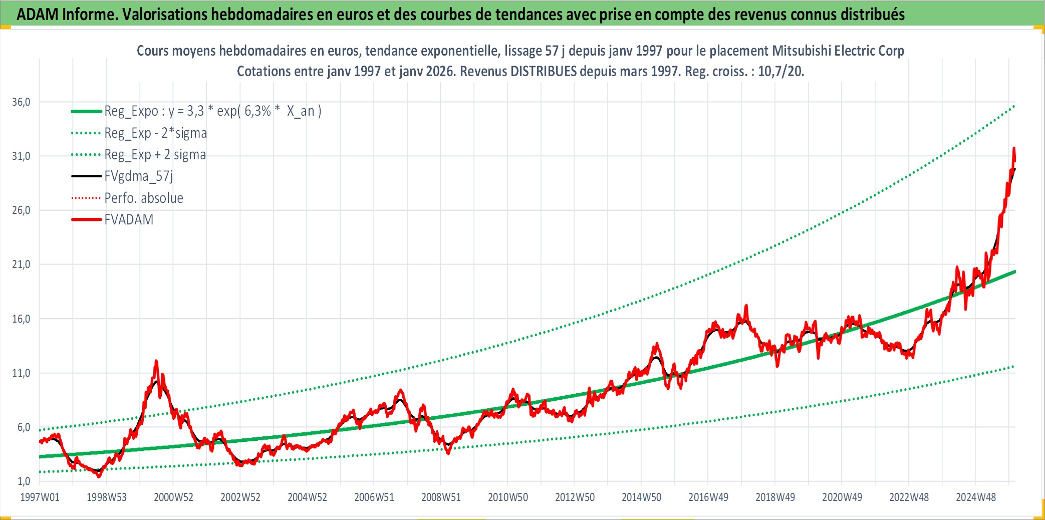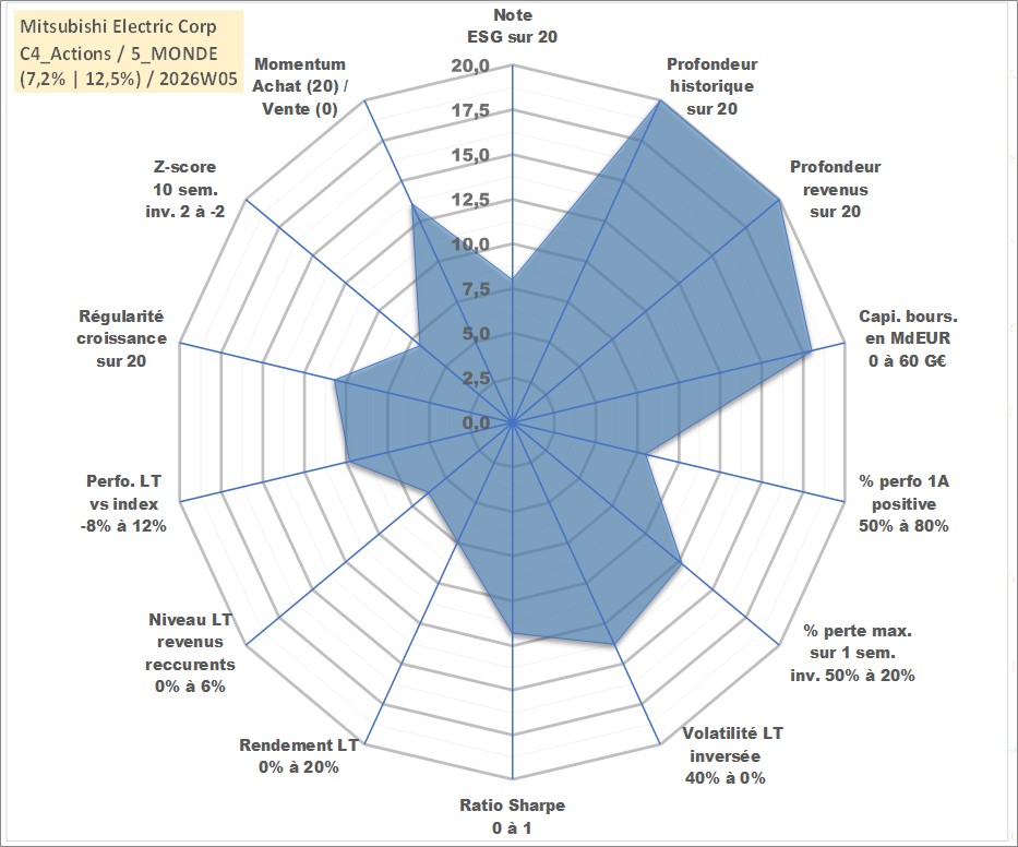 Site dédié aux investisseursPage dédiée sur site financeAnalyse des valorisations hebdomadaires de l'action Mitsubishi Electric Corp. Cet actif est cote en JPY. Les valorisations sont en contrevaleur EURO et couvrent les semaines 1997W01 a 2026W05. Les revenus de cet actif financier sont pris en compte depuis la semaine 1997W13. La note globale ESG de cet actif est estimee a 8.0 (apres rebasage entre 0 et 20).