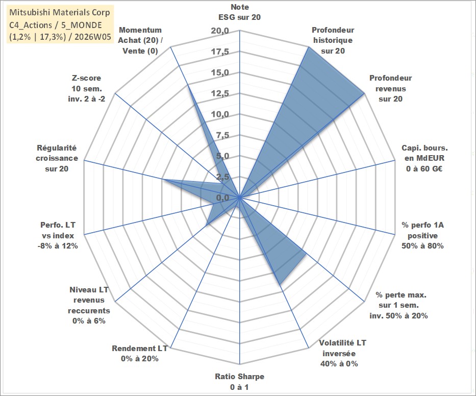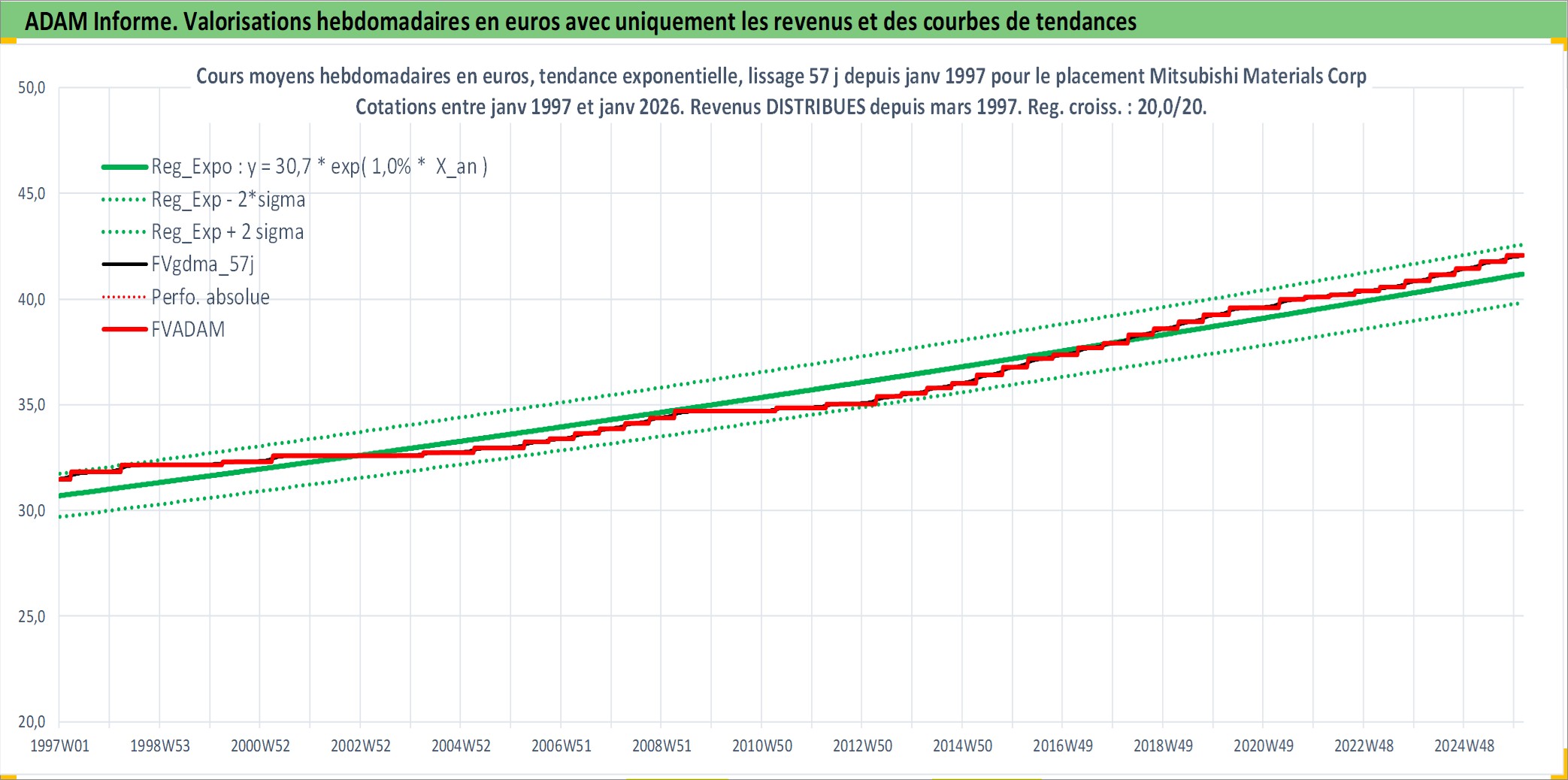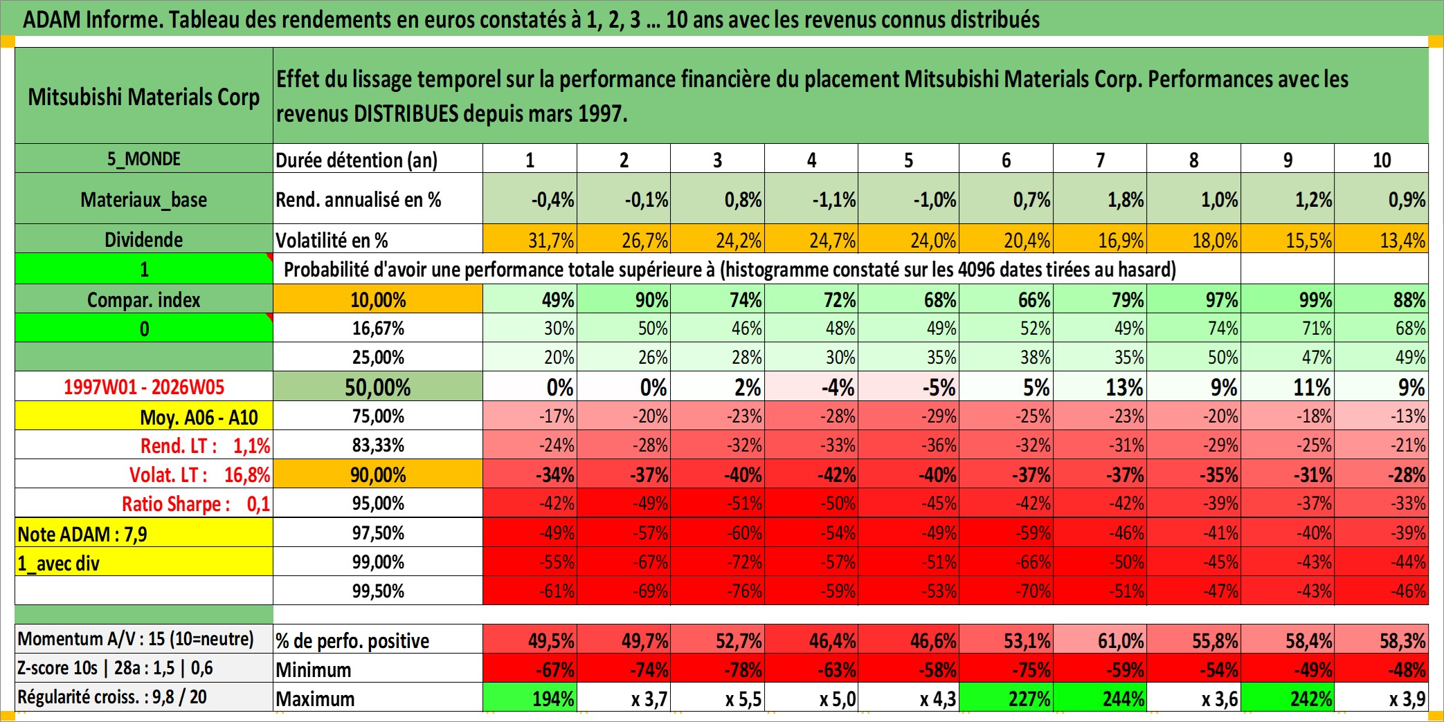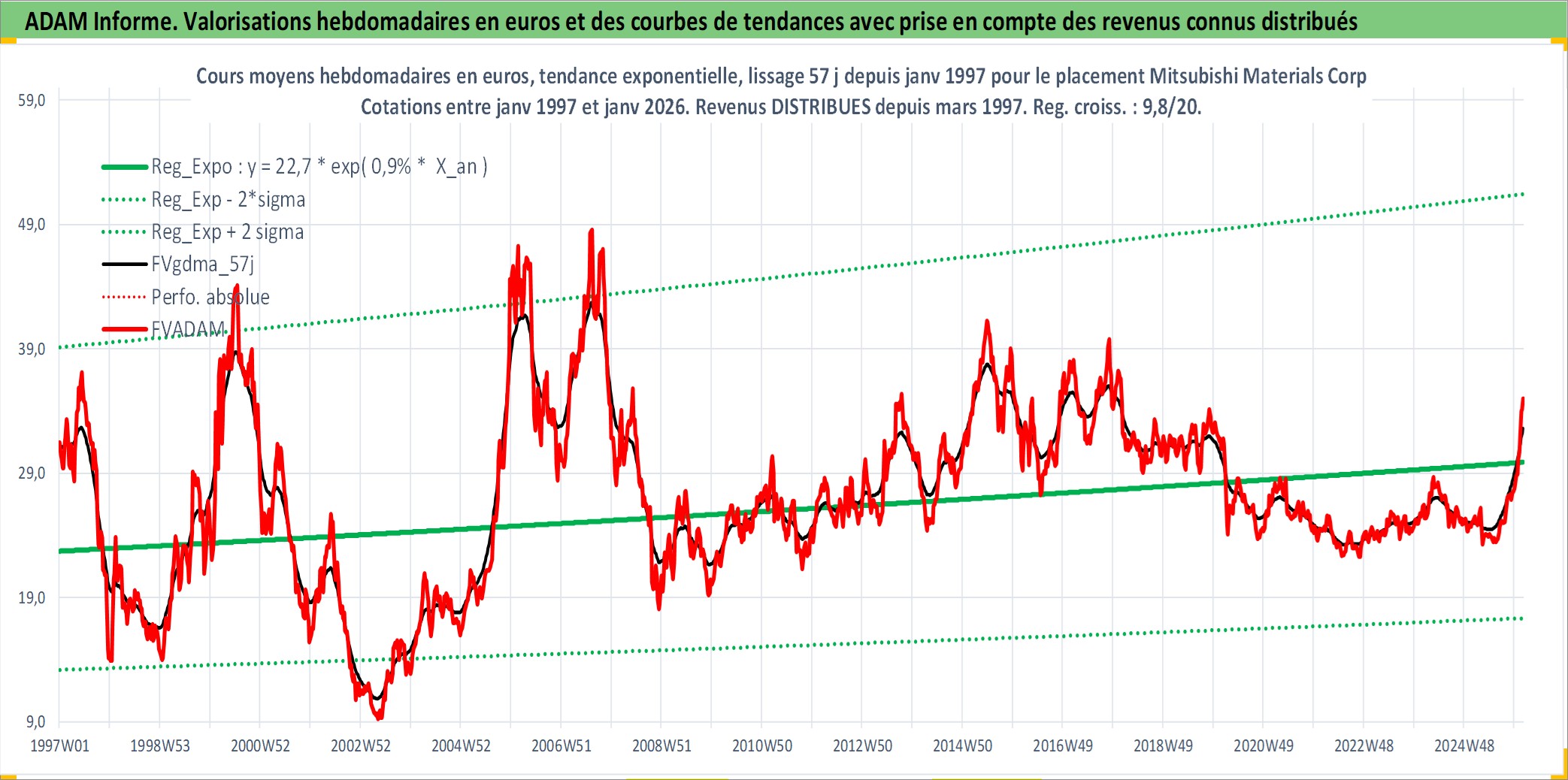 Site dédié aux investisseursPage dédiée sur site financeAnalyse des valorisations hebdomadaires de l'action Mitsubishi Materials Corp. Cet actif est cote en JPY. Les valorisations sont en contrevaleur EURO et couvrent les semaines 1997W01 a 2026W05. Les revenus de cet actif financier sont pris en compte depuis la semaine 1997W13. La note ESG de cet actif n'est pas connue.