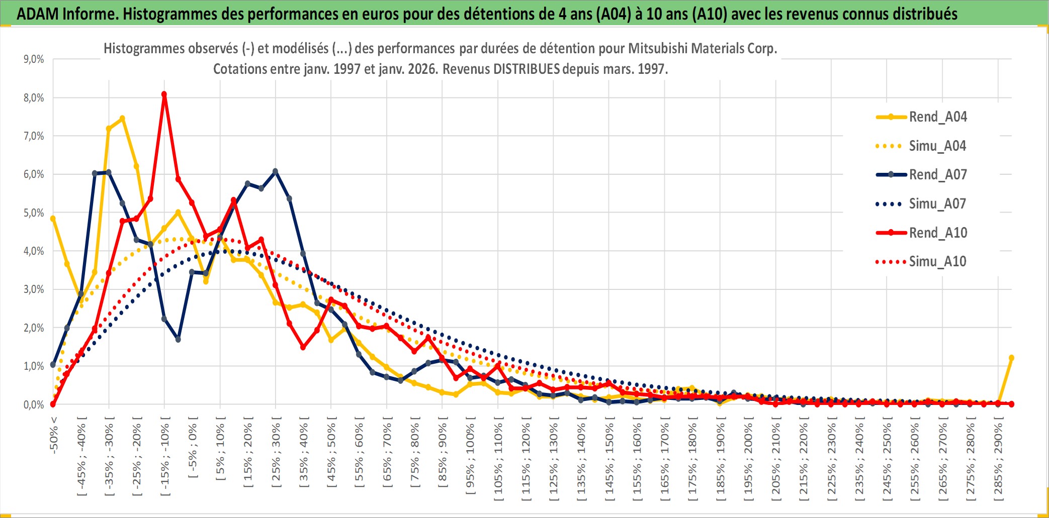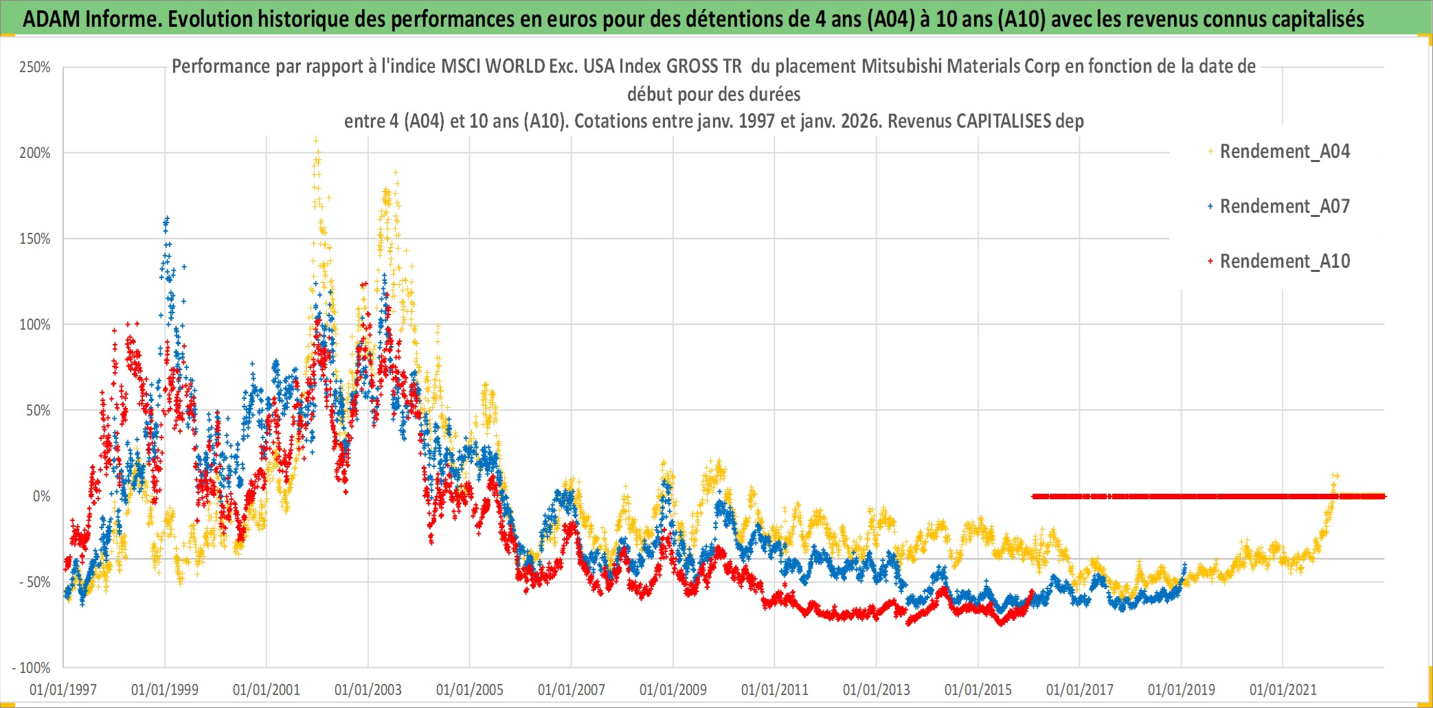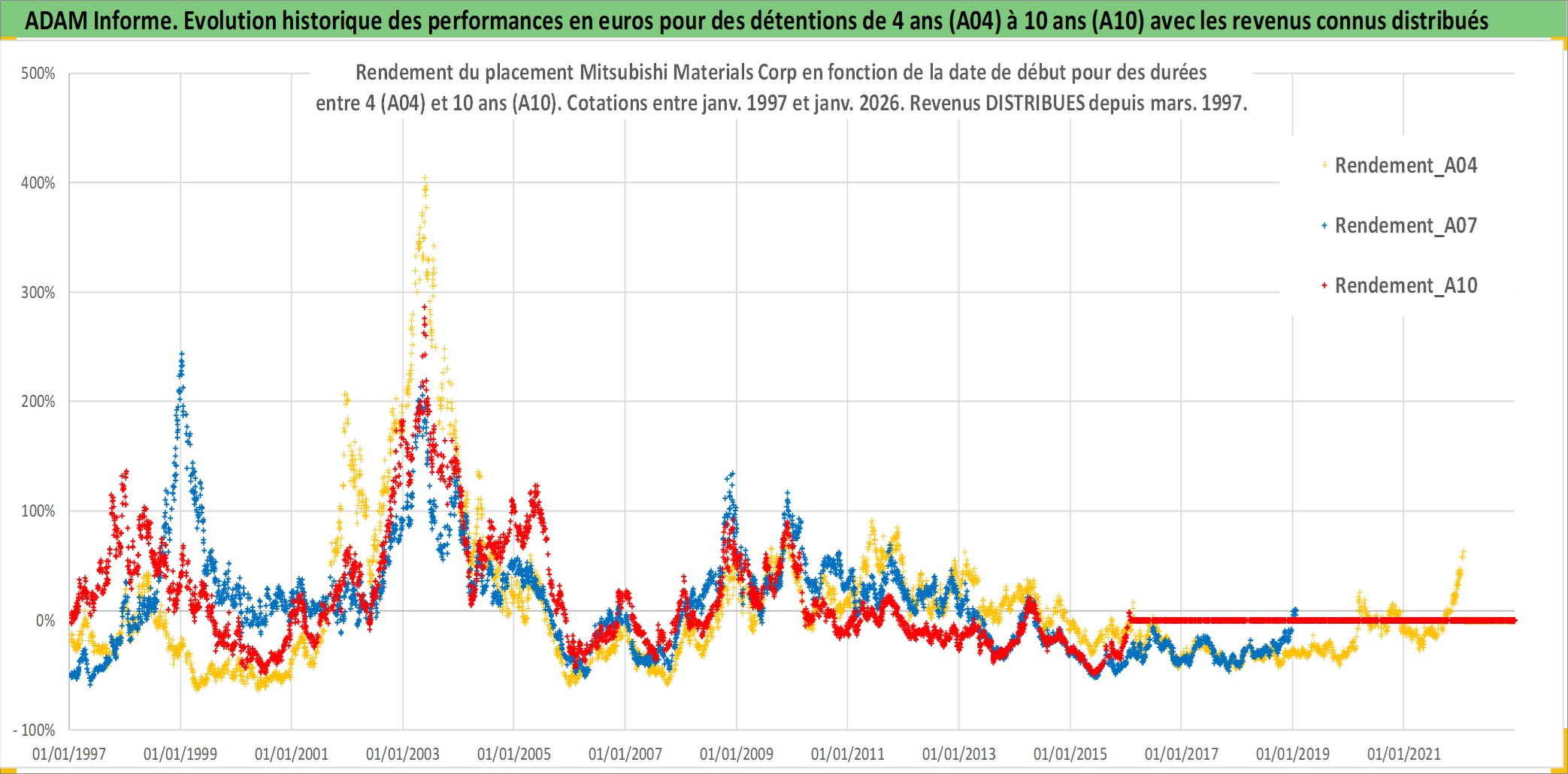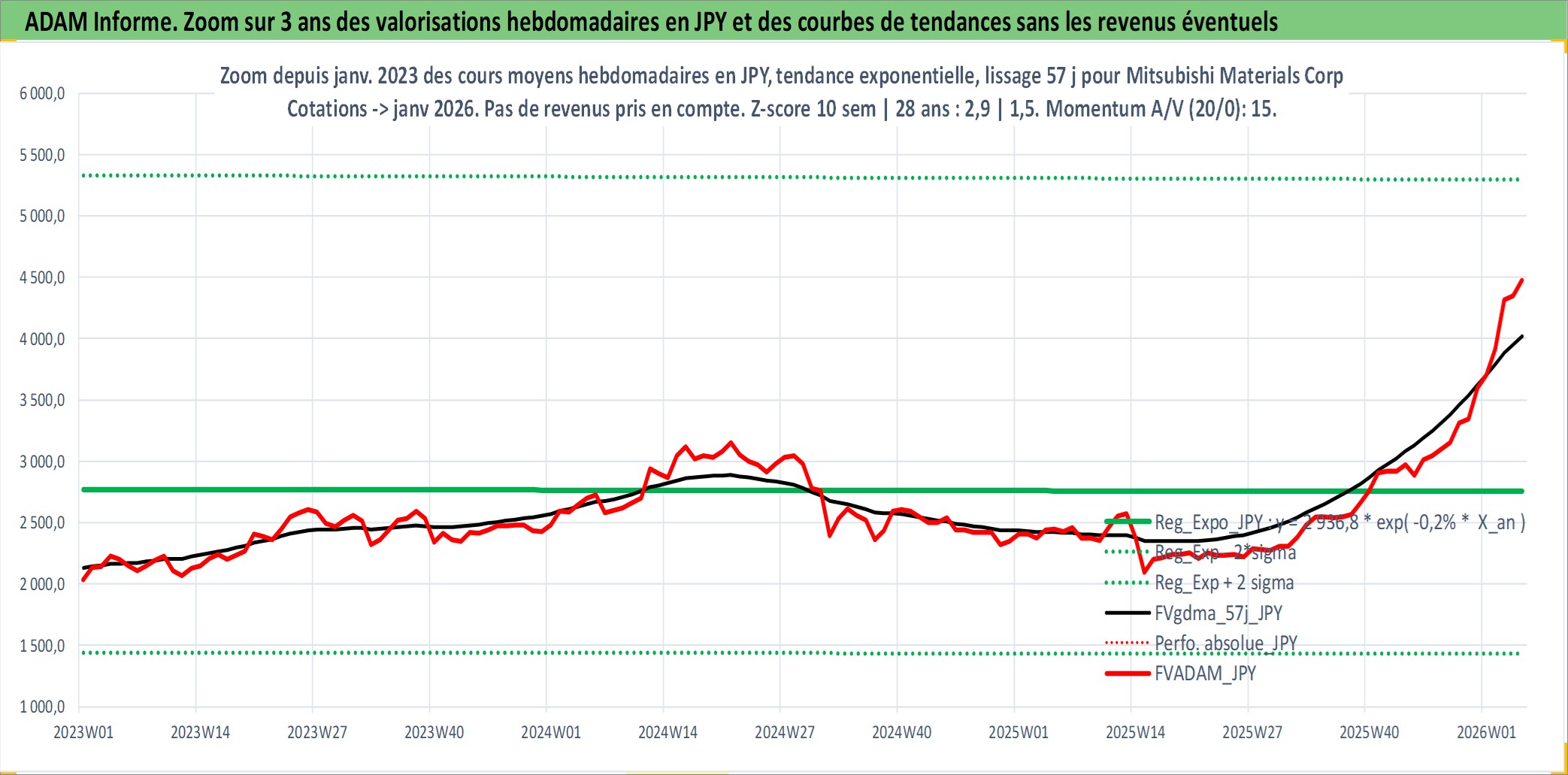 Site dédié aux investisseursPage dédiée sur site financeAnalyse des valorisations hebdomadaires de l'action Mitsubishi Materials Corp. Cet actif est cote en JPY. Les valorisations sont en contrevaleur EURO et couvrent les semaines 1997W01 a 2026W05. Les revenus de cet actif financier sont pris en compte depuis la semaine 1997W13. La note ESG de cet actif n'est pas connue.
