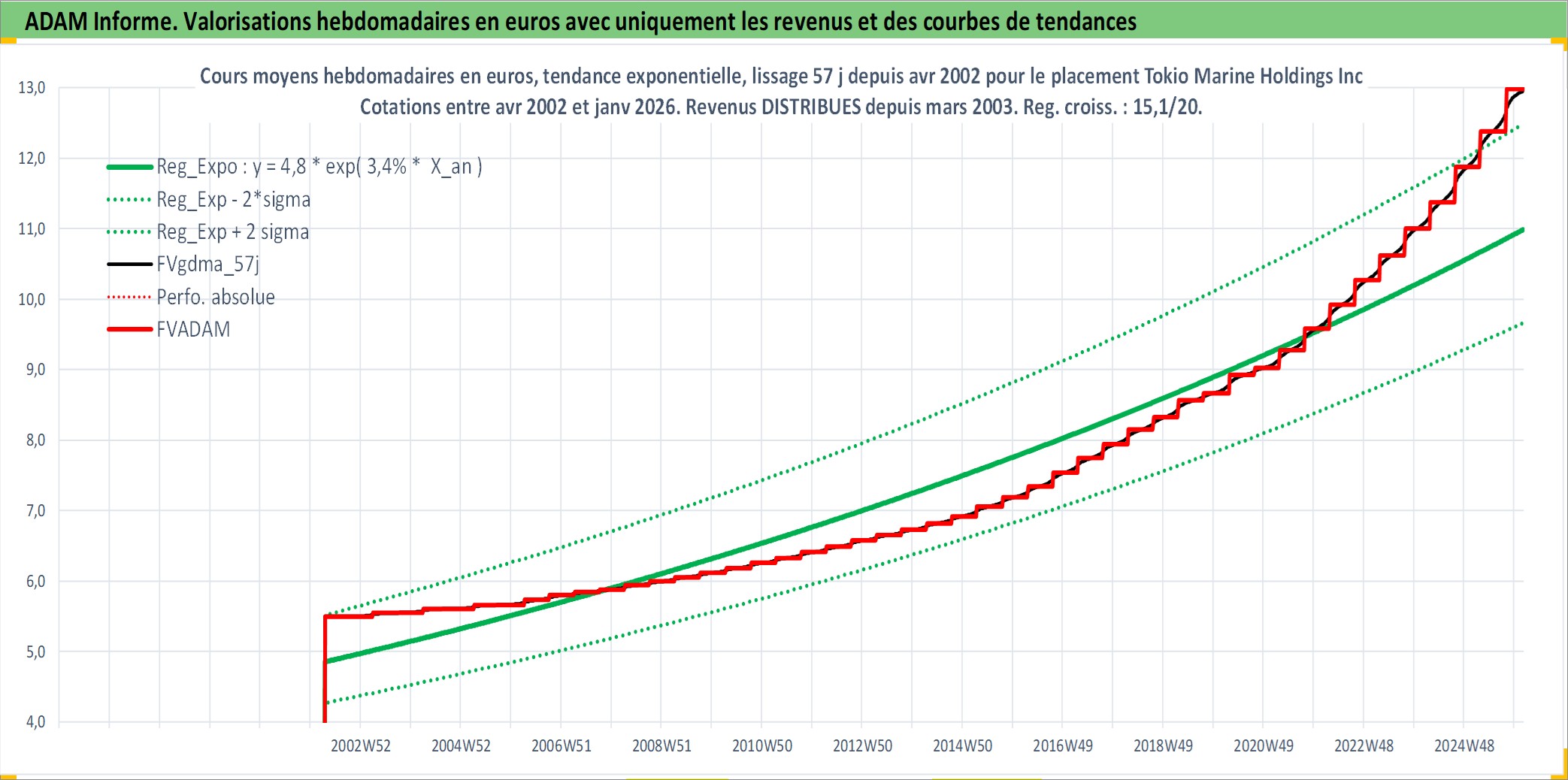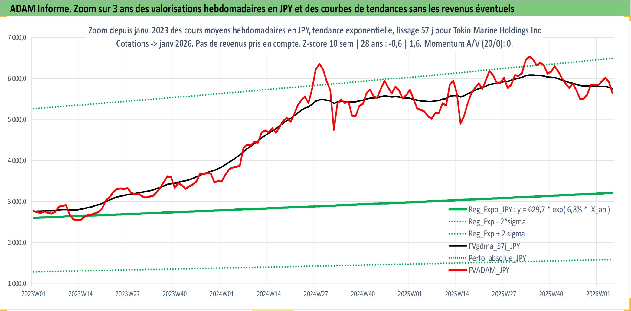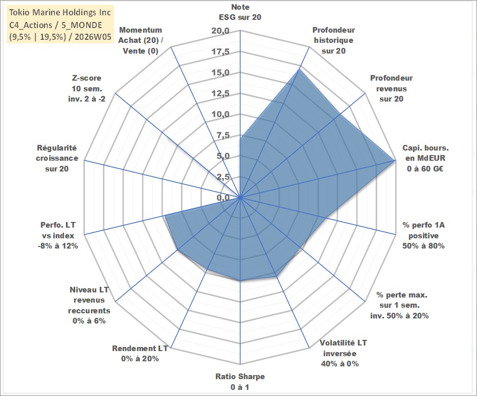 Site dédié aux investisseursPage dédiée sur site financeAnalyse des valorisations hebdomadaires de l'action Tokio Marine Holdings Inc. Cet actif est cote en JPY. Les valorisations sont en contrevaleur EURO et couvrent les semaines 2002W15 a 2026W05. Les revenus de cet actif financier sont pris en compte depuis la semaine 2003W13. La note globale ESG de cet actif est estimee a 7.0 (apres rebasage entre 0 et 20).