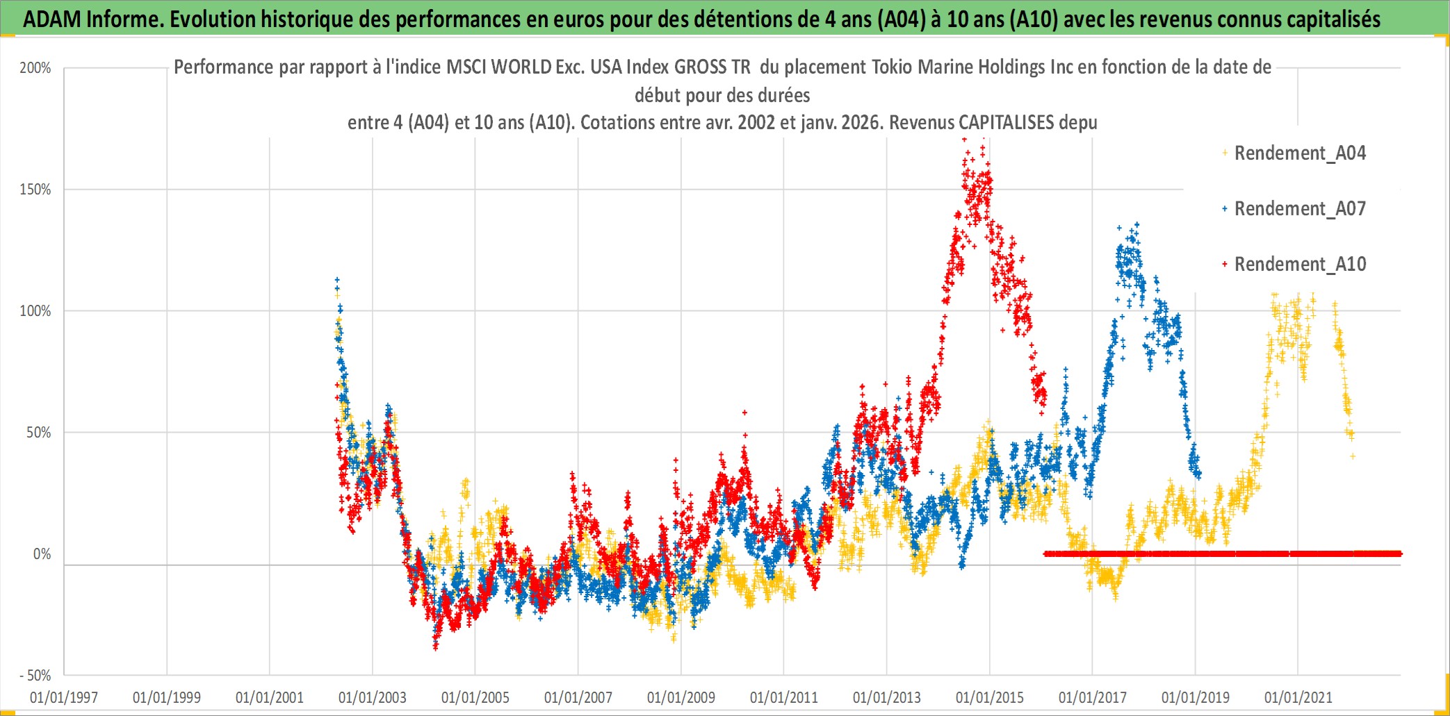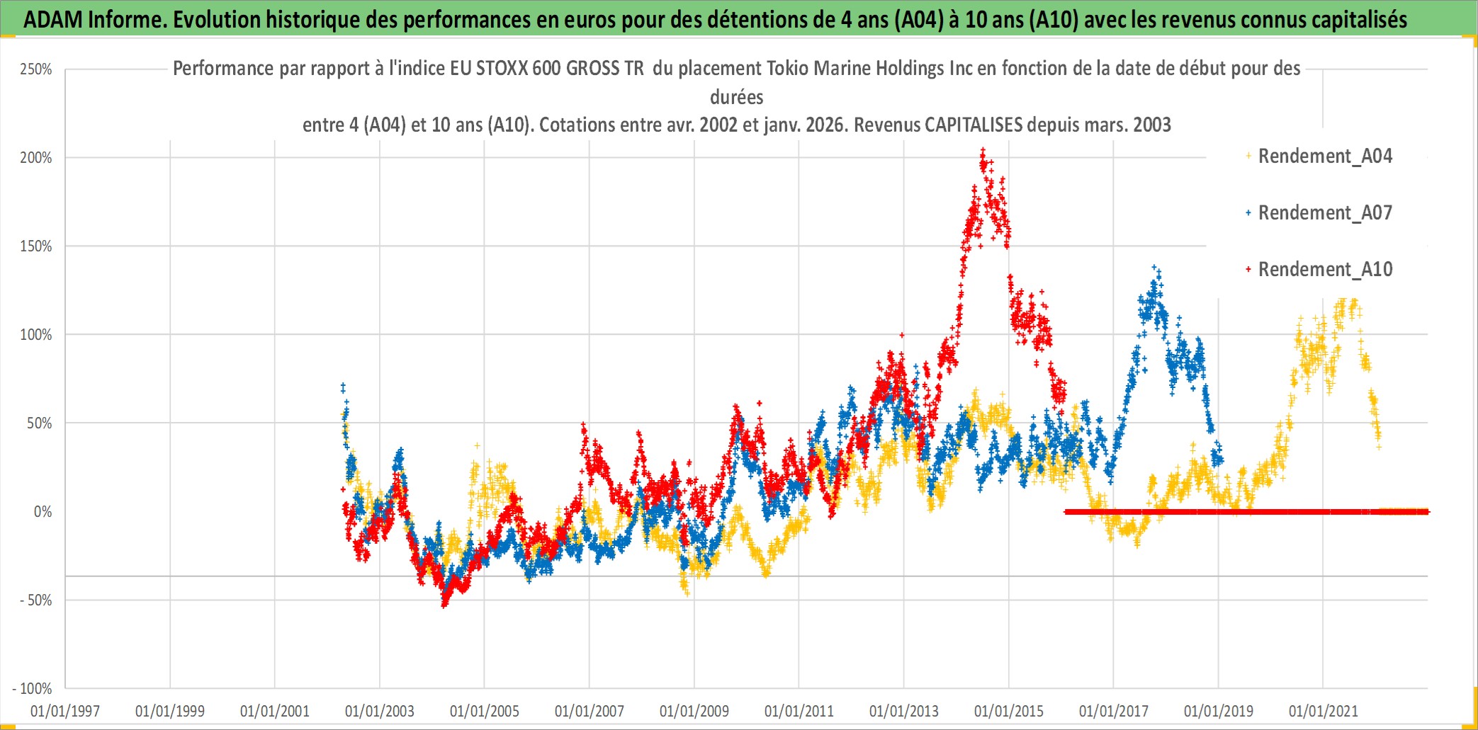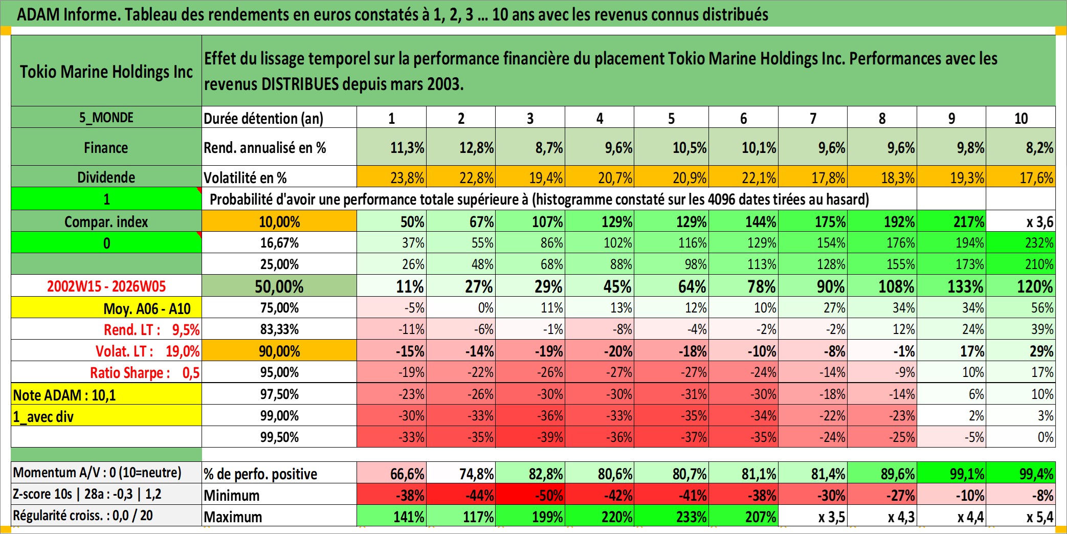 Site dédié aux investisseursPage dédiée sur site financeAnalyse des valorisations hebdomadaires de l'action Tokio Marine Holdings Inc. Cet actif est cote en JPY. Les valorisations sont en contrevaleur EURO et couvrent les semaines 2002W15 a 2026W05. Les revenus de cet actif financier sont pris en compte depuis la semaine 2003W13. La note globale ESG de cet actif est estimee a 7.0 (apres rebasage entre 0 et 20).