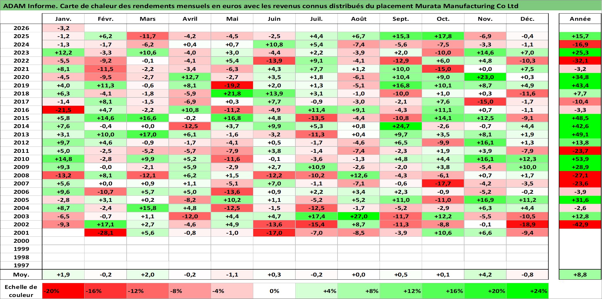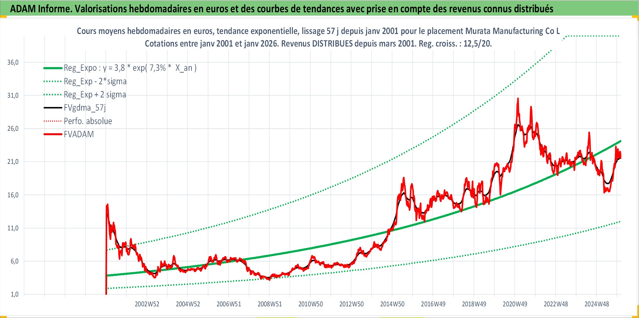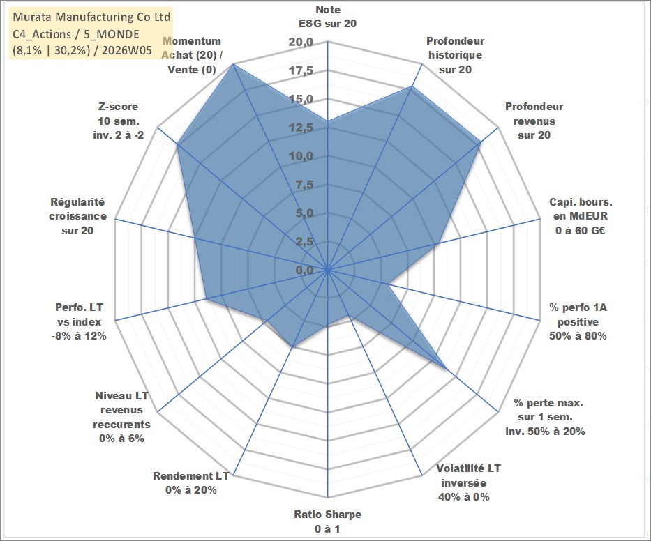 Site dédié aux investisseursPage dédiée sur site financeAnalyse des valorisations hebdomadaires de l'action Murata Manufacturing Co Ltd. Cet actif est cote en JPY. Les valorisations sont en contrevaleur EURO et couvrent les semaines 2001W01 a 2026W05. Les revenus de cet actif financier sont pris en compte depuis la semaine 2001W13. La note globale ESG de cet actif est estimee a 13.0 (apres rebasage entre 0 et 20).