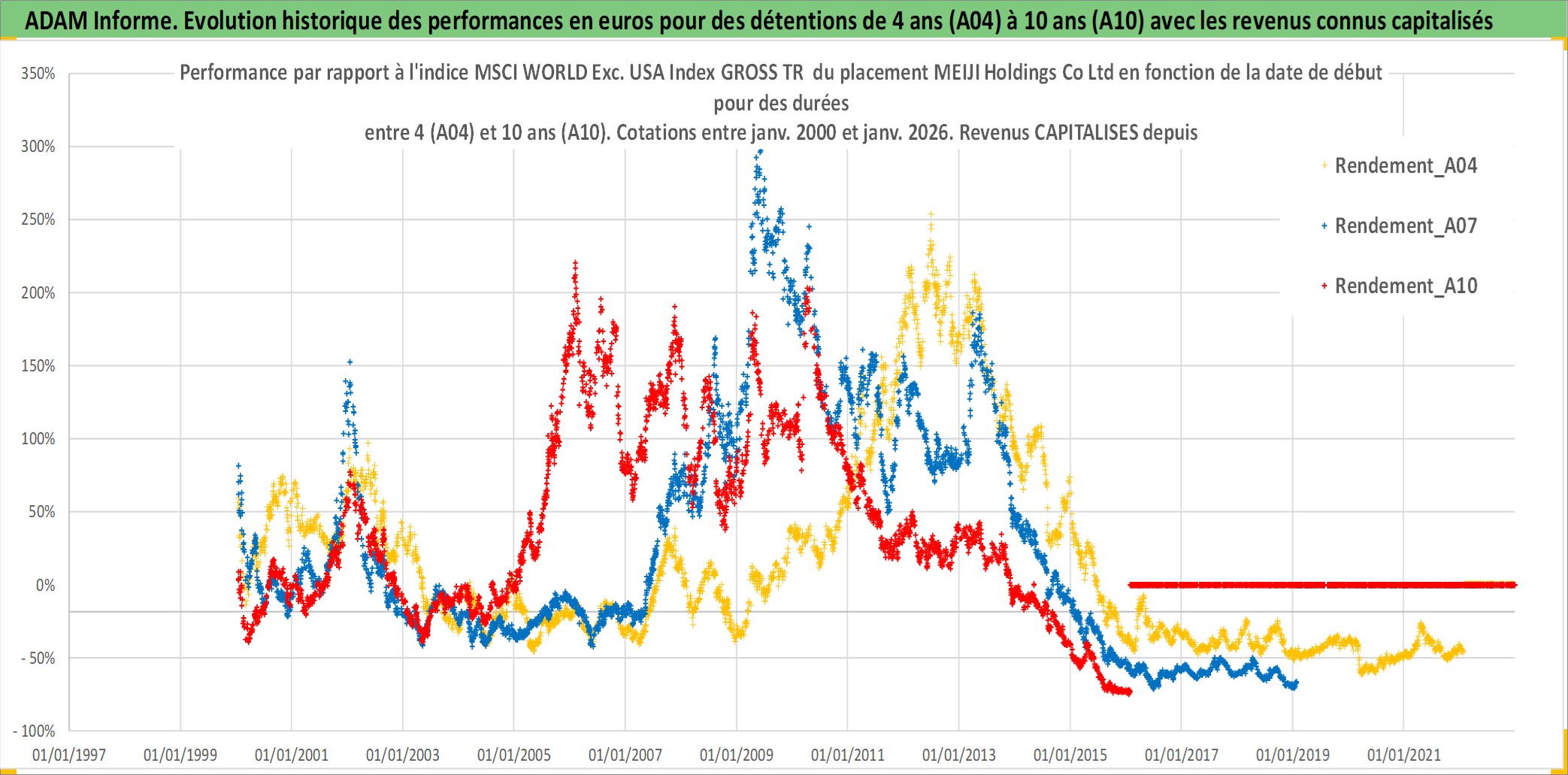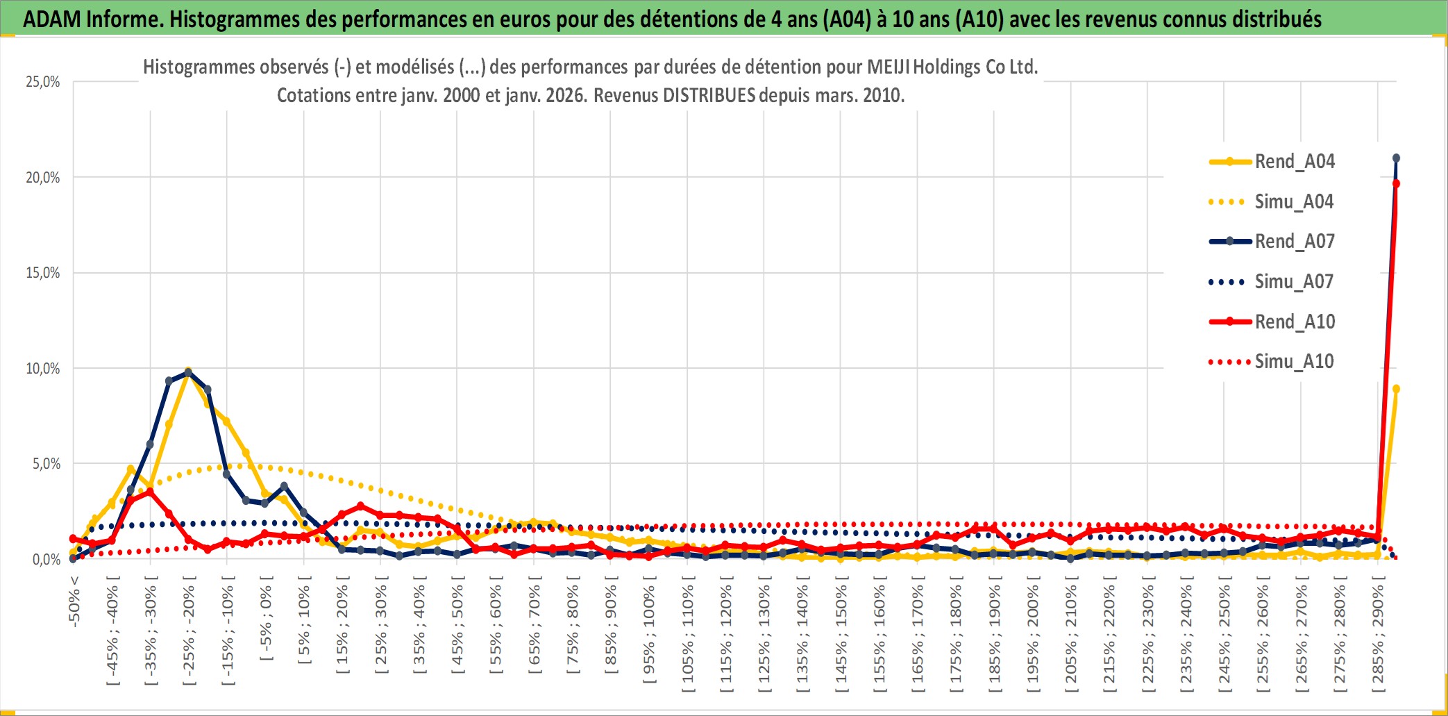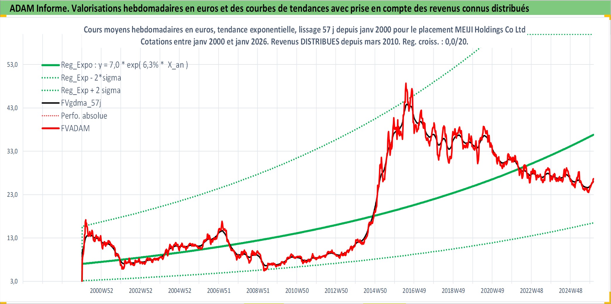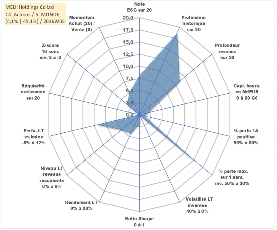 Site dédié aux investisseursPage dédiée sur site financeAnalyse des valorisations hebdomadaires de l'action MEIJI Holdings Co Ltd. Cet actif est cote en JPY. Les valorisations sont en contrevaleur EURO et couvrent les semaines 2000W01 a 2026W05. Les revenus de cet actif financier sont pris en compte depuis la semaine 2010W13. La note globale ESG de cet actif est estimee a 8.0 (apres rebasage entre 0 et 20).