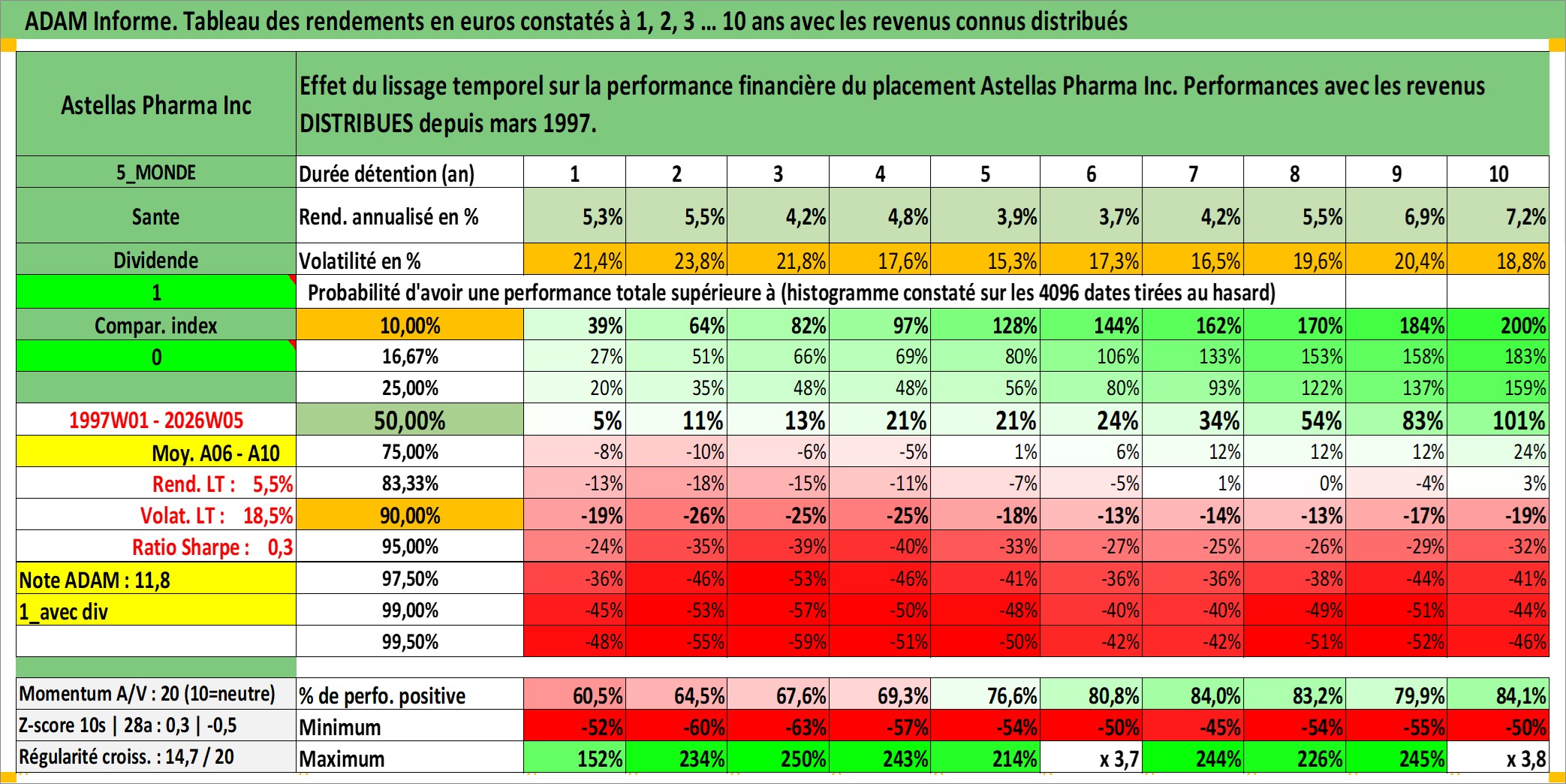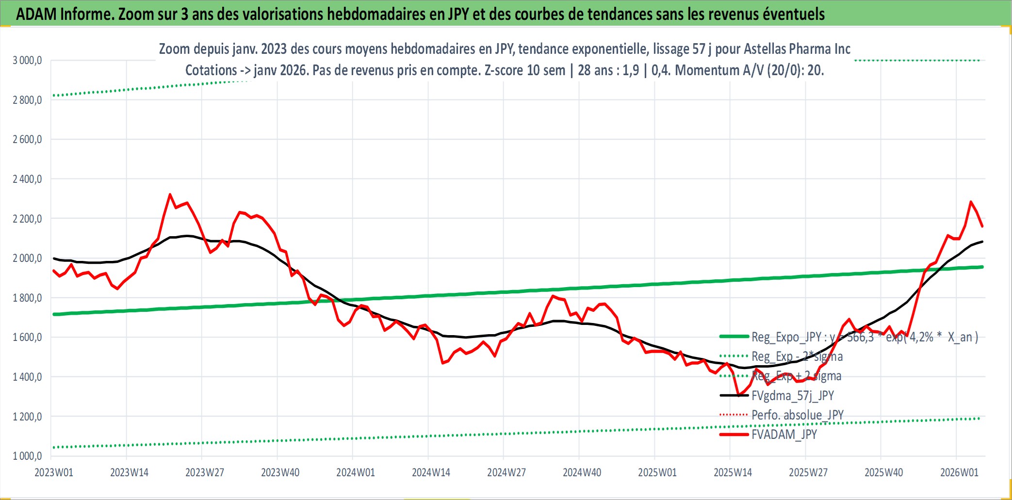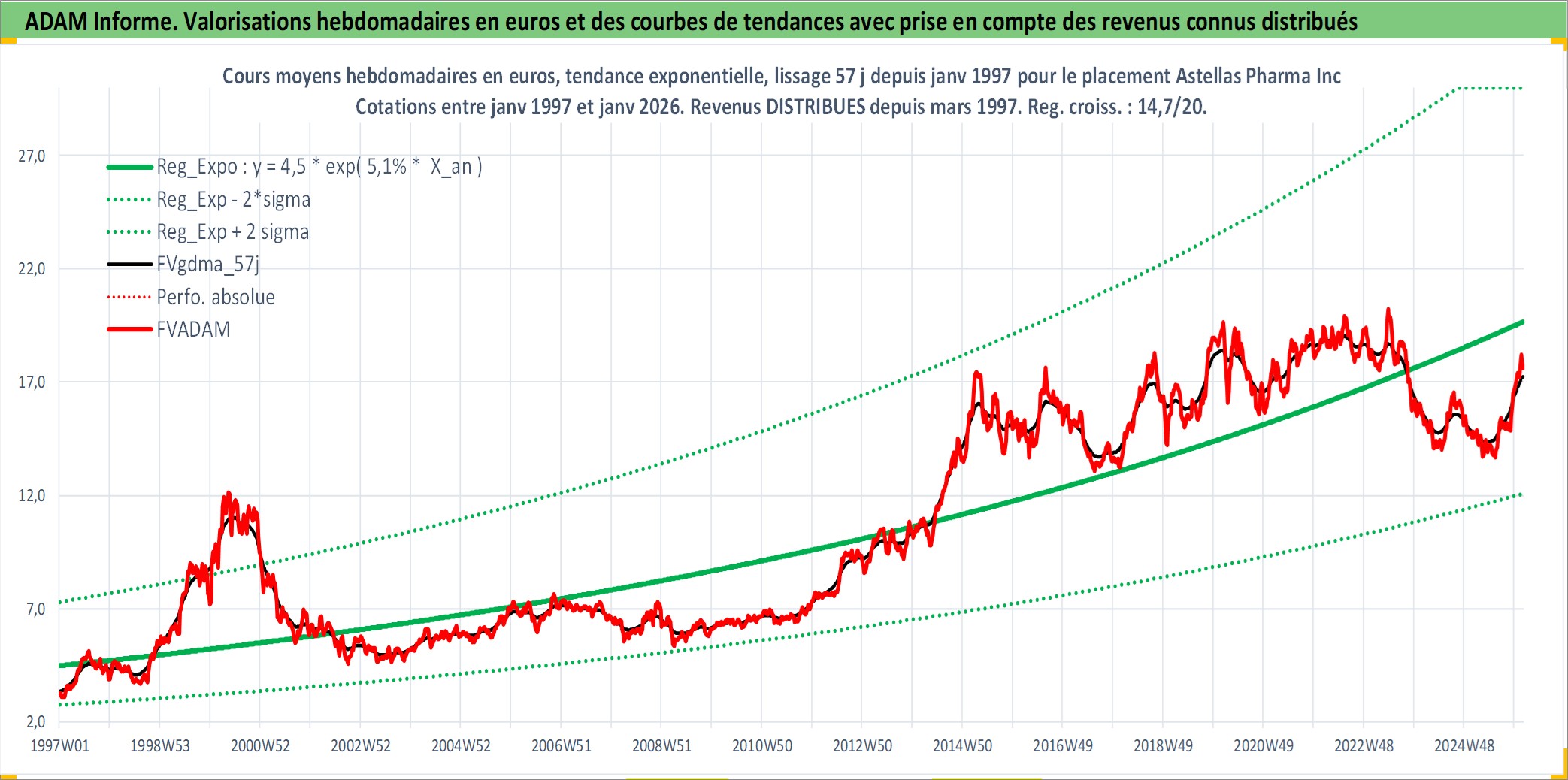 Site dédié aux investisseursPage dédiée sur site financeAnalyse des valorisations hebdomadaires de l'action Astellas Pharma Inc. Cet actif est cote en JPY. Les valorisations sont en contrevaleur EURO et couvrent les semaines 1997W01 a 2026W05. Les revenus de cet actif financier sont pris en compte depuis la semaine 1997W13. La note globale ESG de cet actif est estimee a 10.0 (apres rebasage entre 0 et 20).
