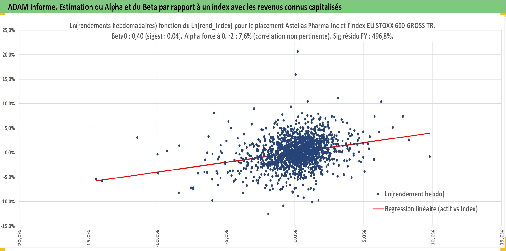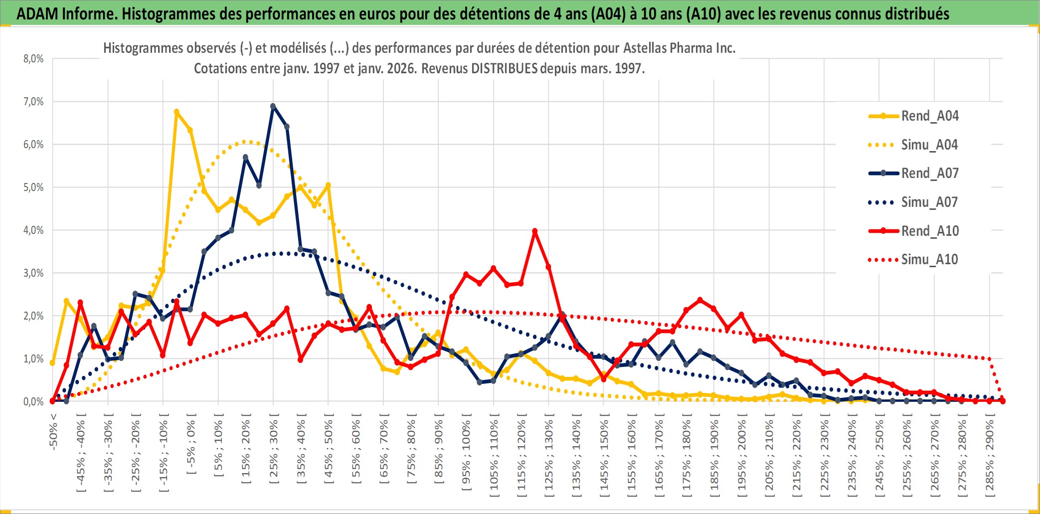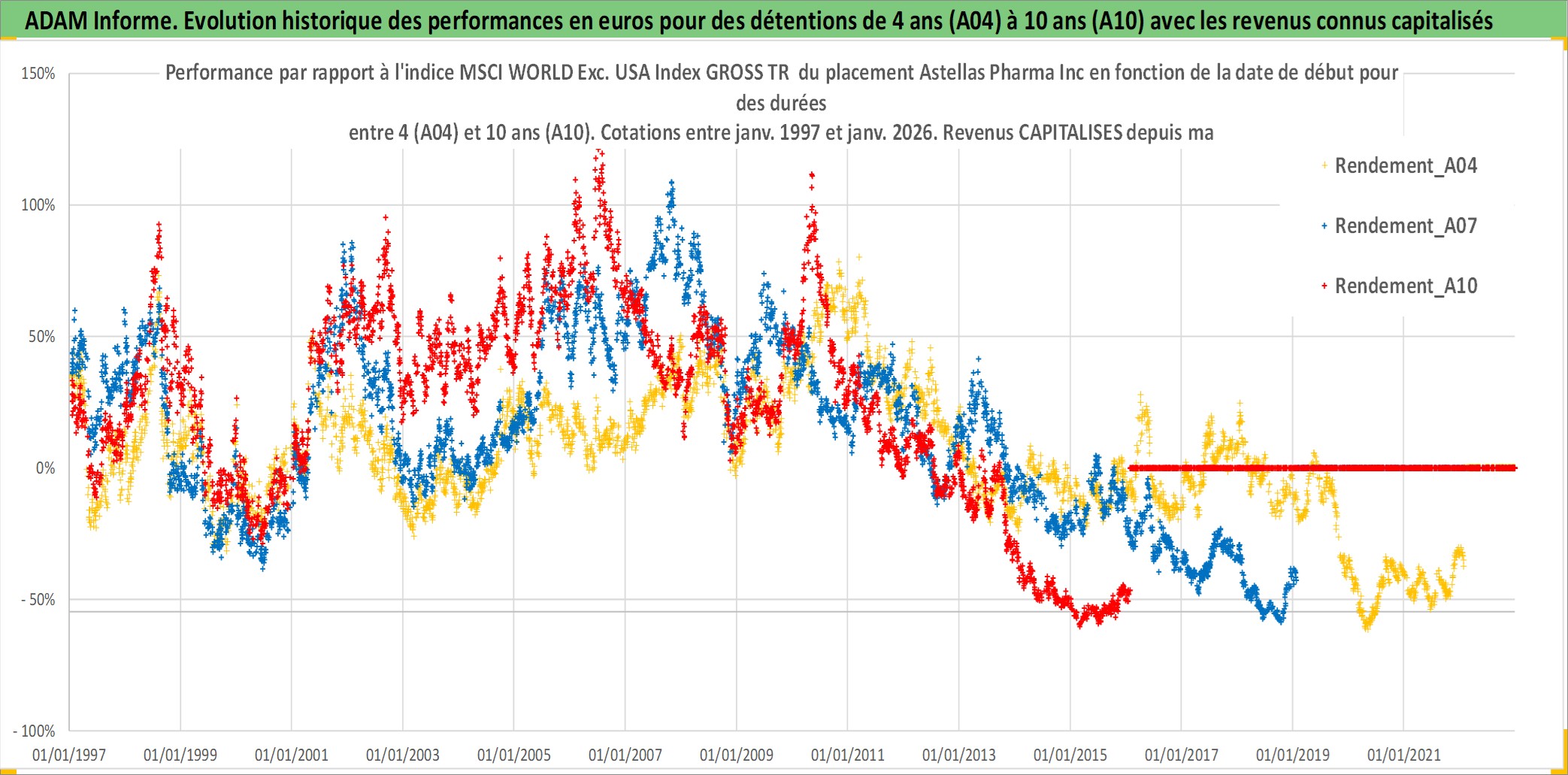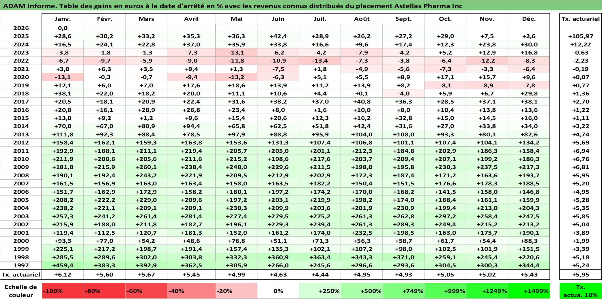 Site dédié aux investisseursPage dédiée sur site financeAnalyse des valorisations hebdomadaires de l'action Astellas Pharma Inc. Cet actif est cote en JPY. Les valorisations sont en contrevaleur EURO et couvrent les semaines 1997W01 a 2026W05. Les revenus de cet actif financier sont pris en compte depuis la semaine 1997W13. La note globale ESG de cet actif est estimee a 10.0 (apres rebasage entre 0 et 20).