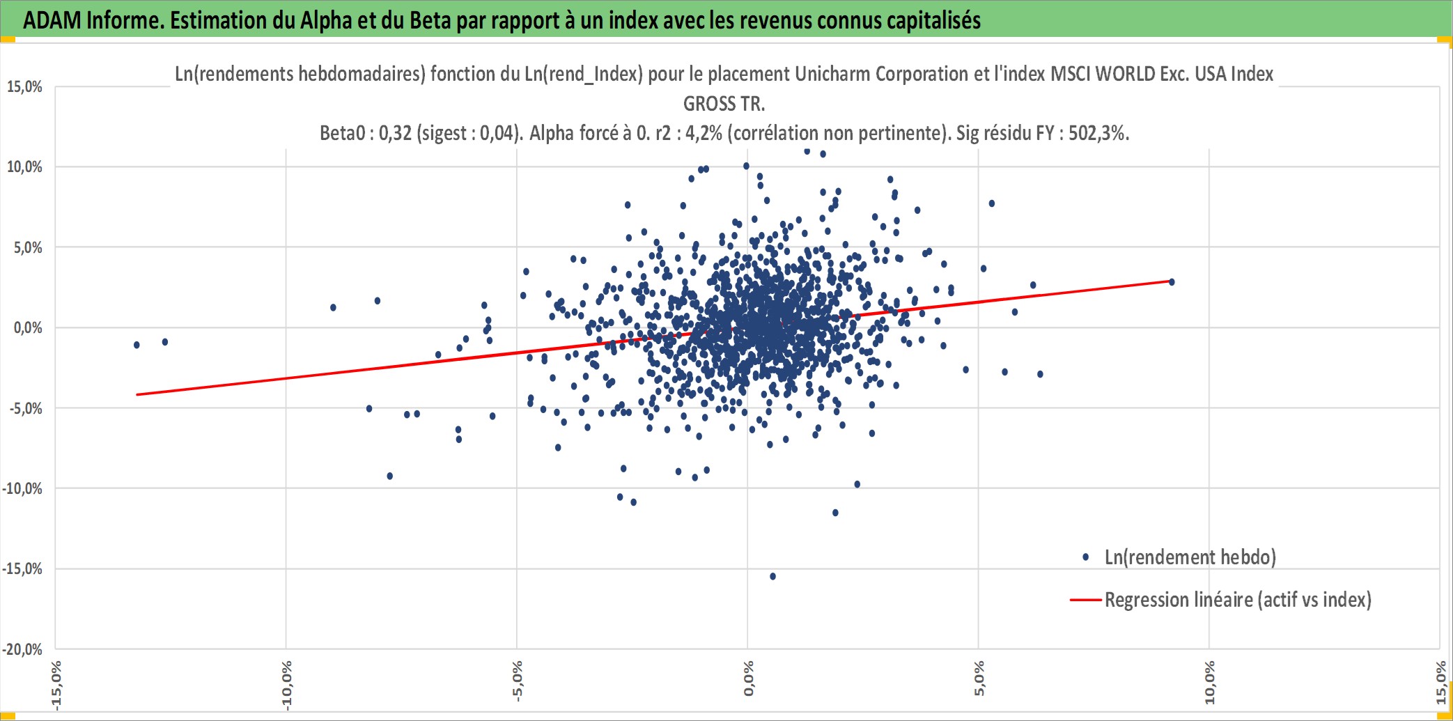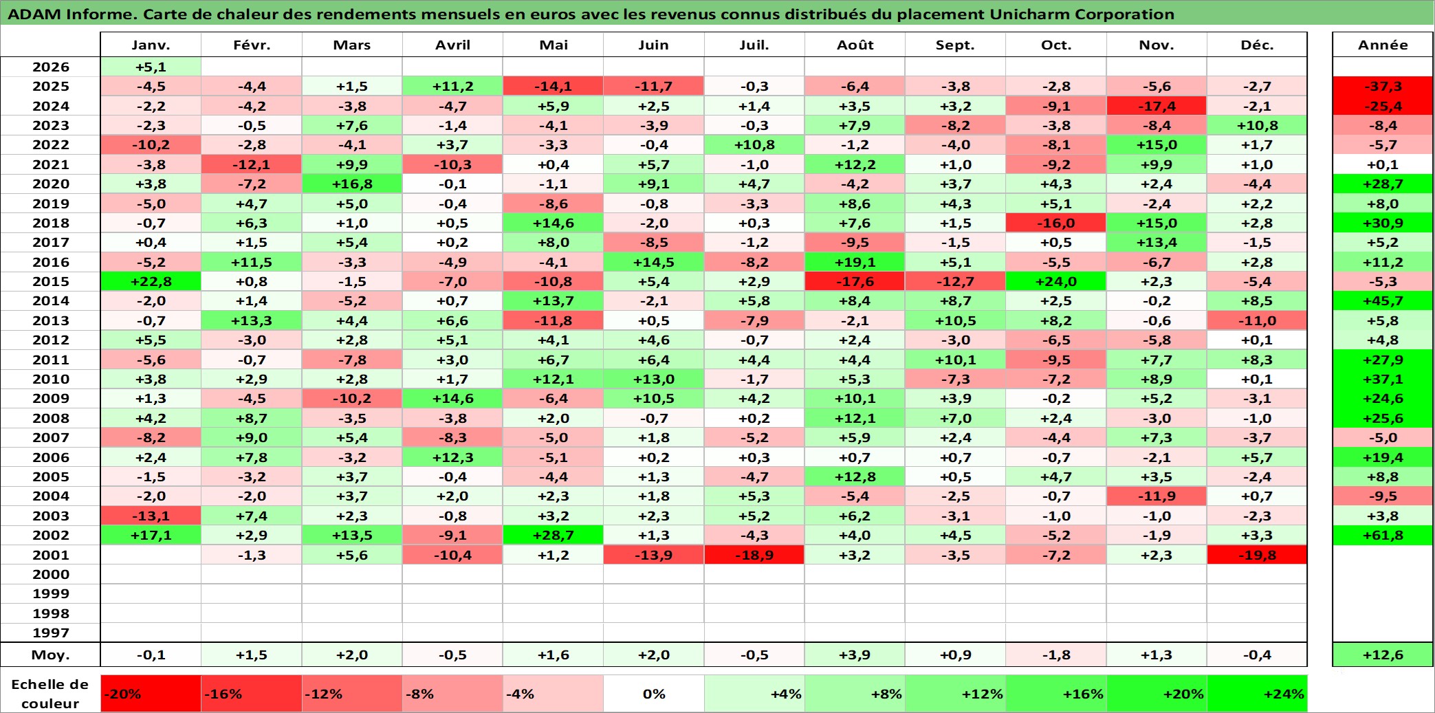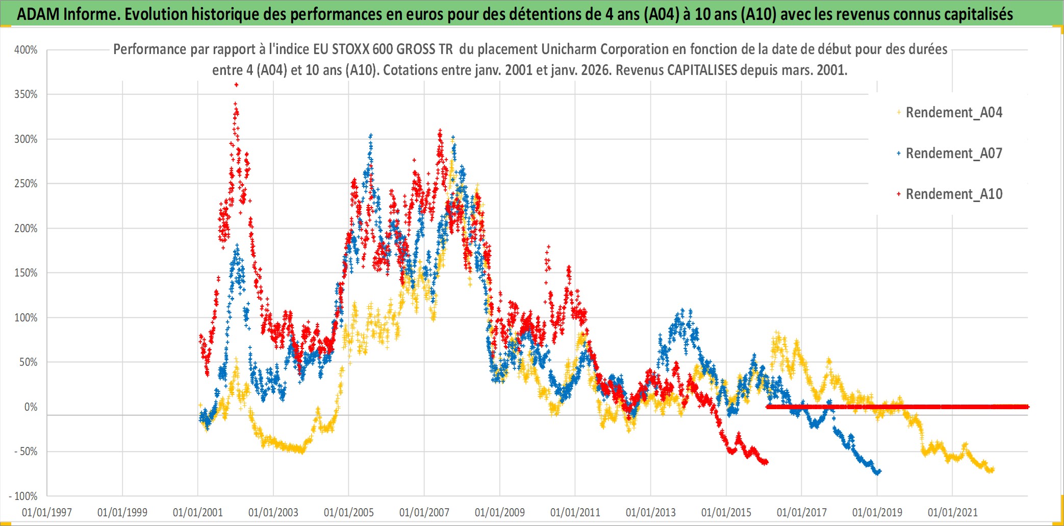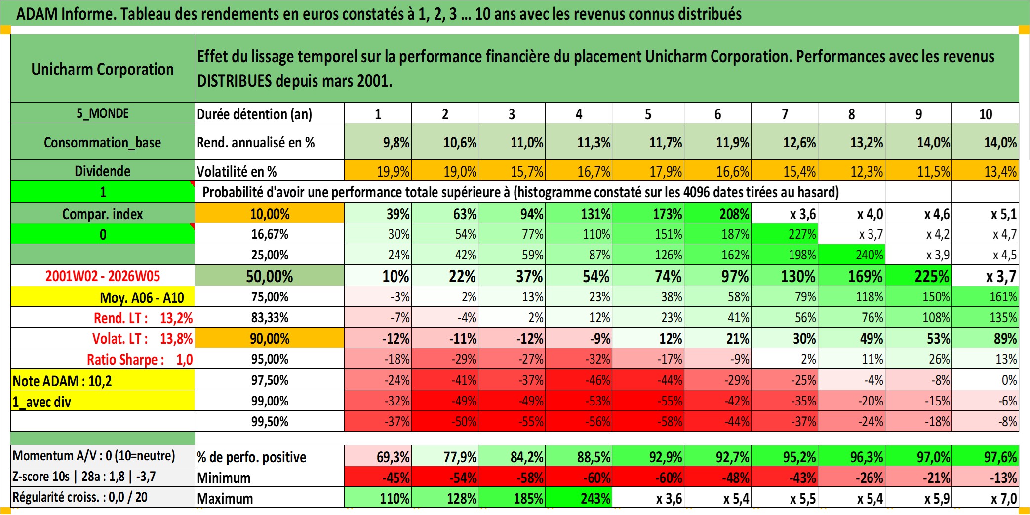 Site dédié aux investisseursPage dédiée sur site financeAnalyse des valorisations hebdomadaires de l'action Unicharm Corporation. Cet actif est cote en JPY. Les valorisations sont en contrevaleur EURO et couvrent les semaines 2001W02 a 2026W05. Les revenus de cet actif financier sont pris en compte depuis la semaine 2001W13. La note globale ESG de cet actif est estimee a 6.0 (apres rebasage entre 0 et 20).
