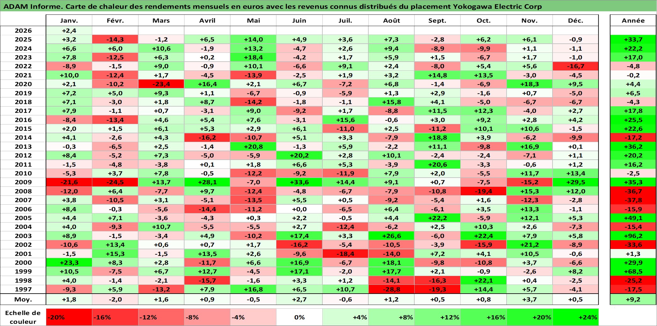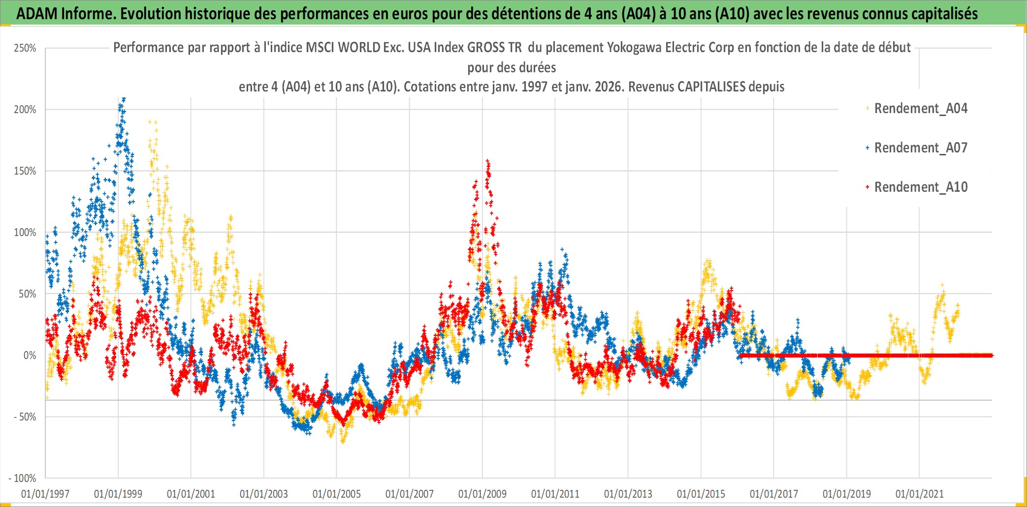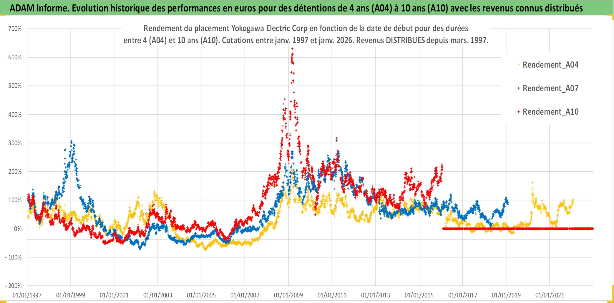 Site dédié aux investisseursPage dédiée sur site financeAnalyse des valorisations hebdomadaires de l'action Yokogawa Electric Corp. Cet actif est cote en JPY. Les valorisations sont en contrevaleur EURO et couvrent les semaines 1997W01 a 2026W05. Les revenus de cet actif financier sont pris en compte depuis la semaine 1997W13. La note ESG de cet actif n'est pas connue.