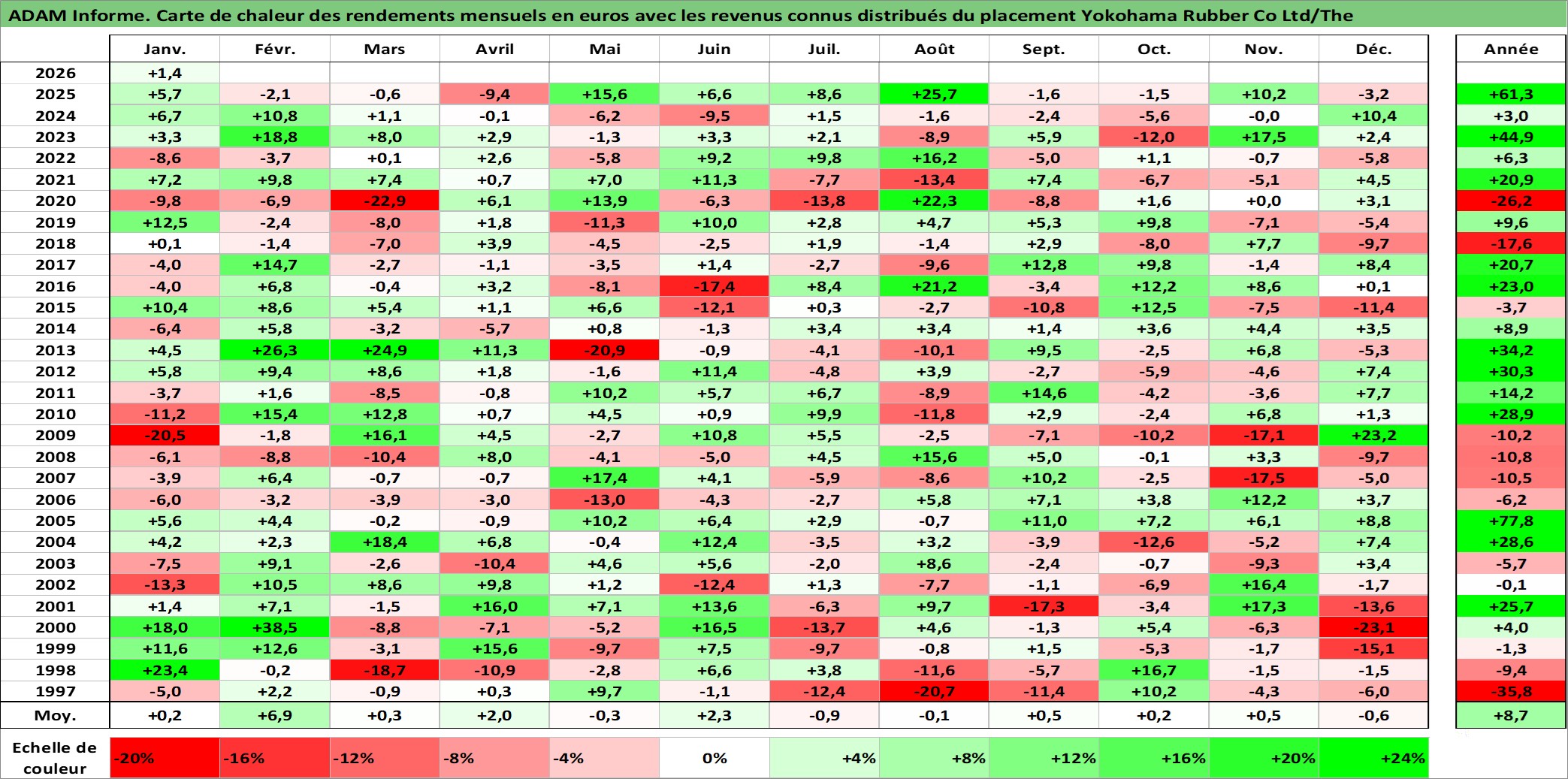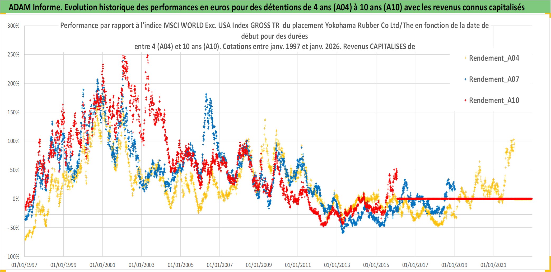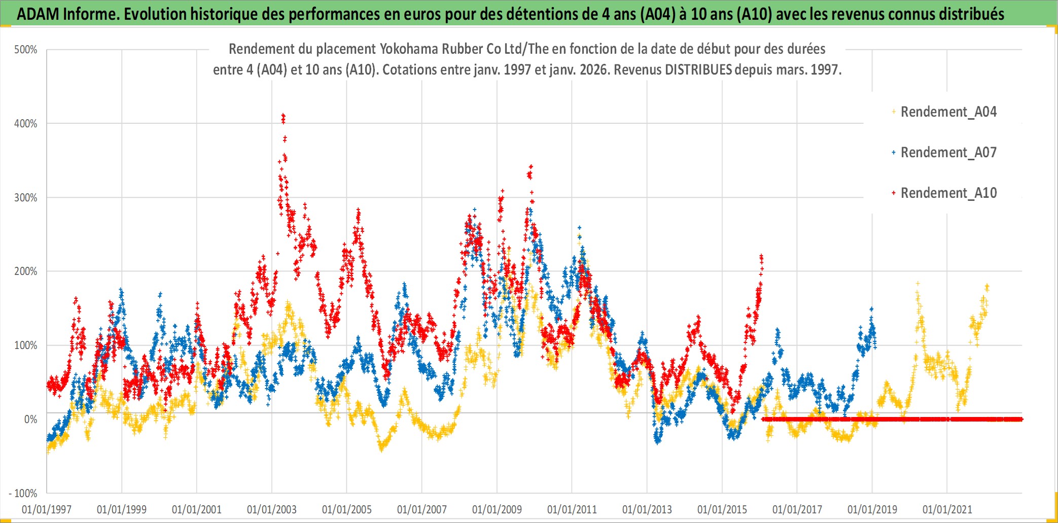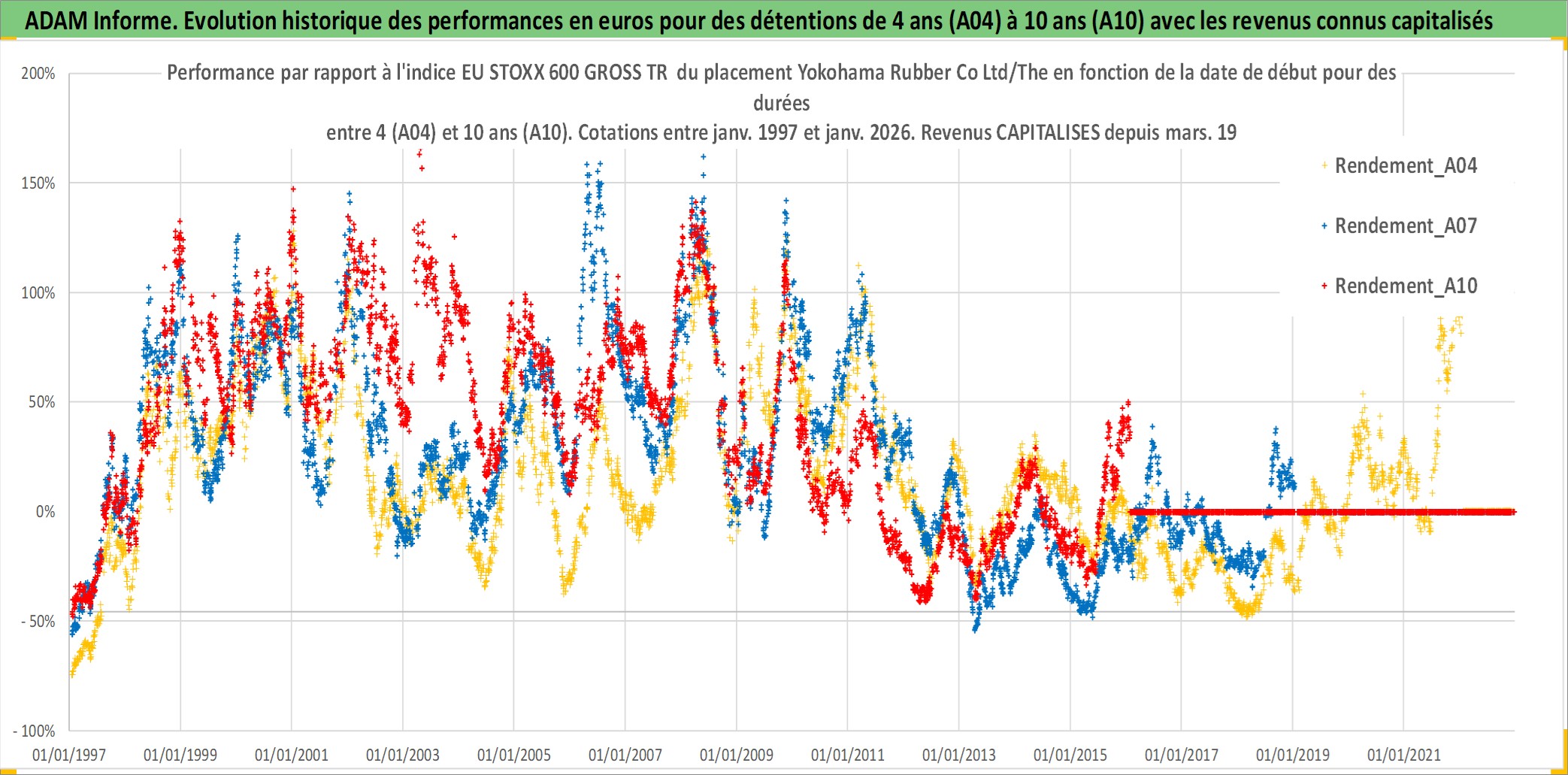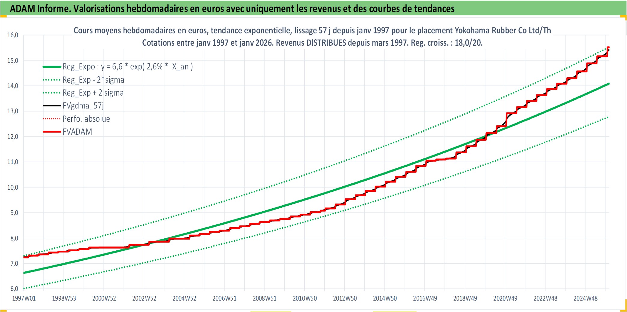 Site dédié aux investisseursPage dédiée sur site financeAnalyse des valorisations hebdomadaires de l'action Yokohama Rubber Co Ltd/The. Cet actif est cote en JPY. Les valorisations sont en contrevaleur EURO et couvrent les semaines 1997W01 a 2026W05. Les revenus de cet actif financier sont pris en compte depuis la semaine 1997W13. La note ESG de cet actif n'est pas connue.