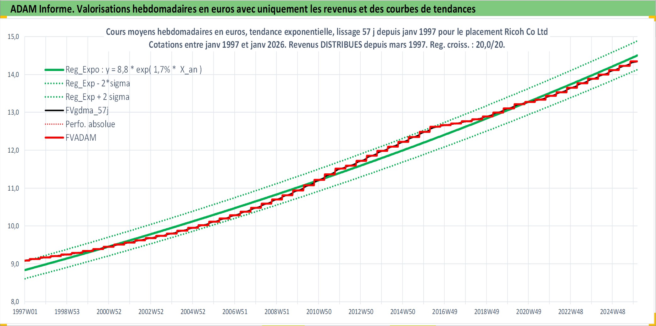 Site dédié aux investisseursPage dédiée sur site financeAnalyse des valorisations hebdomadaires de l'action Ricoh Co Ltd. Cet actif est cote en JPY. Les valorisations sont en contrevaleur EURO et couvrent les semaines 1997W01 a 2026W05. Les revenus de cet actif financier sont pris en compte depuis la semaine 1997W13. La note globale ESG de cet actif est estimee a 11.0 (apres rebasage entre 0 et 20).