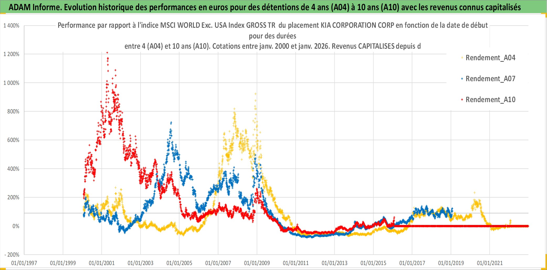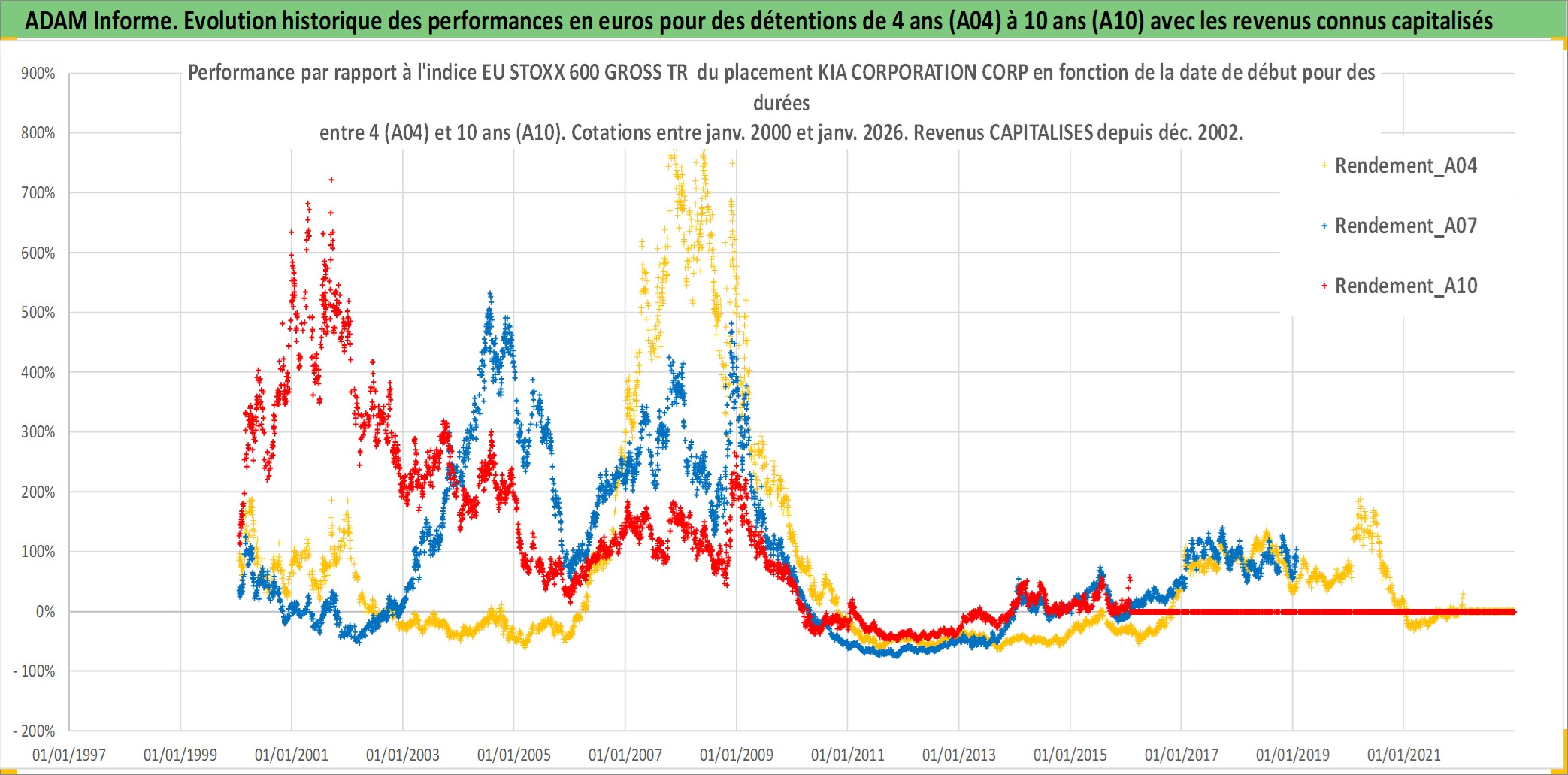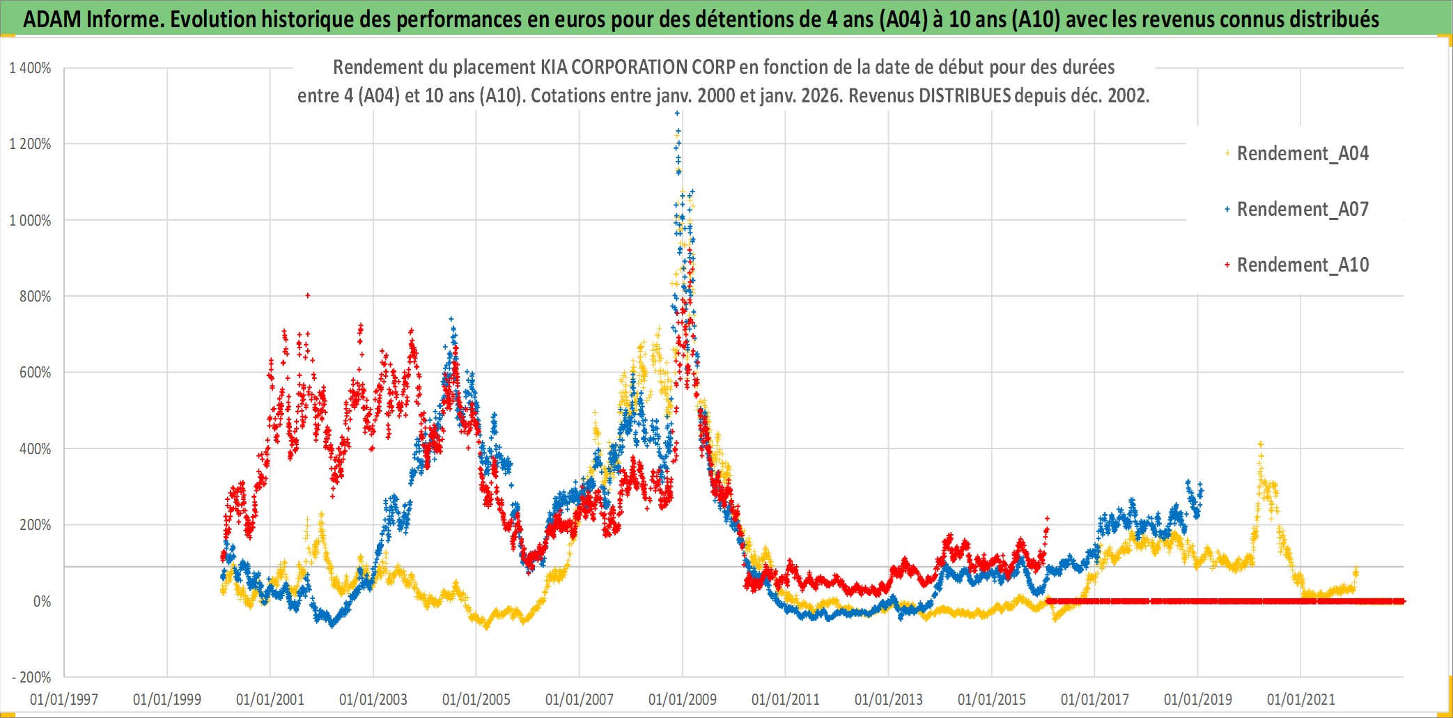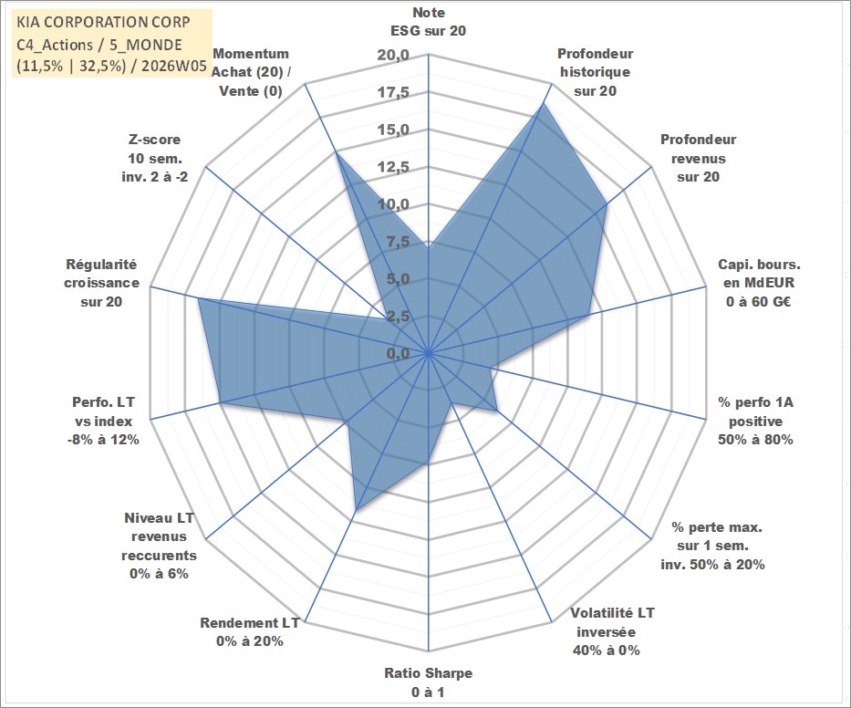 Site dédié aux investisseursPage dédiée sur site financeAnalyse des valorisations hebdomadaires de l'action KIA CORPORATION CORP. Cet actif est cote en KRW. Les valorisations sont en contrevaleur EURO et couvrent les semaines 2000W02 a 2026W05. Les revenus de cet actif financier sont pris en compte depuis la semaine 2002W52. La note globale ESG de cet actif est estimee a 7.0 (apres rebasage entre 0 et 20).