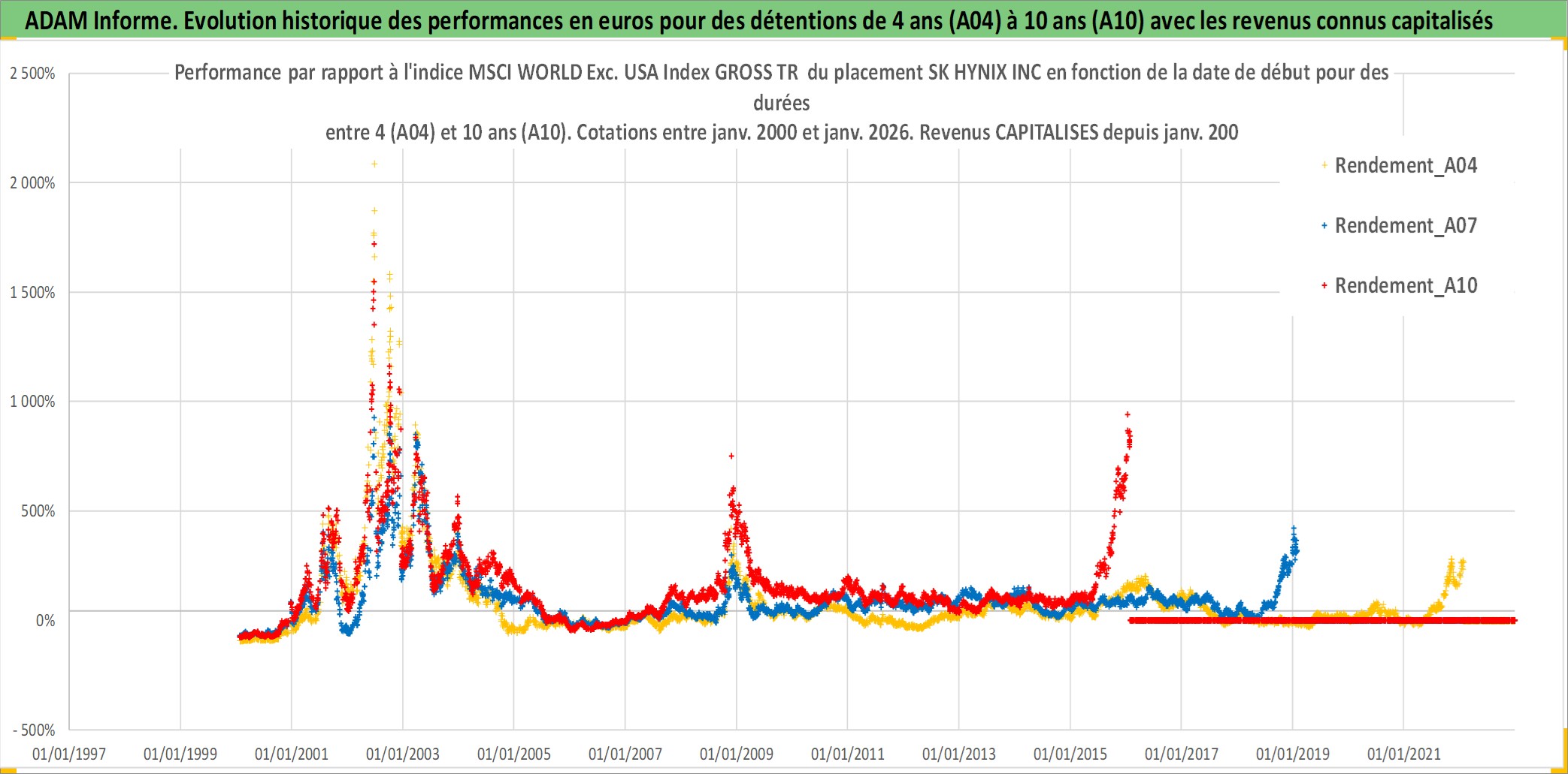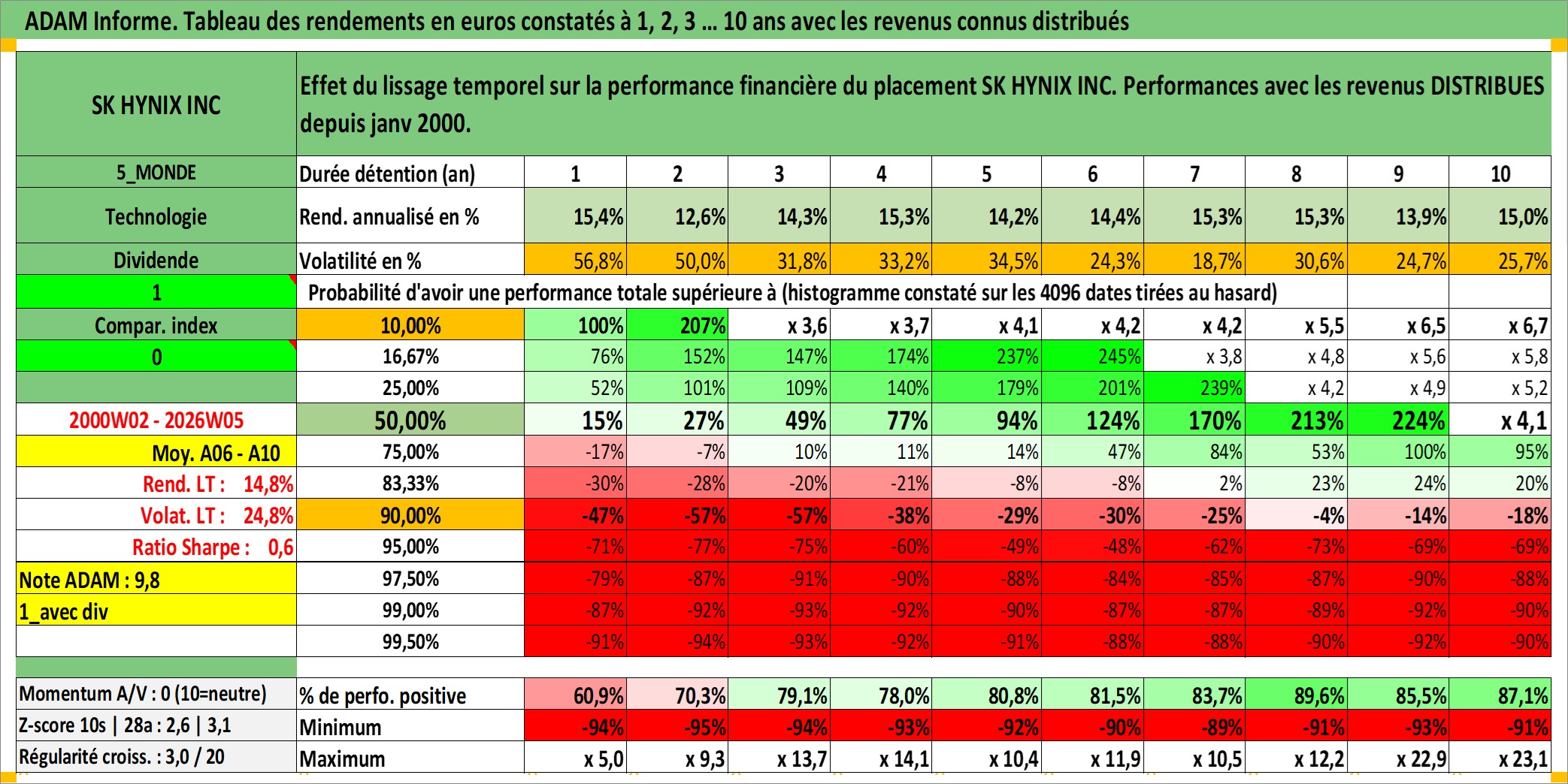 Site dédié aux investisseursPage dédiée sur site financeAnalyse des valorisations hebdomadaires de l'action SK HYNIX INC. Cet actif est cote en KRW. Les valorisations sont en contrevaleur EURO et couvrent les semaines 2000W02 a 2026W05. Les revenus de cet actif financier sont pris en compte depuis la semaine 2000W01. La note globale ESG de cet actif est estimee a 11.0 (apres rebasage entre 0 et 20).