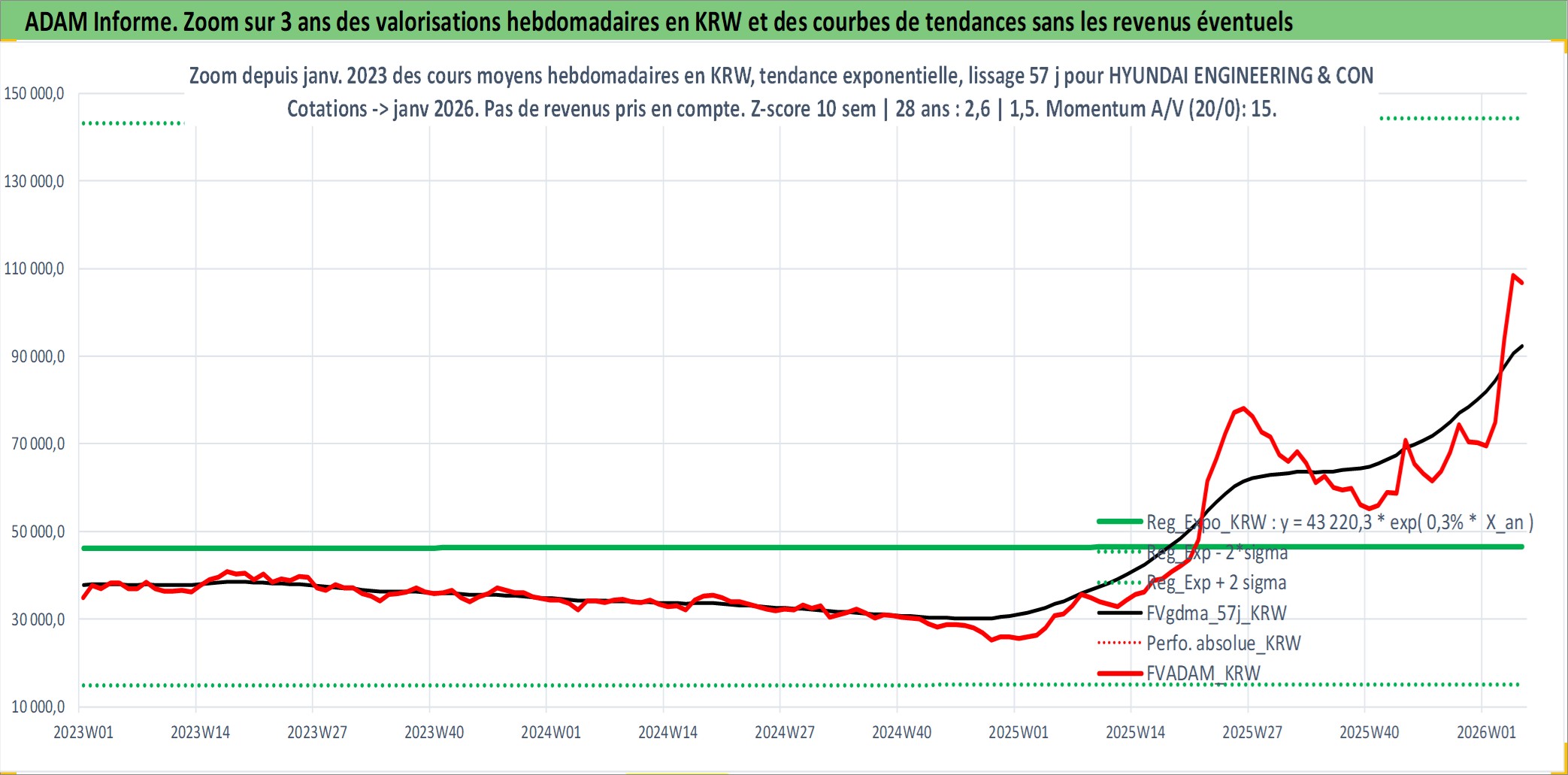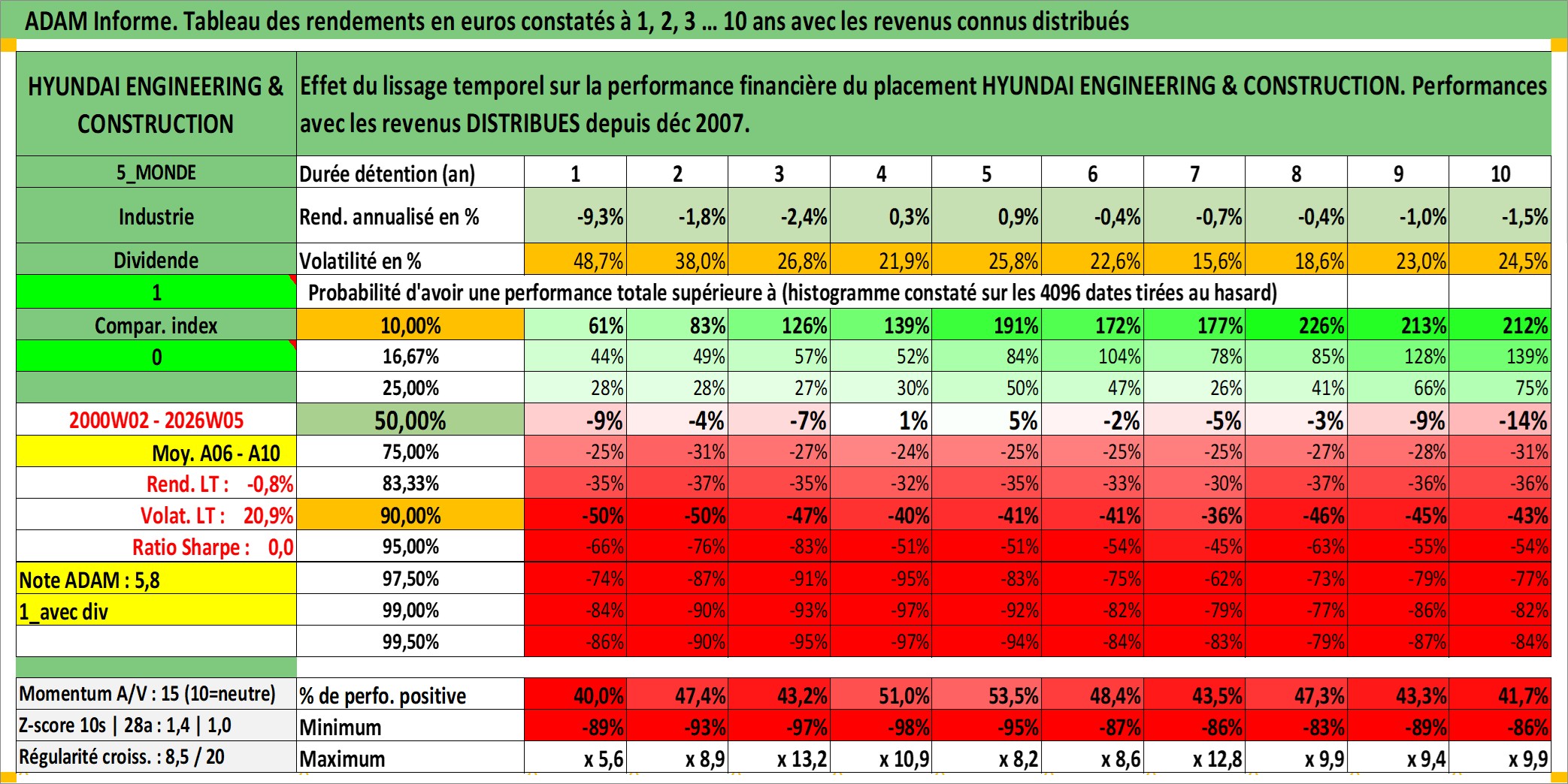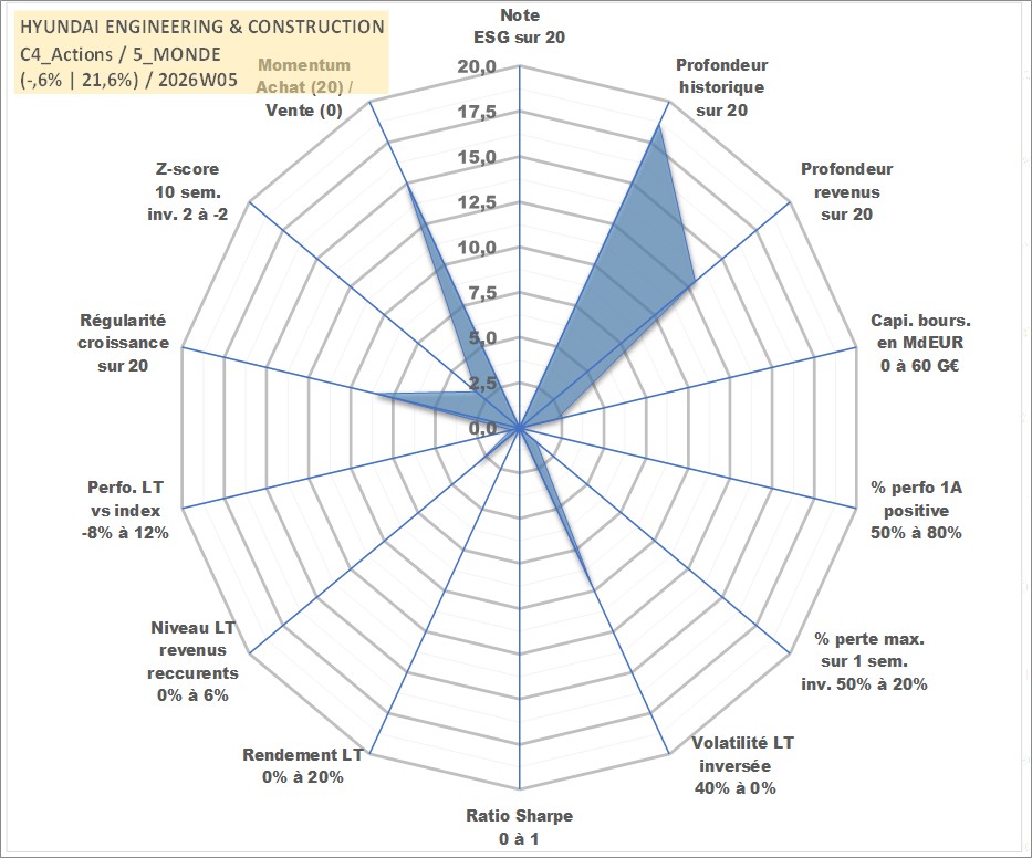 Site dédié aux investisseursPage dédiée sur site financeAnalyse des valorisations hebdomadaires de l'action HYUNDAI ENGINEERING & CONSTRUCTION. Cet actif est cote en KRW. Les valorisations sont en contrevaleur EURO et couvrent les semaines 2000W02 a 2026W05. Les revenus de cet actif financier sont pris en compte depuis la semaine 2007W52. La note ESG de cet actif n'est pas connue.