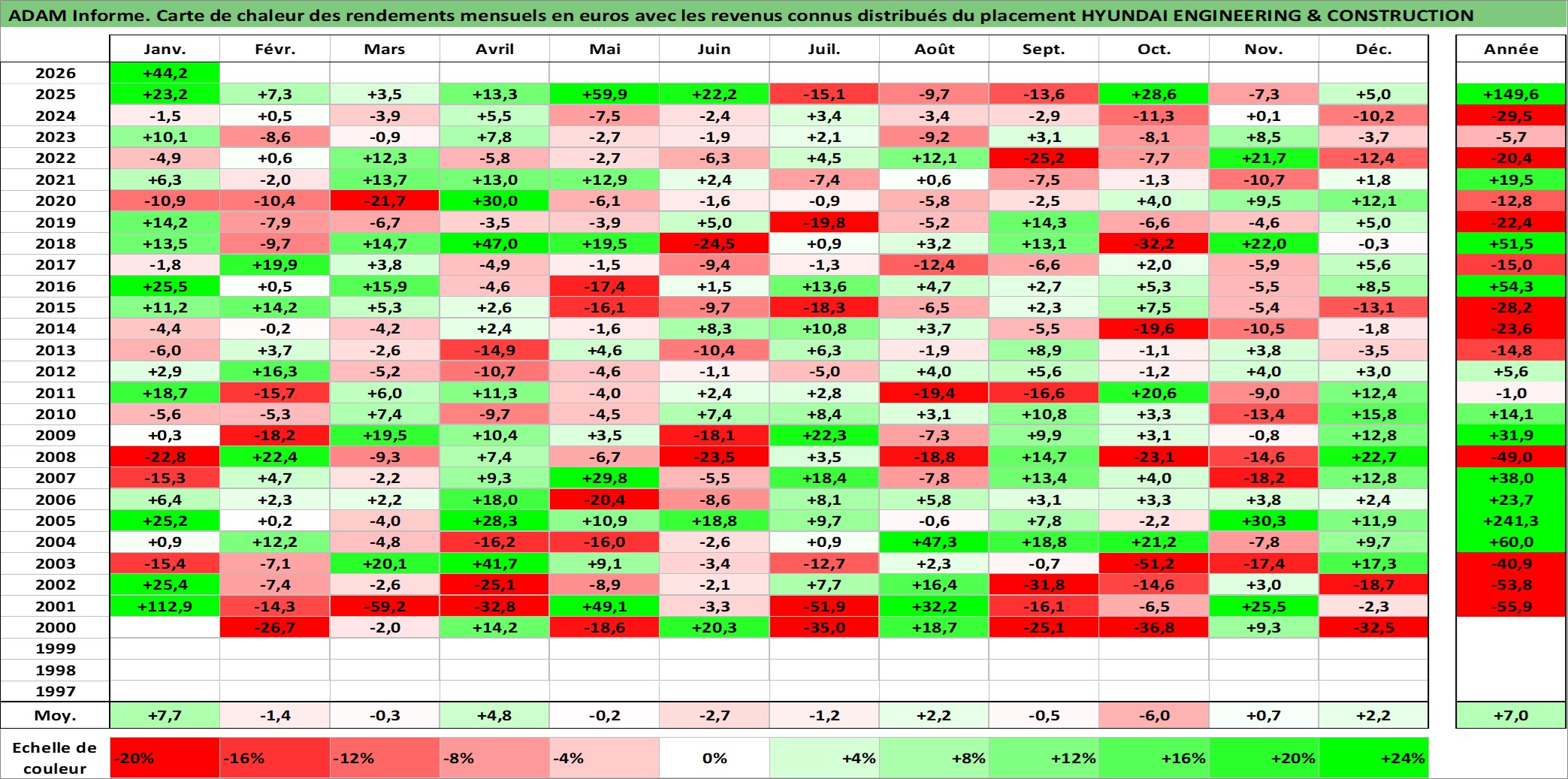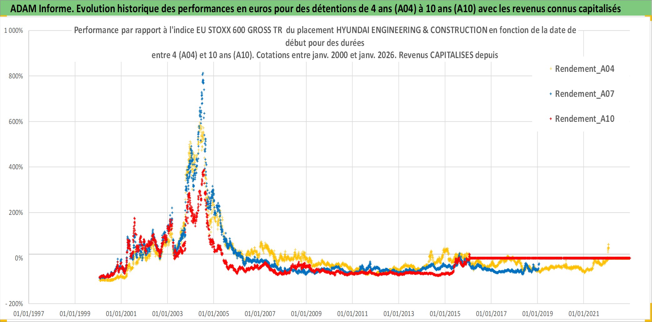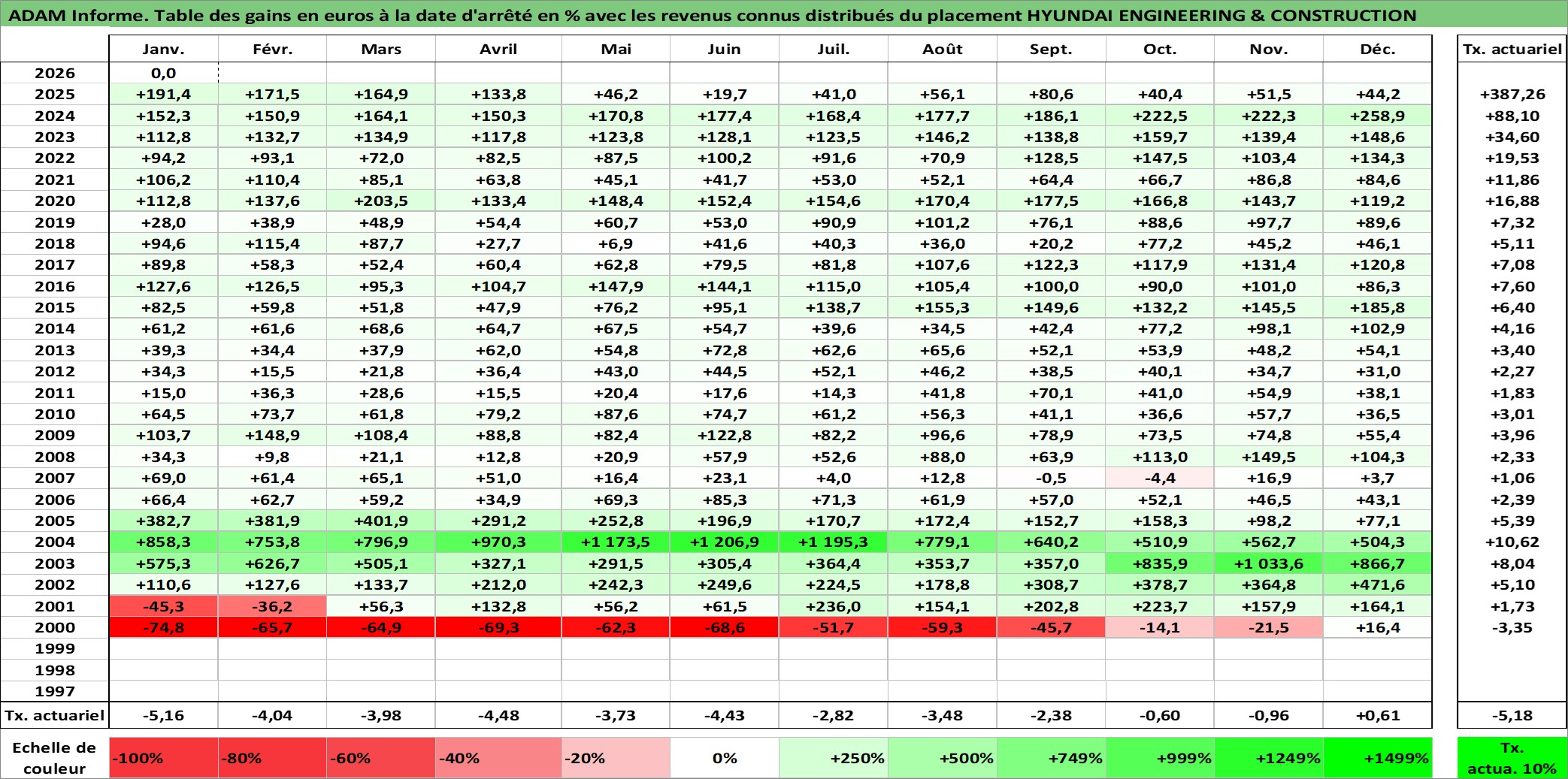 Site dédié aux investisseursPage dédiée sur site financeAnalyse des valorisations hebdomadaires de l'action HYUNDAI ENGINEERING & CONSTRUCTION. Cet actif est cote en KRW. Les valorisations sont en contrevaleur EURO et couvrent les semaines 2000W02 a 2026W05. Les revenus de cet actif financier sont pris en compte depuis la semaine 2007W52. La note ESG de cet actif n'est pas connue.