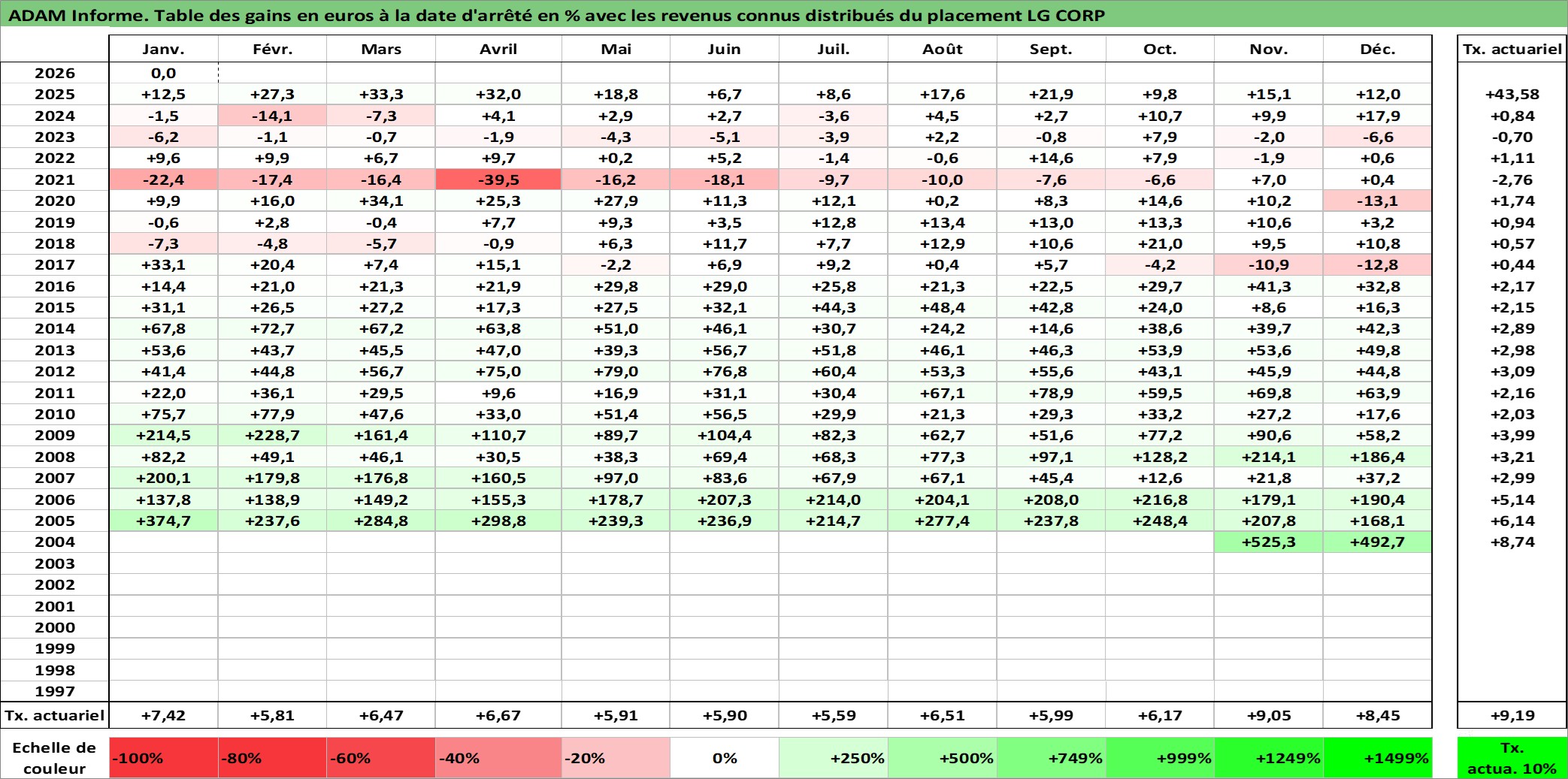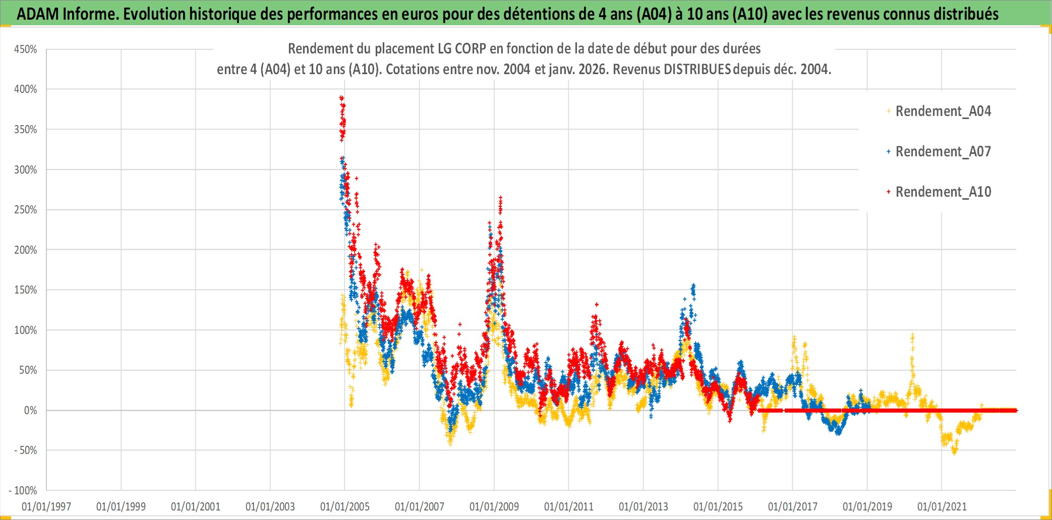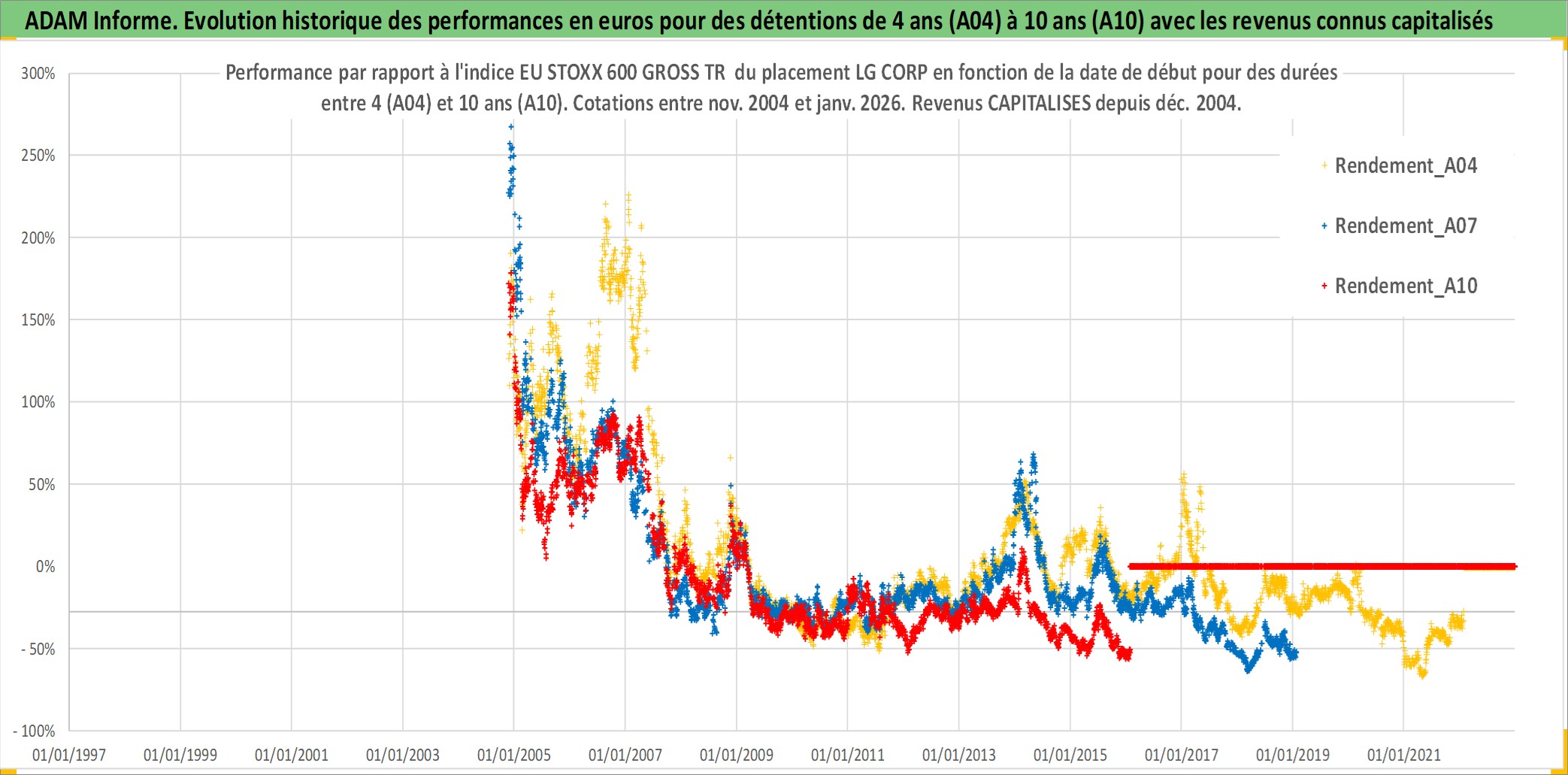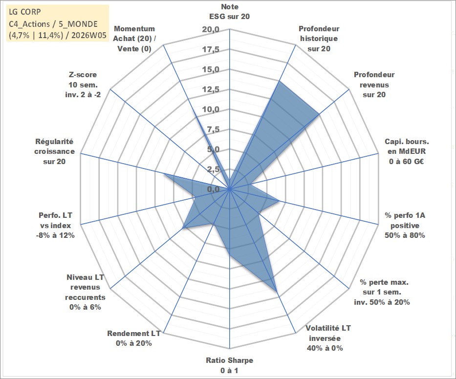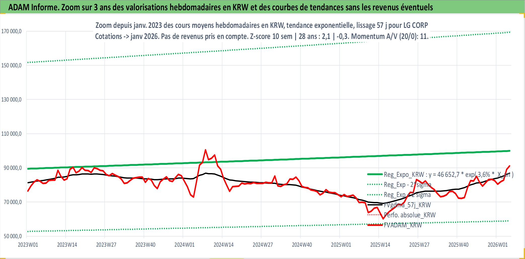 Site dédié aux investisseursPage dédiée sur site financeAnalyse des valorisations hebdomadaires de l'action LG CORP. Cet actif est cote en KRW. Les valorisations sont en contrevaleur EURO et couvrent les semaines 2004W46 a 2026W05. Les revenus de cet actif financier sont pris en compte depuis la semaine 2004W53. La note globale ESG de cet actif est estimee a 1.0 (apres rebasage entre 0 et 20).